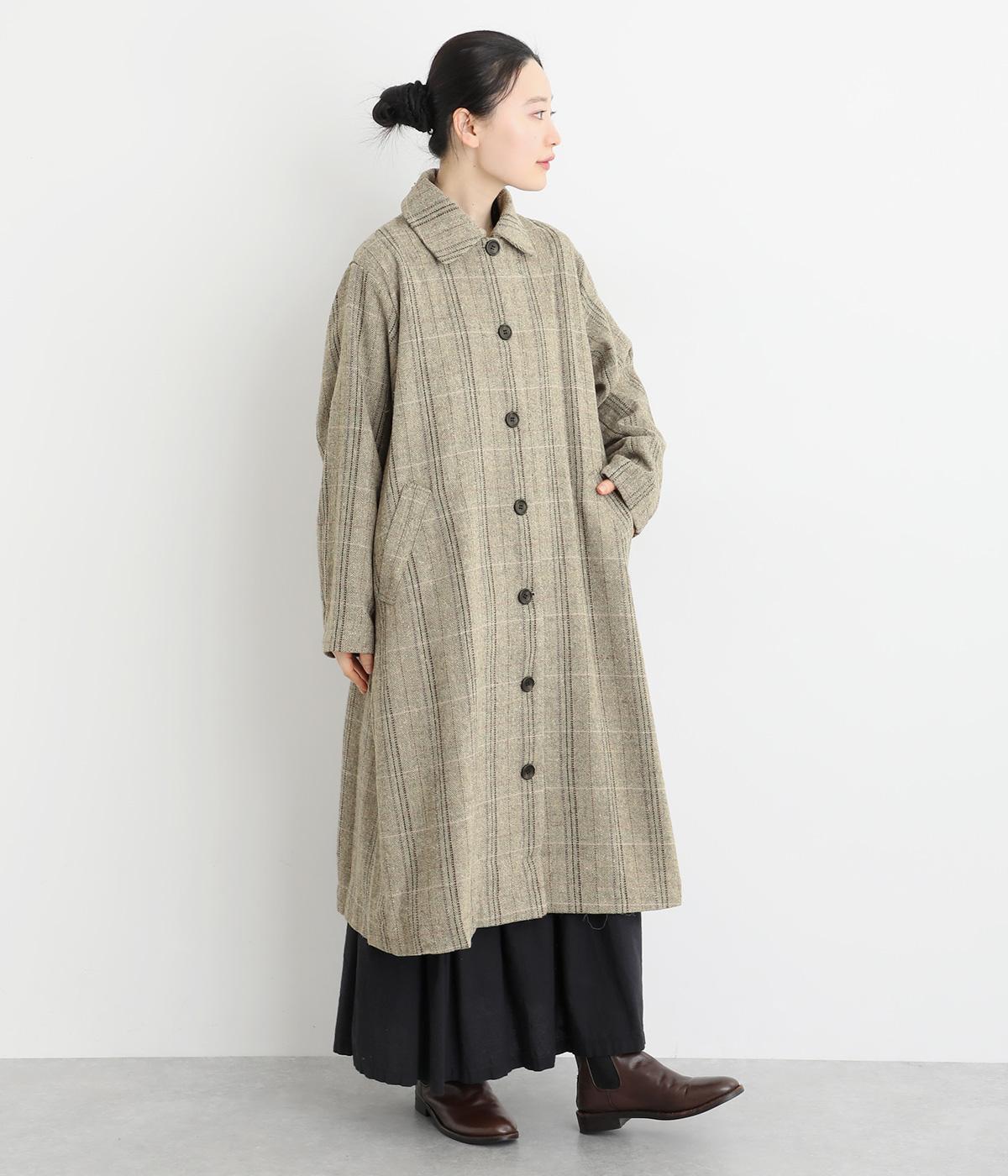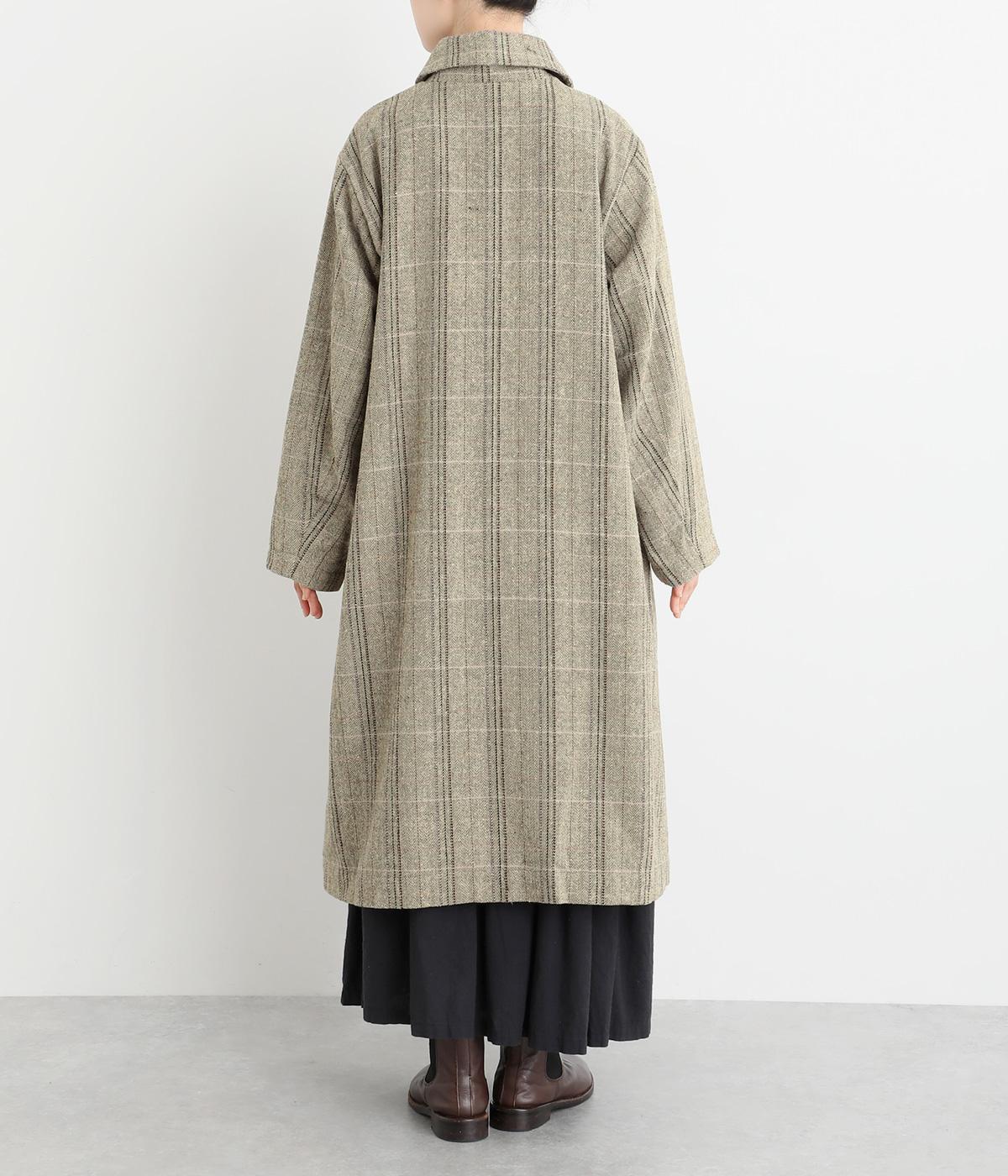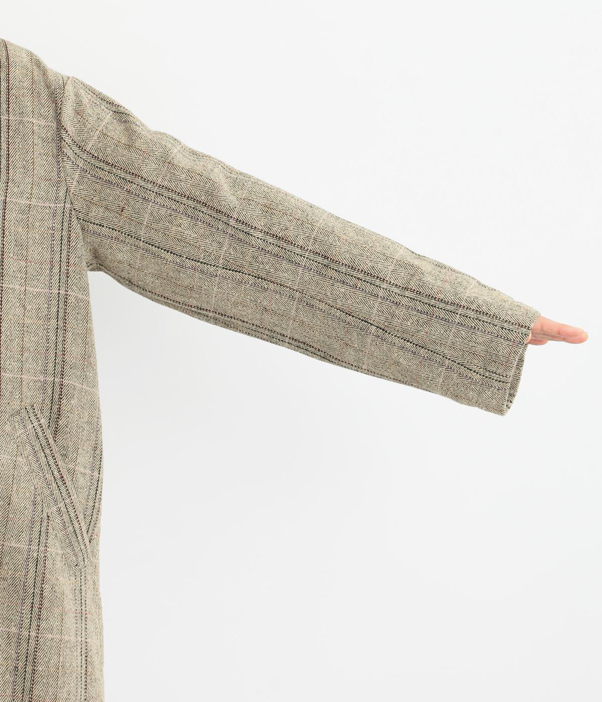 ヘリンボーンに細いラインを重ねて表現した、奥行きのあるチェック柄が魅力です。さりげない多色使いを散りばめ、クラシカルな雰囲気のなかにも遊び心を添えています。ゆったりしたシルエットが体を包み込み、重ね着の多い季節でも快適。大きめの襟や、縦のラインを強調する柄が、スタイルをすっきりと見せてくれます。