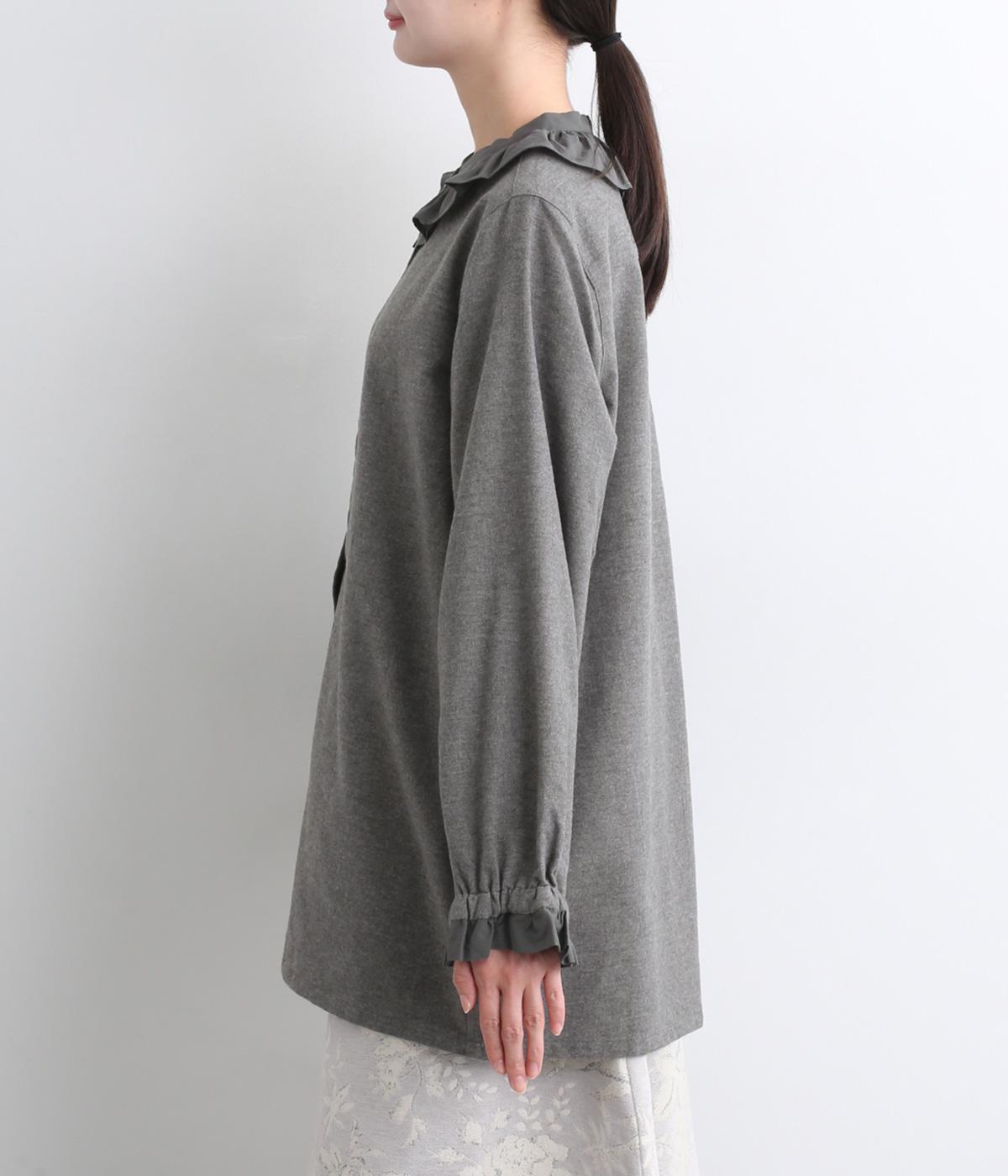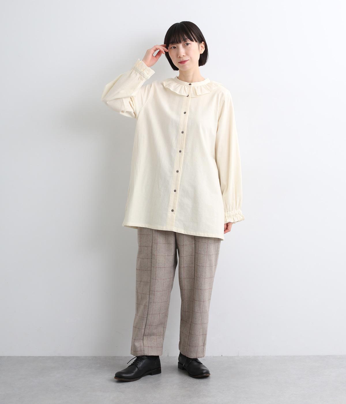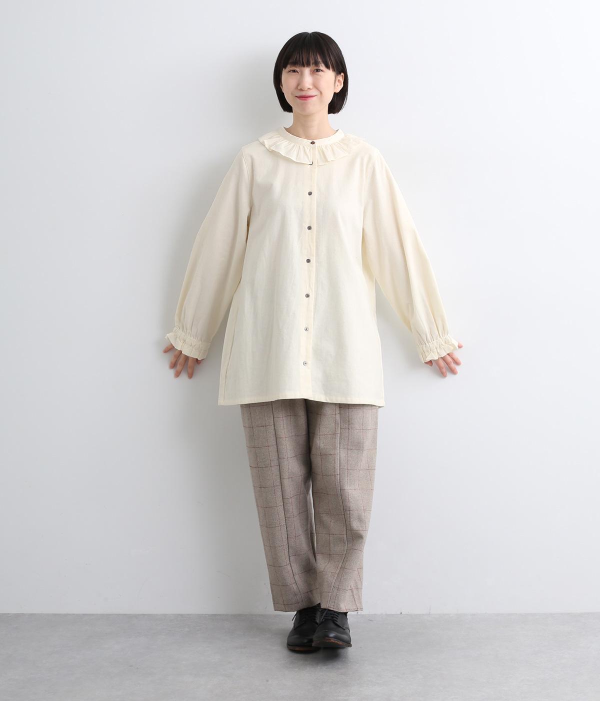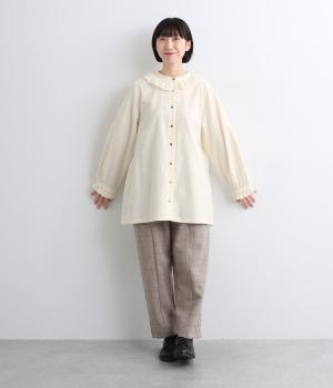 別布で仕立てたフリルを襟と袖口にあしらいニュアンスを出したブラウス。長めの丈感とゆったりした身幅が体のラインを拾いにくいのも◎。オーバーオールなどのカジュアルアイテムと合わせるスタイリングも抜け感が出ておすすめです。