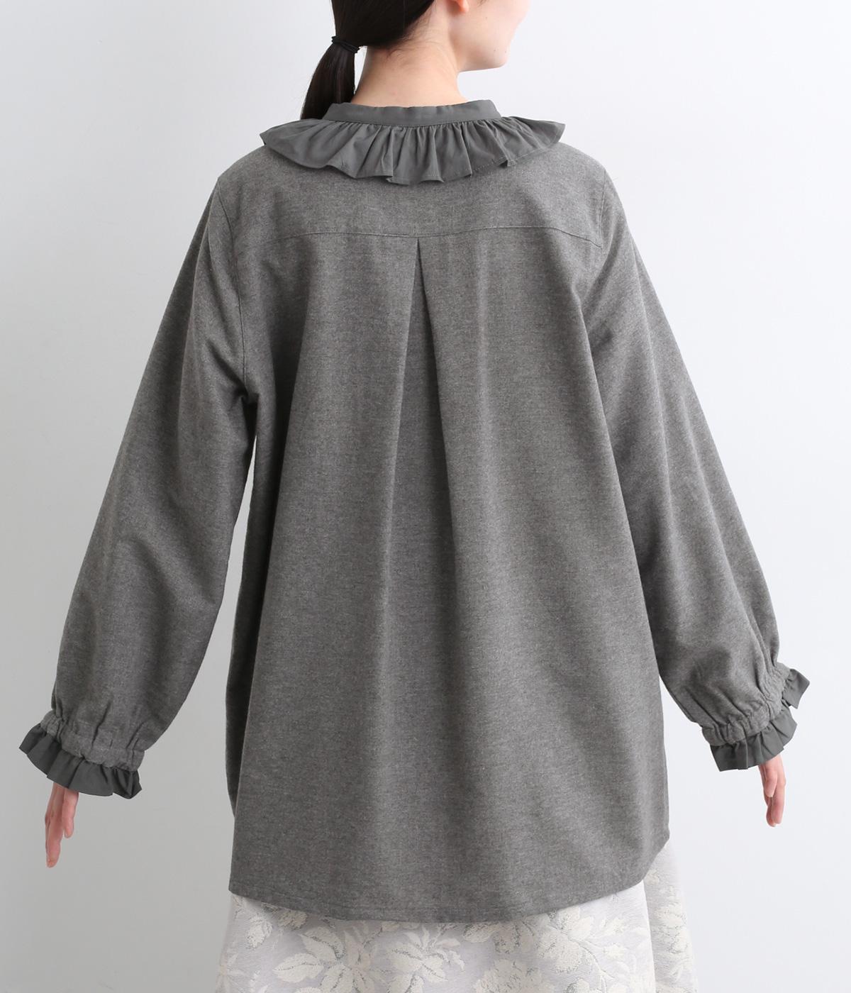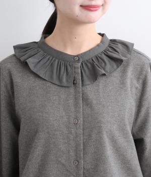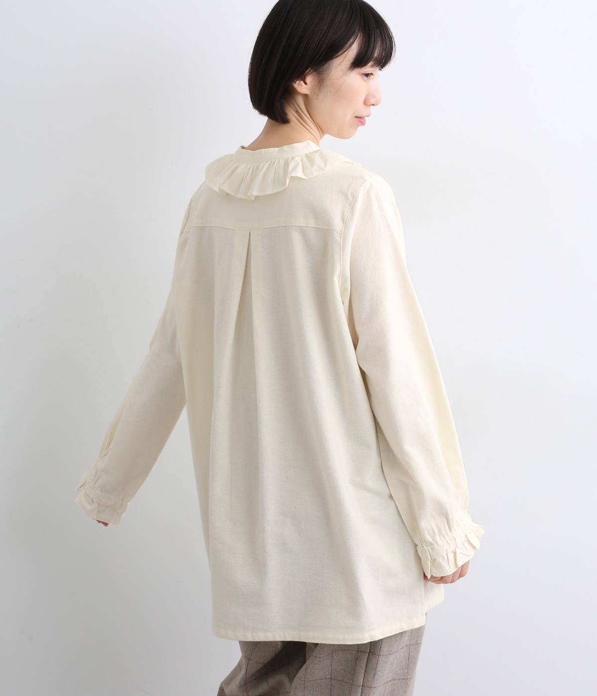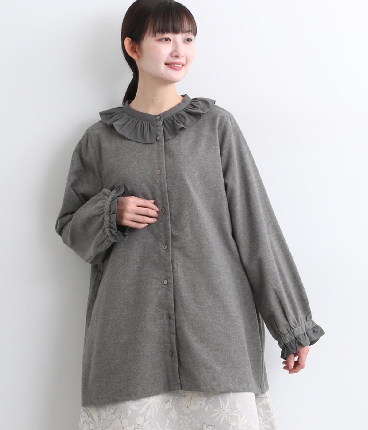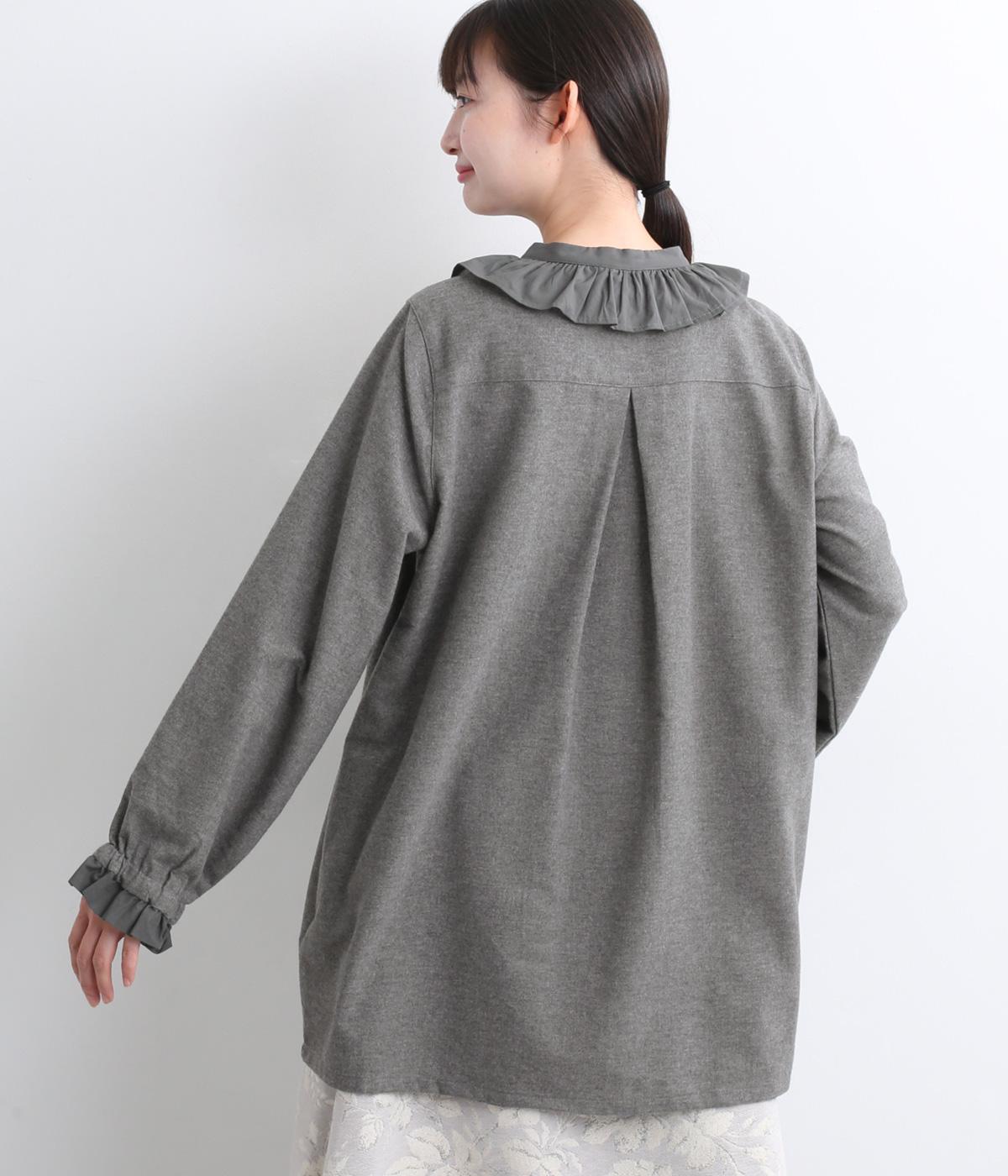 別布で仕立てたフリルを襟と袖口にあしらいニュアンスを出したブラウス。長めの丈感とゆったりした身幅が体のラインを拾いにくいのも◎。オーバーオールなどのカジュアルアイテムと合わせるスタイリングも抜け感が出ておすすめです。