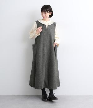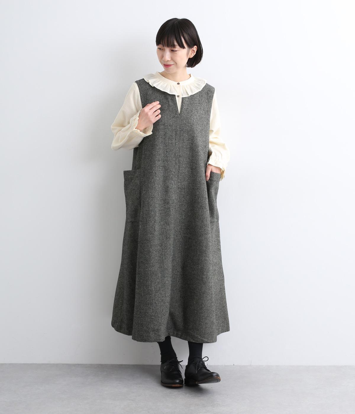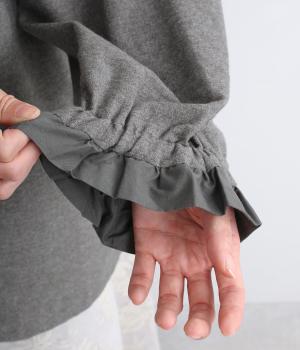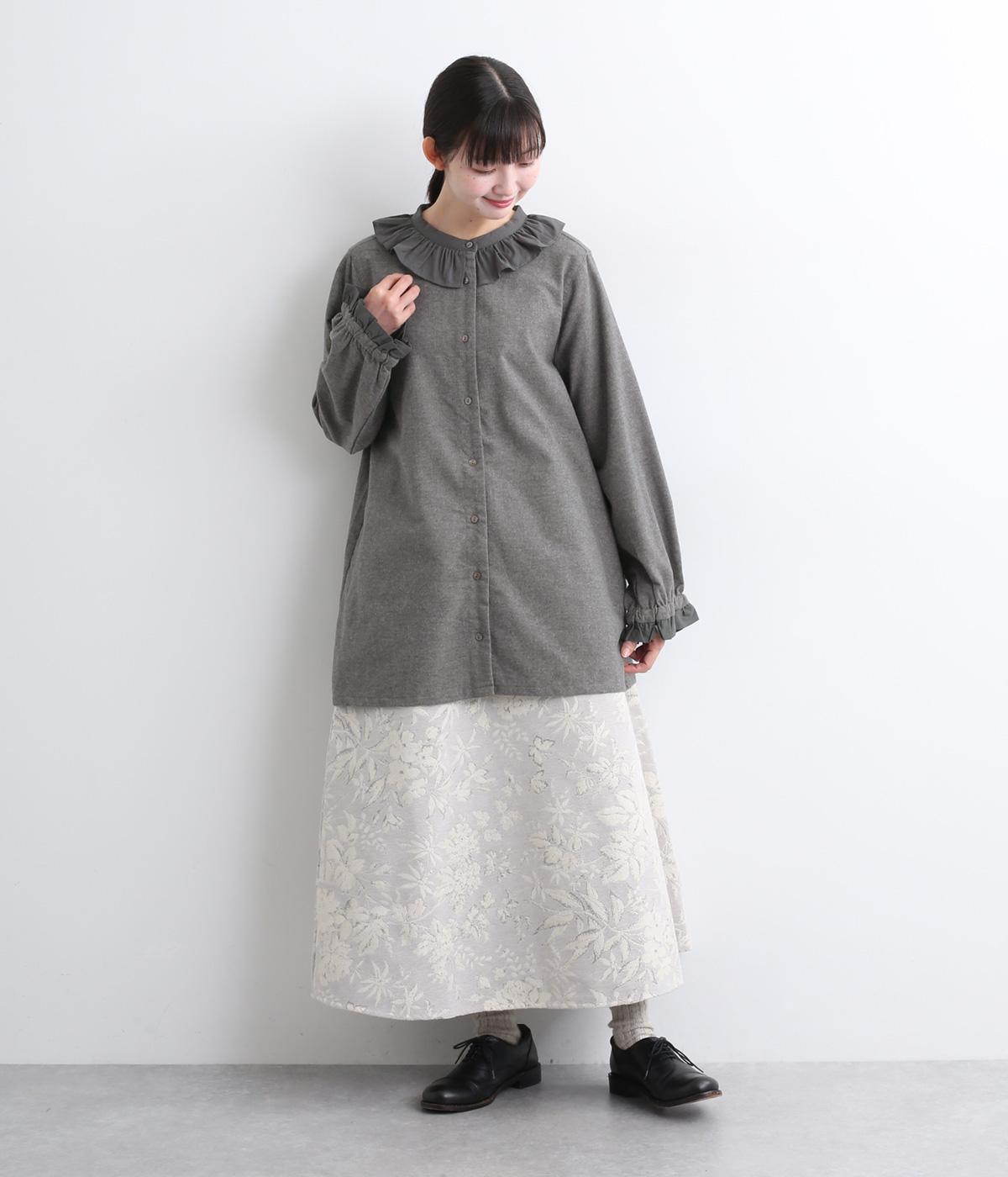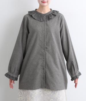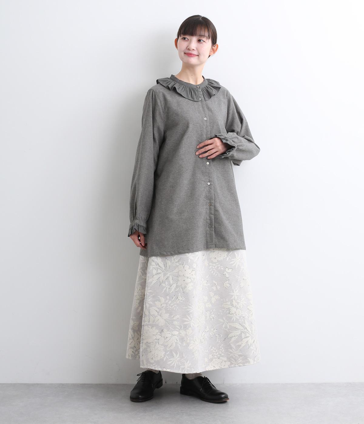 別布で仕立てたフリルを襟と袖口にあしらいニュアンスを出したブラウス。長めの丈感とゆったりした身幅が体のラインを拾いにくいのも◎。オーバーオールなどのカジュアルアイテムと合わせるスタイリングも抜け感が出ておすすめです。
