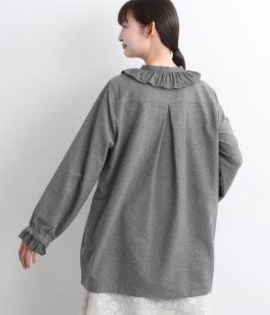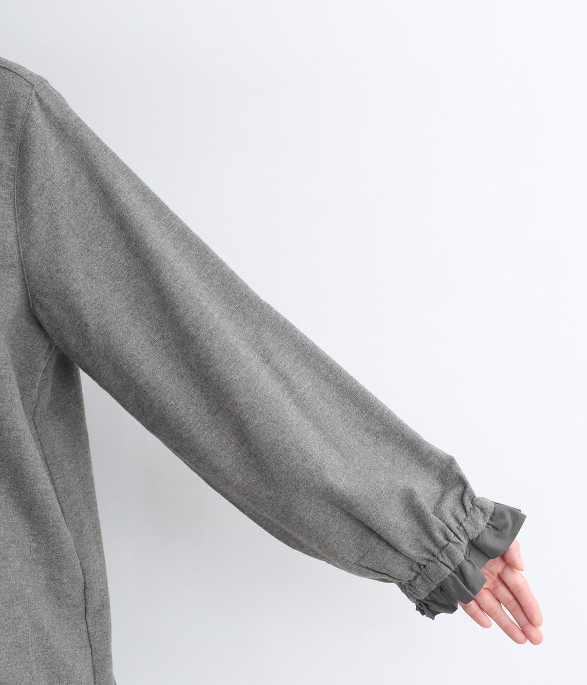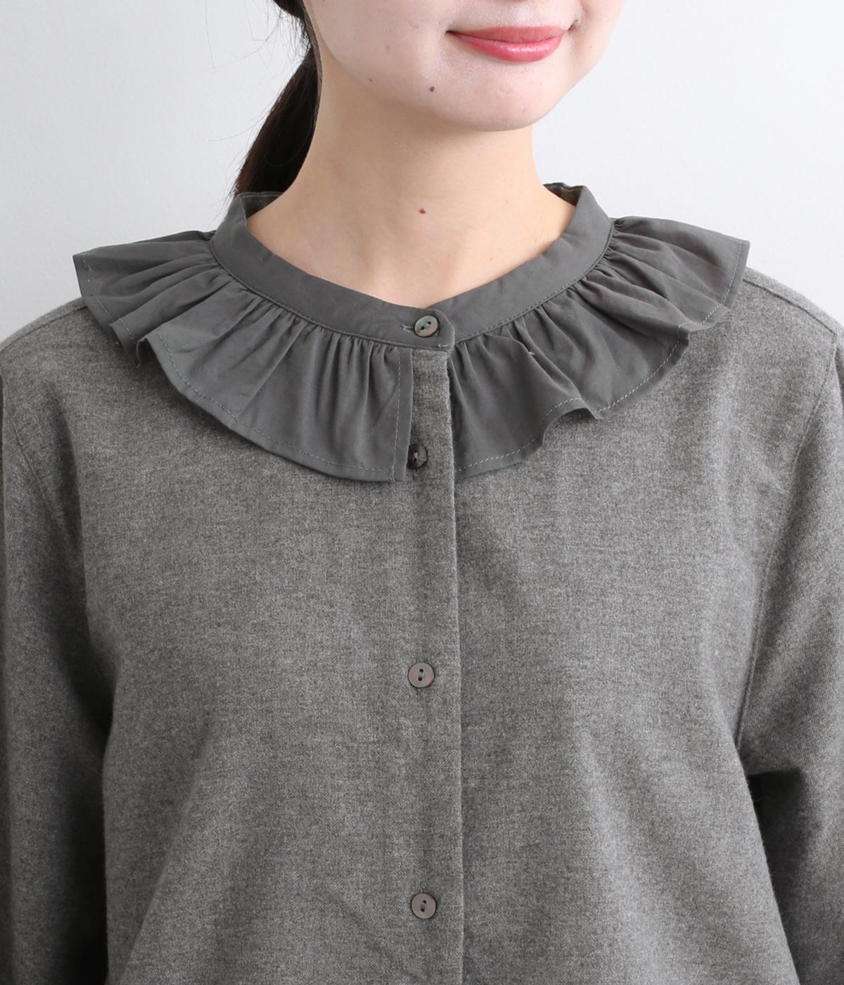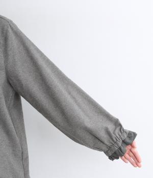 しなやかなハリのコットン平織生地に微起毛加工してあたたかみを加えました。肌にやさしく着るほどになじみます。襟と袖にはさらりとした別布を合わせてメリハリのある表情に仕上げました。