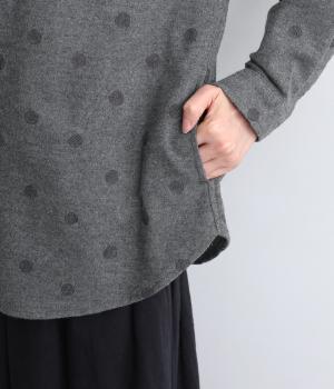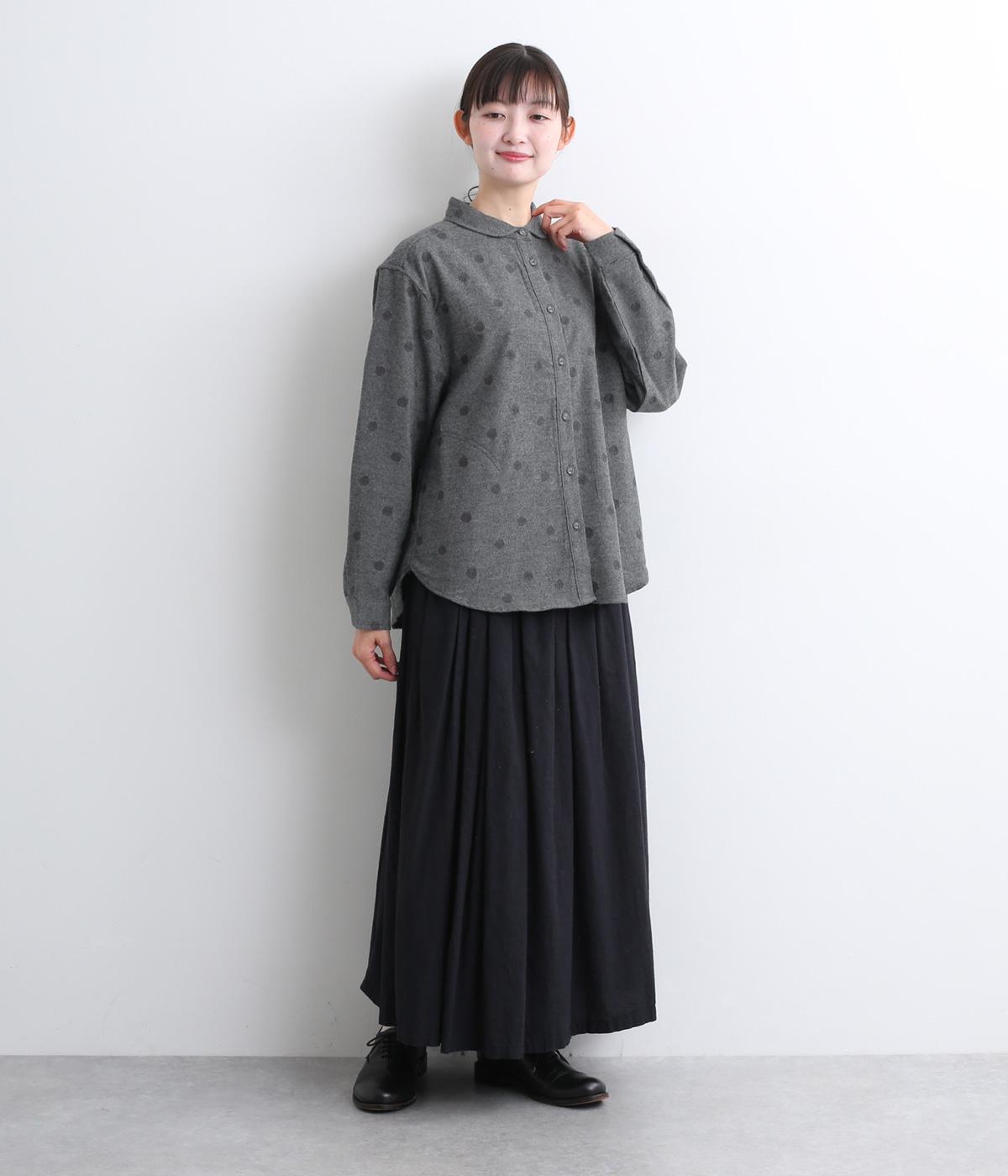 肌にやさしく着るほどになじむコットン生地を使用しました。ドットの総柄は刺しゅうであしらっています。天然素材ならではのやさしい風合いが魅力です。