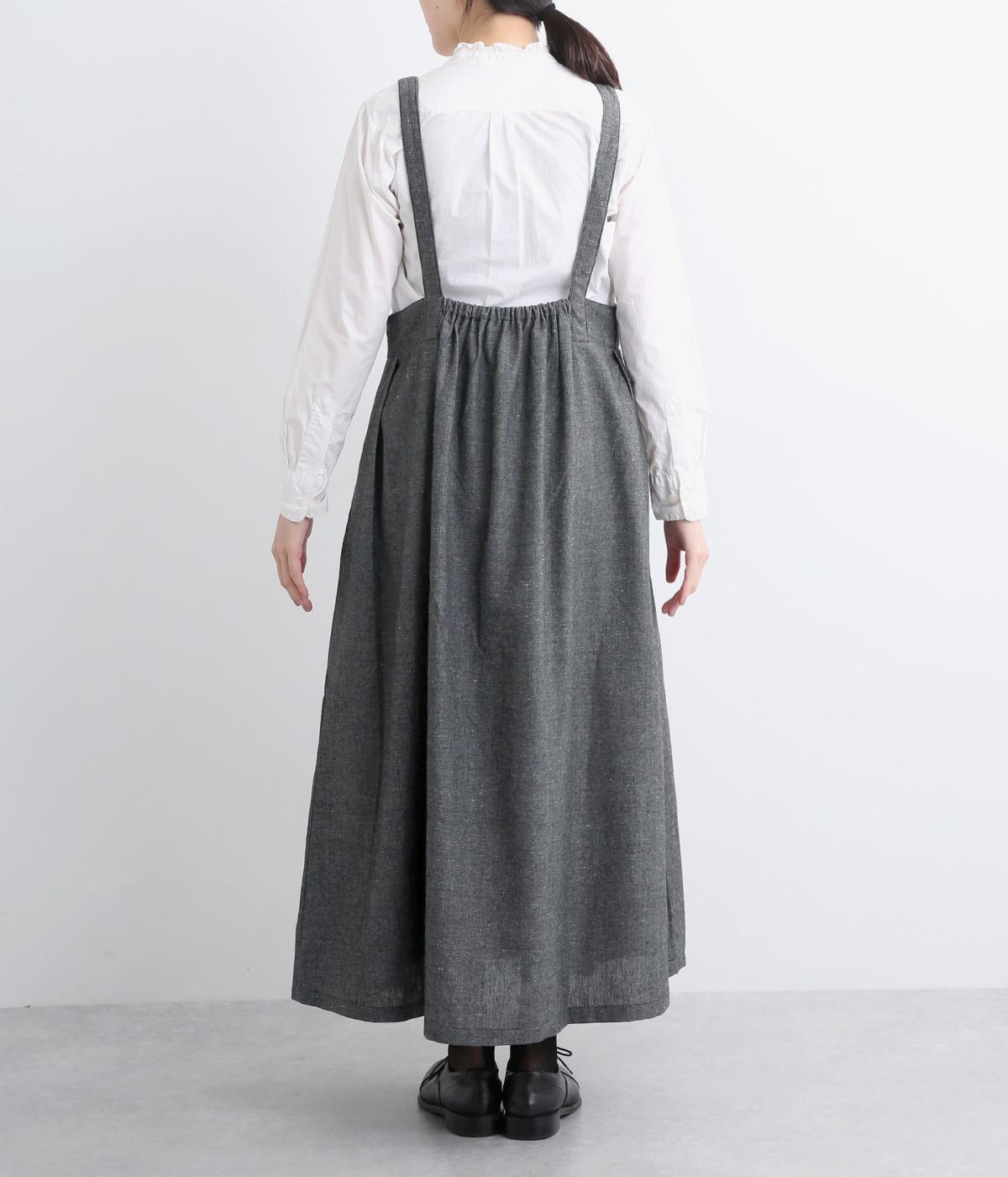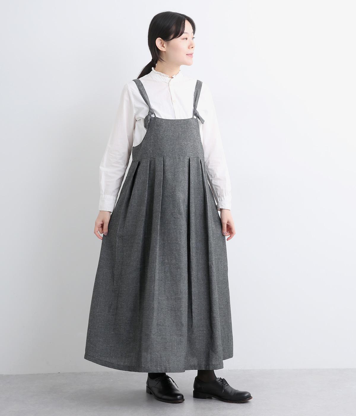 ハイウエストで切り替えがあり、落ち感のあるジャンパースカートです。肩紐は調節可能で、結び目がさりげないアクセントに。バックル部分も同素材の布で仕上げており、あたりがやわらかくストレスのない着心地を叶えます。