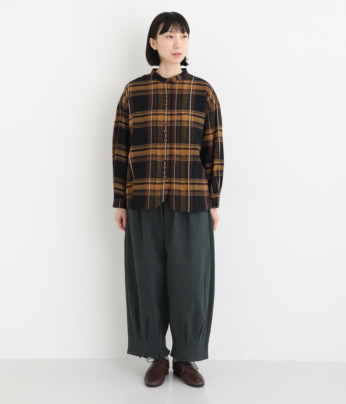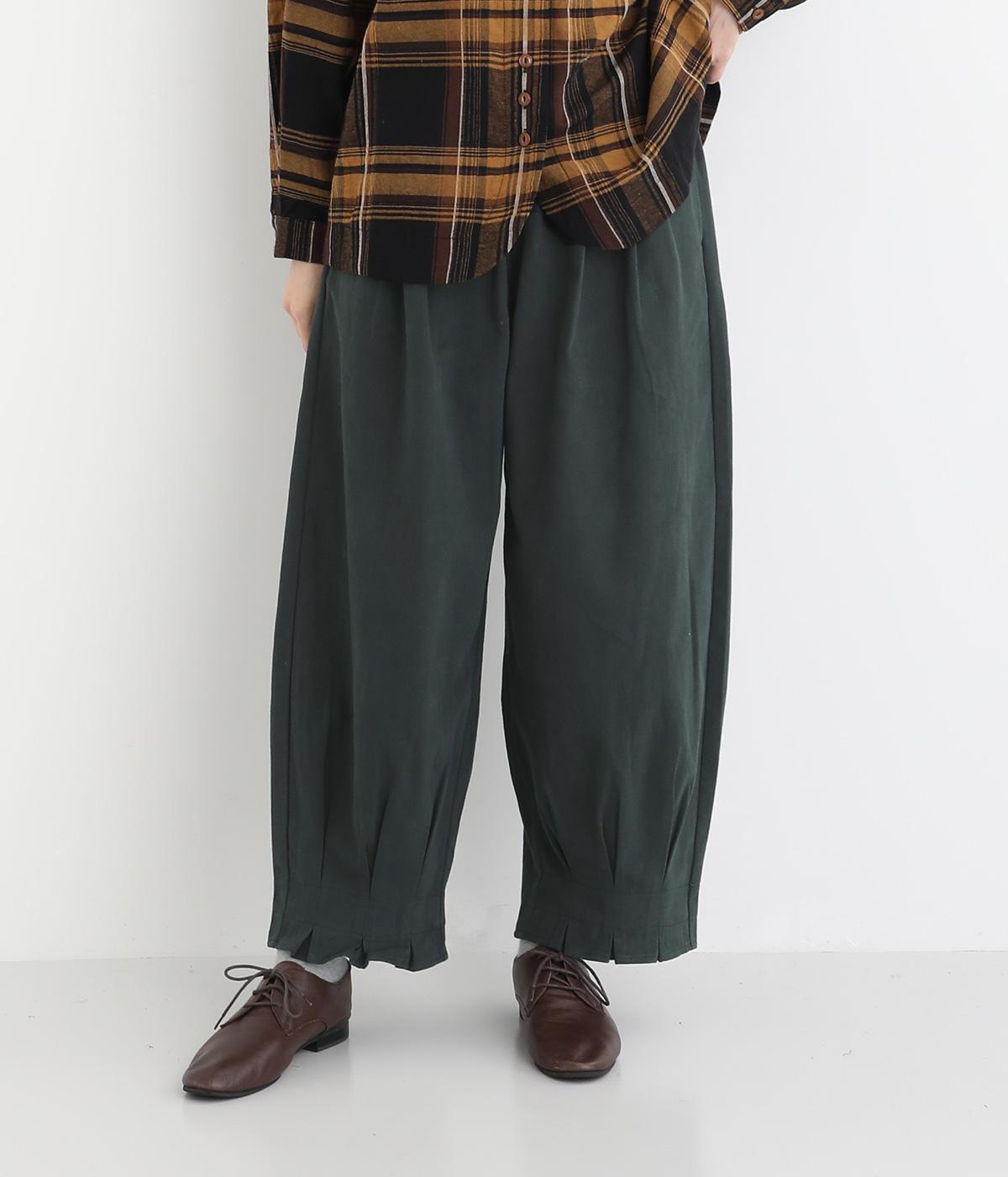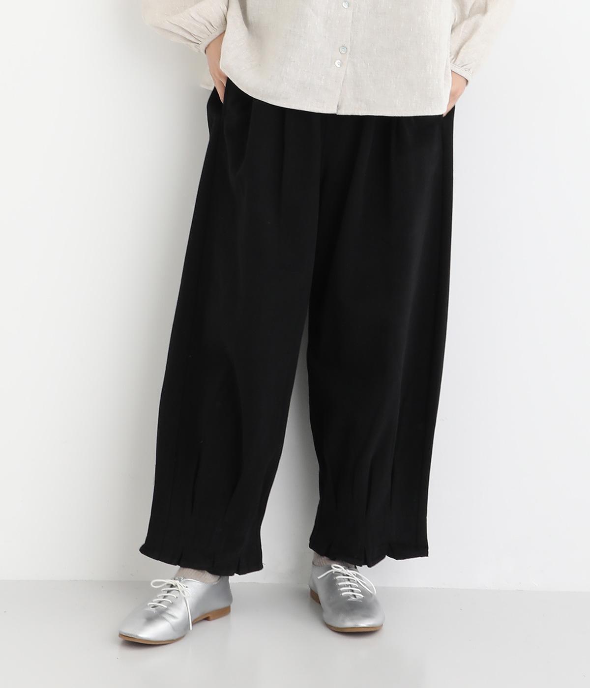 タックをほどこした裾のデザインがほどよい個性を感じさせるパンツ。全体にゆとりを持たせた、体のラインを拾わない立体感のあるシルエットが魅力です。総ゴム仕様のウエストにはフィット感を高める紐をプラスしています。