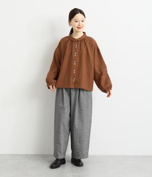 大人のナチュラルスタイルにぴったりなリネンブラウス。首元にやさしく添わせた小さめの襟と随所に施したギャザーが愛らしいムードを運びます。2つずつリズムよく並べたフロントボタンもアクセントに。前後差をつけたラウンドヘムが着こなしを整え、スカートにもパンツにも好相性です。
