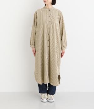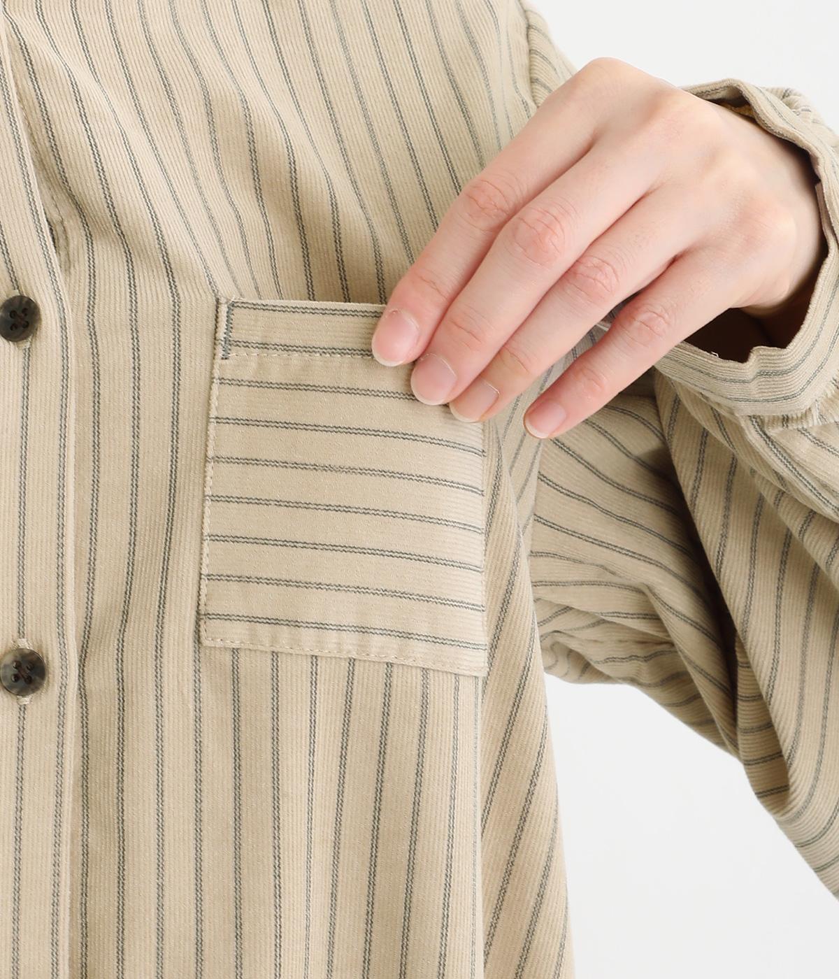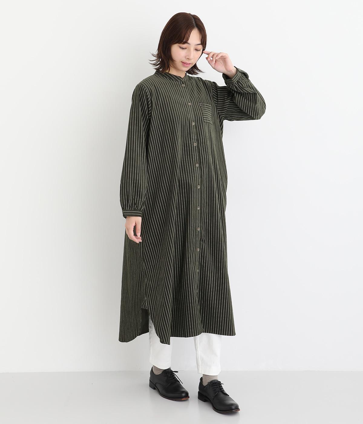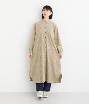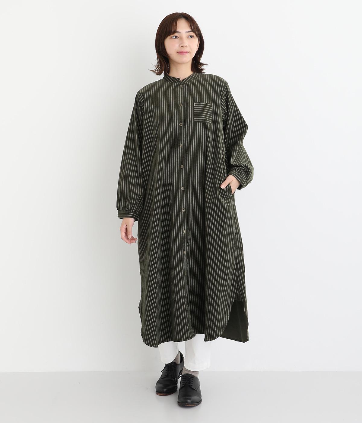 コーデュロイ生地にストライプ柄をのせた大人カジュアルなワンピース。身幅にゆとりを持たせつつも、落ち感のある生地がボリュームをおさえてすっきり見えを叶えます。柄の向きを変えた胸ポケットがアクセントに。丸みを帯びた裾ラインが両サイドに抜け感を与え、パンツとのレイヤードもサマ見えします。