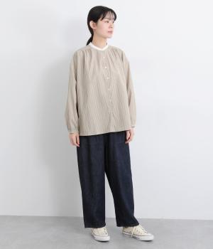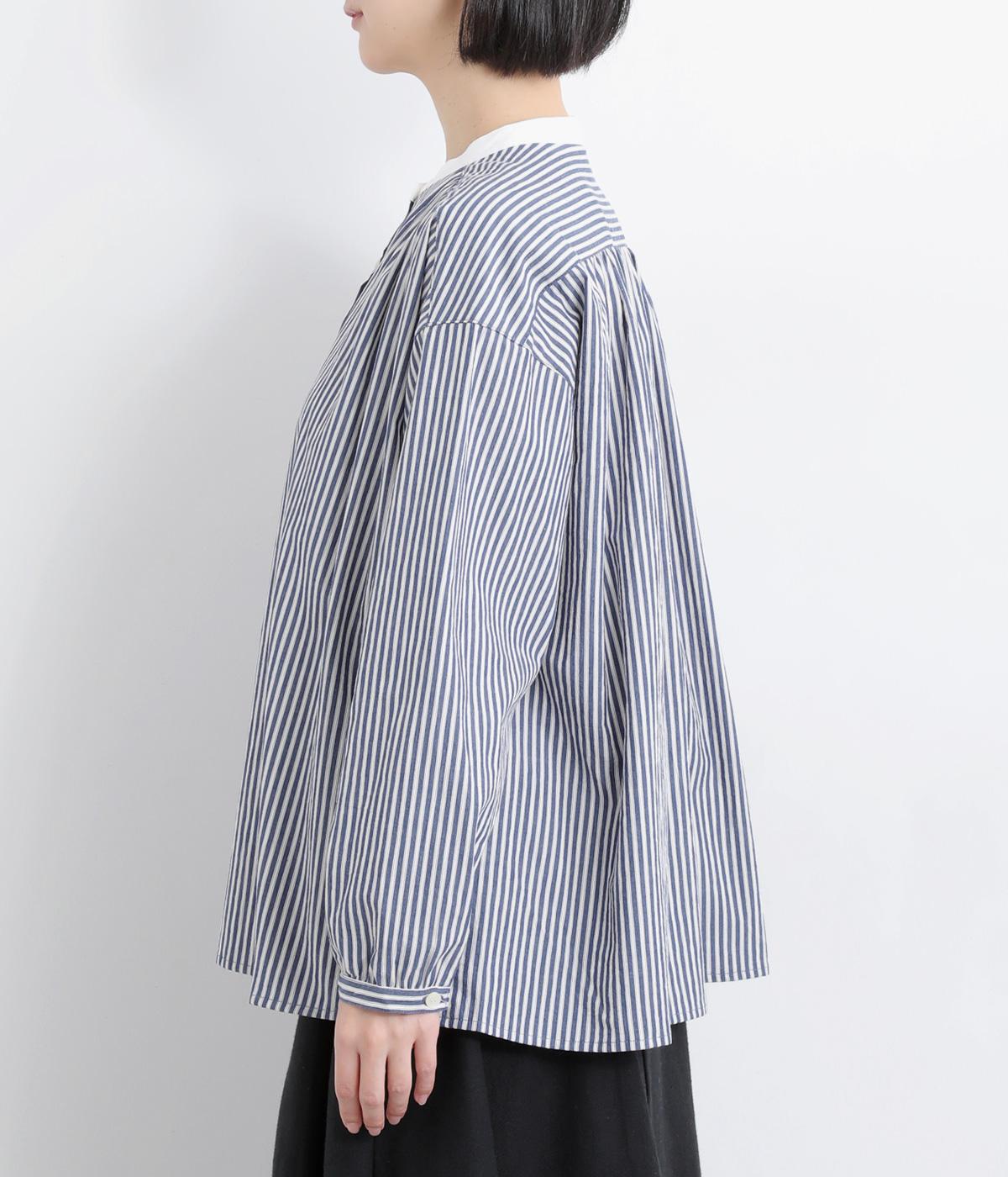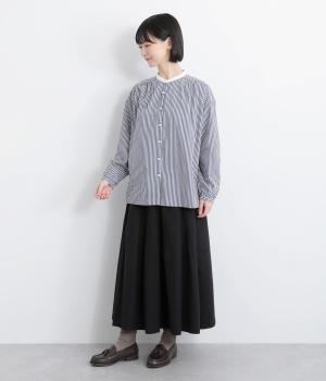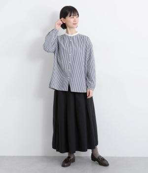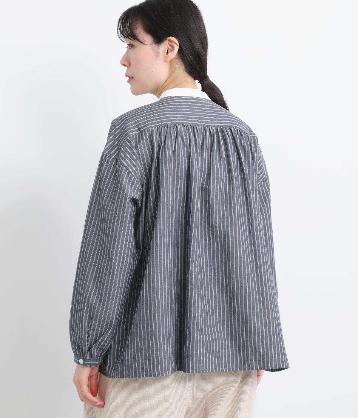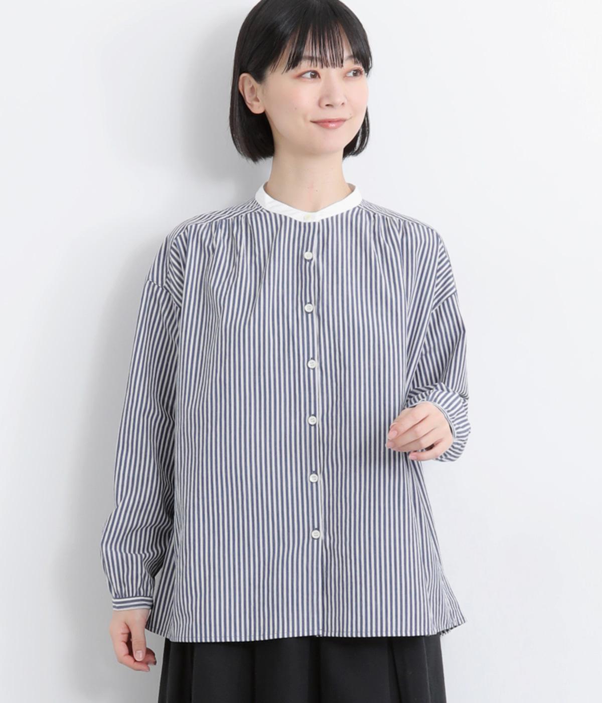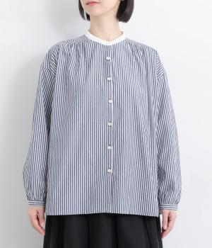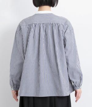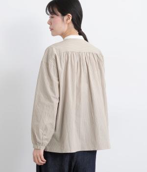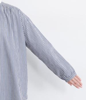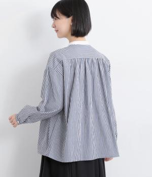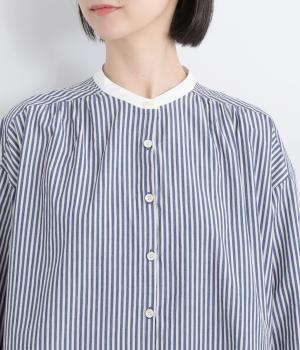 ストライプ生地にクレリックカラーを合わせ、清潔感と上品さを兼ね備えたデザインです。肩と背中に細かなギャザーを寄せることで、ほどよい立体感とやわらかな雰囲気をプラスしました。ゆったりとしたシルエットで体のラインを拾わず、ナチュラルながらもきちんと感のある一枚です。