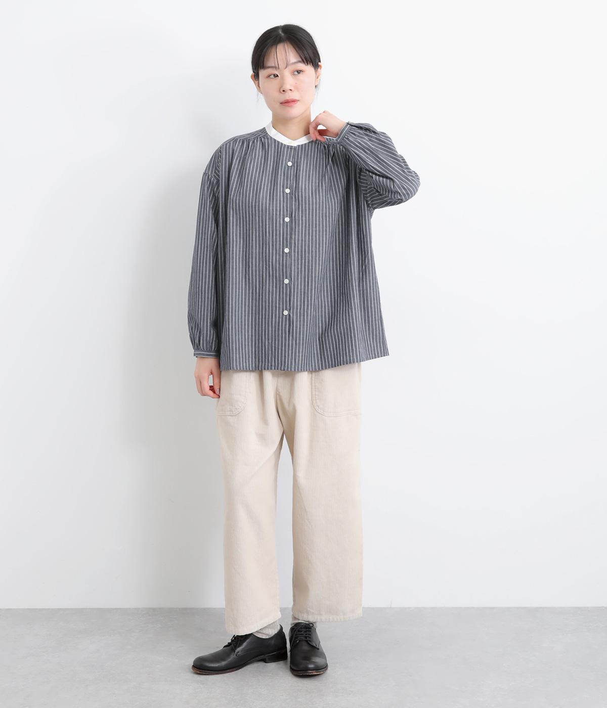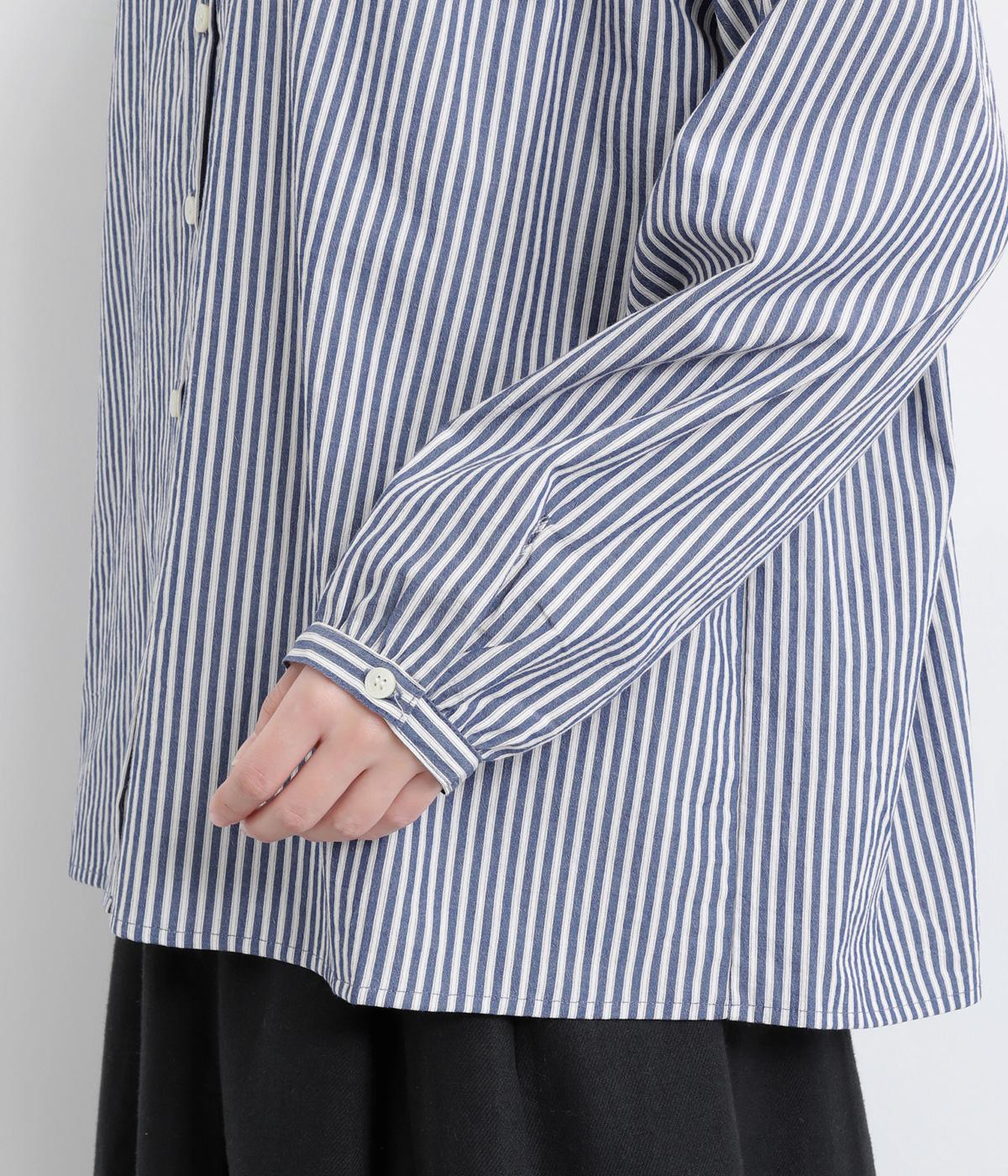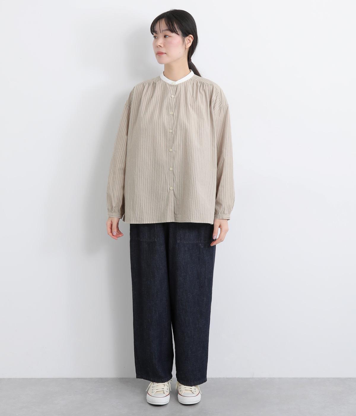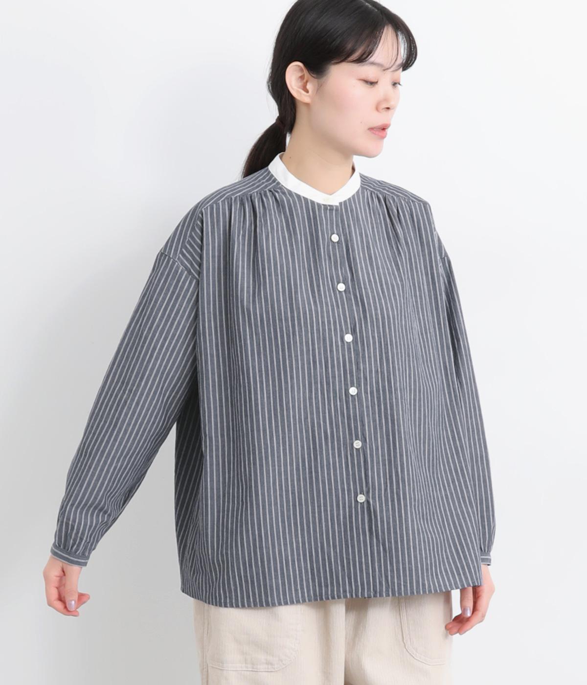ストライプ生地にクレリックカラーを合わせ、清潔感と上品さを兼ね備えたデザインです。肩と背中に細かなギャザーを寄せることで、ほどよい立体感とやわらかな雰囲気をプラスしました。ゆったりとしたシルエットで体のラインを拾わず、ナチュラルながらもきちんと感のある一枚です。