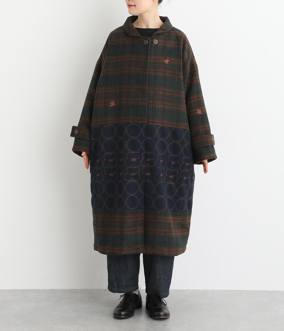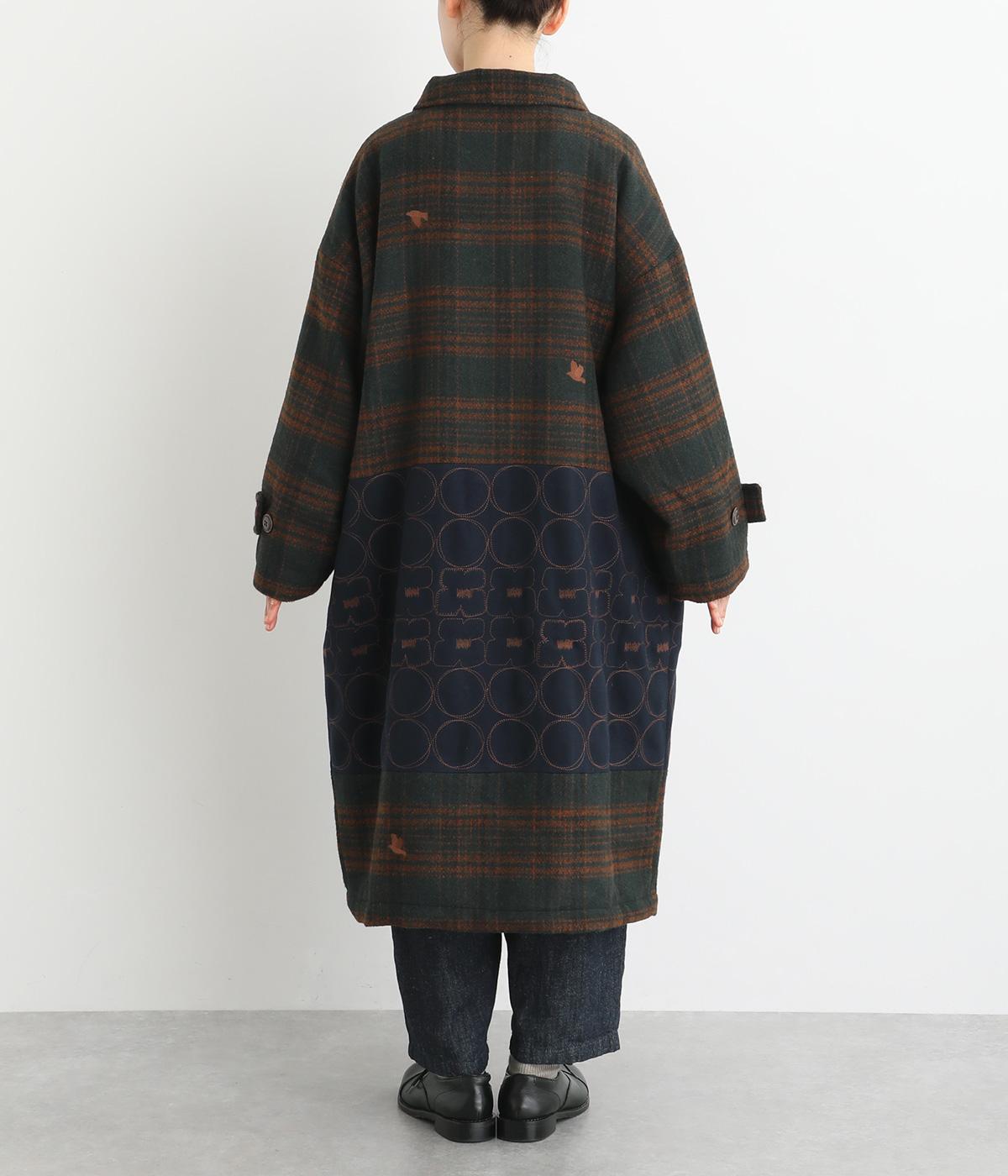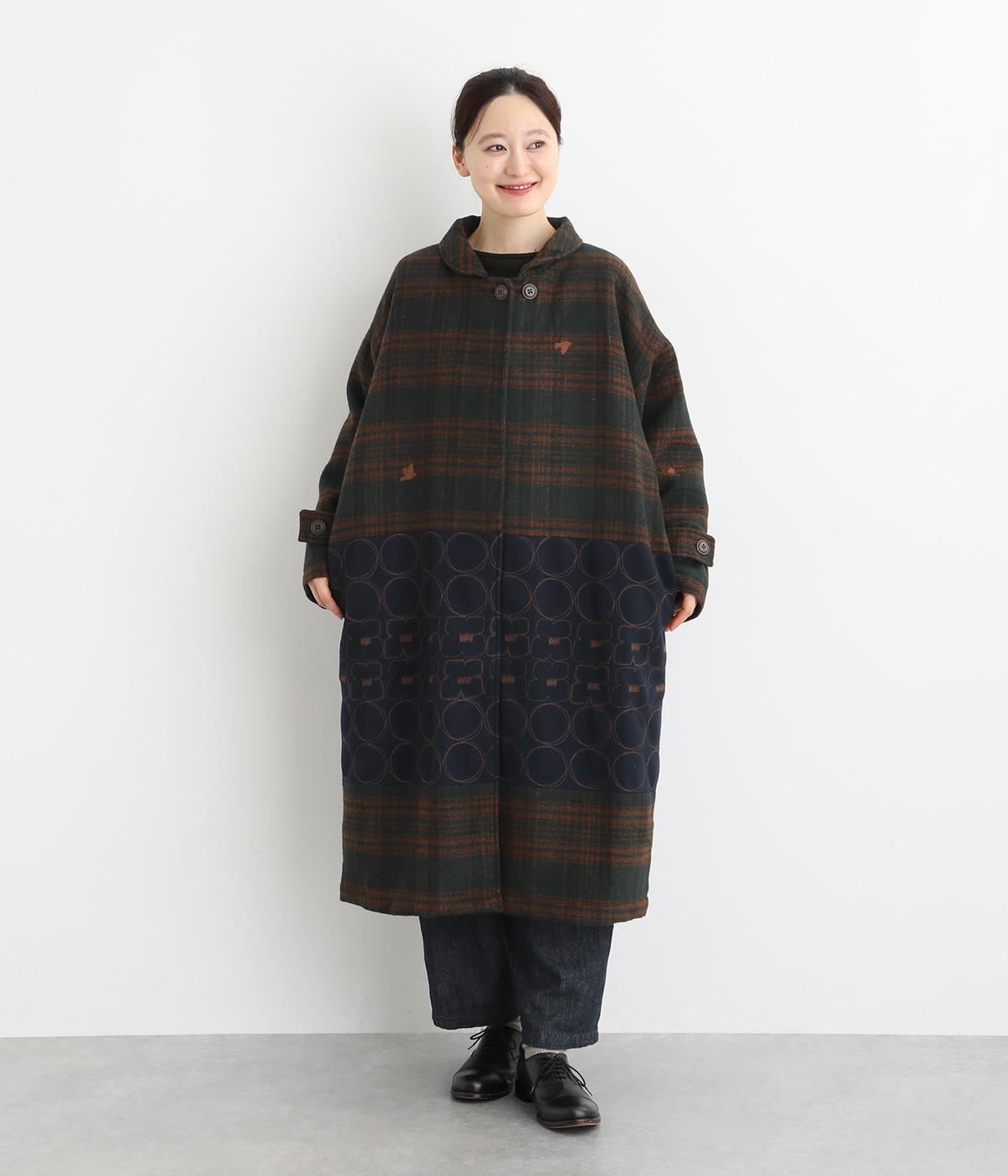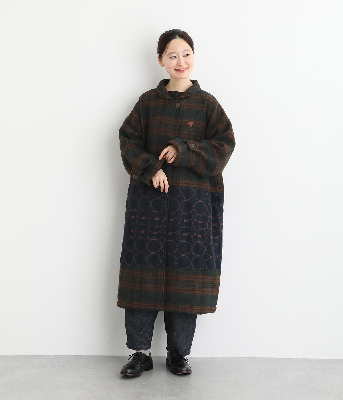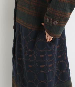 チェック柄と、リングと花の北欧風刺しゅうを絶妙なバランスで組み合わせたロングコート。身頃や袖にもところどころ鳥の刺しゅうをあしらいました。個性的な柄の組み合わせながらシックな雰囲気を叶え、ゆったりした身頃がカジュアル感を演出します。