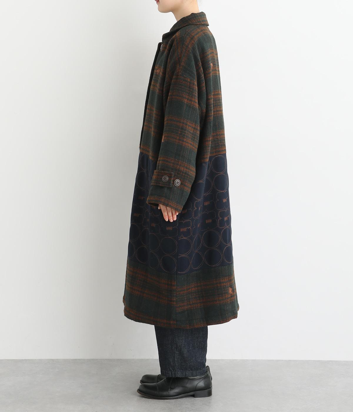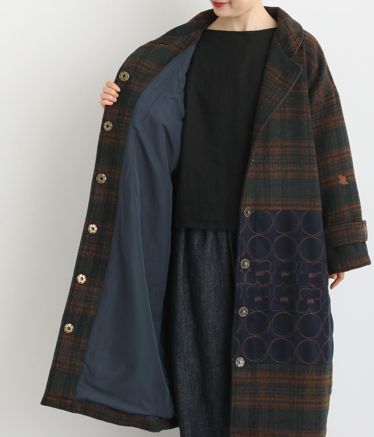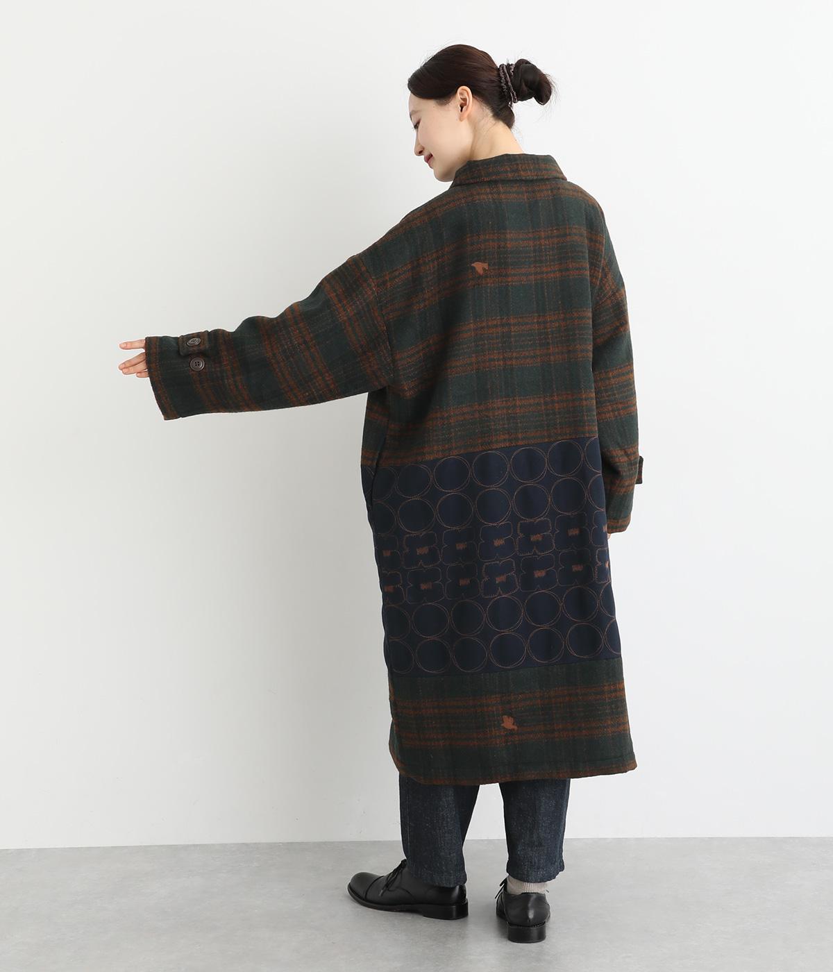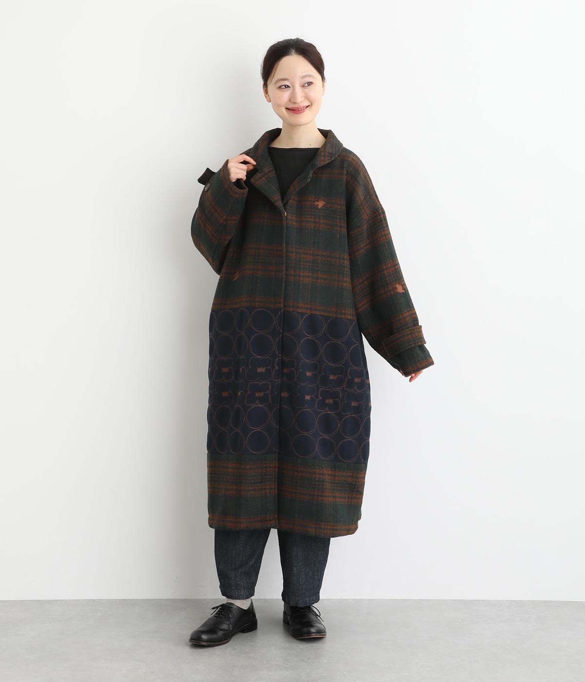 チェック柄と、リングと花の北欧風刺しゅうを絶妙なバランスで組み合わせたロングコート。身頃や袖にもところどころ鳥の刺しゅうをあしらいました。個性的な柄の組み合わせながらシックな雰囲気を叶え、ゆったりした身頃がカジュアル感を演出します。