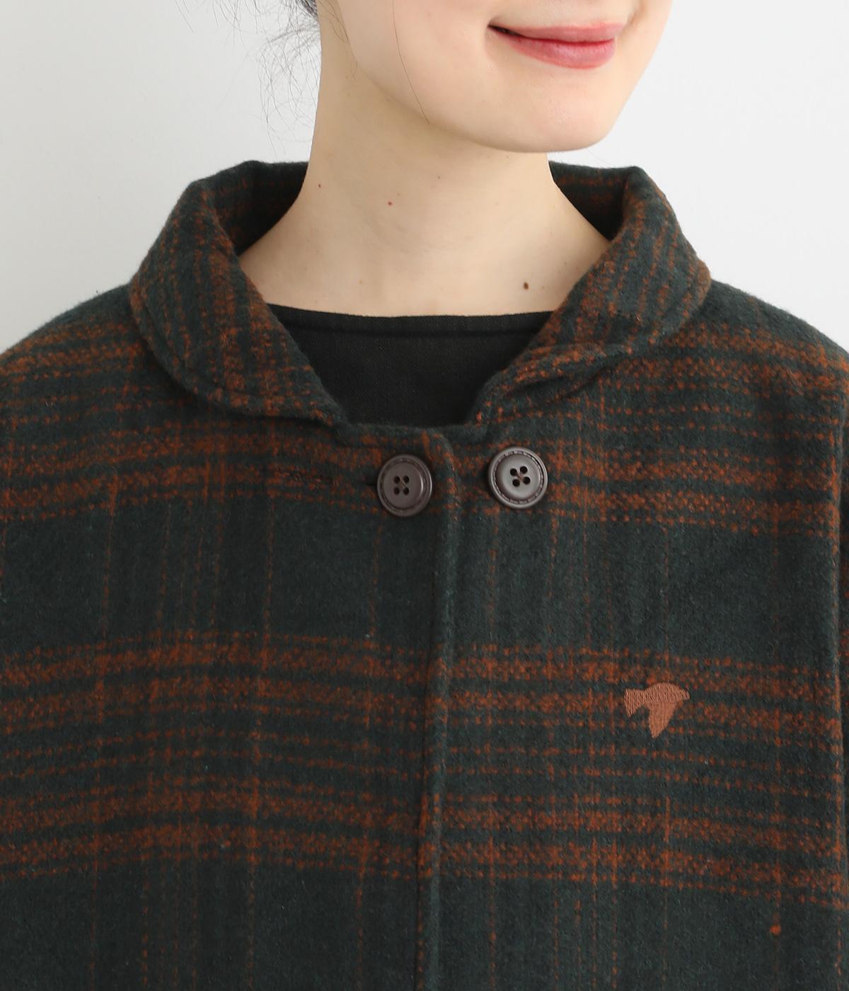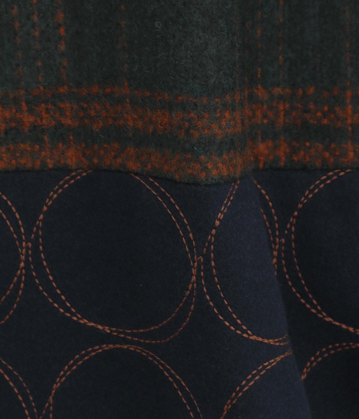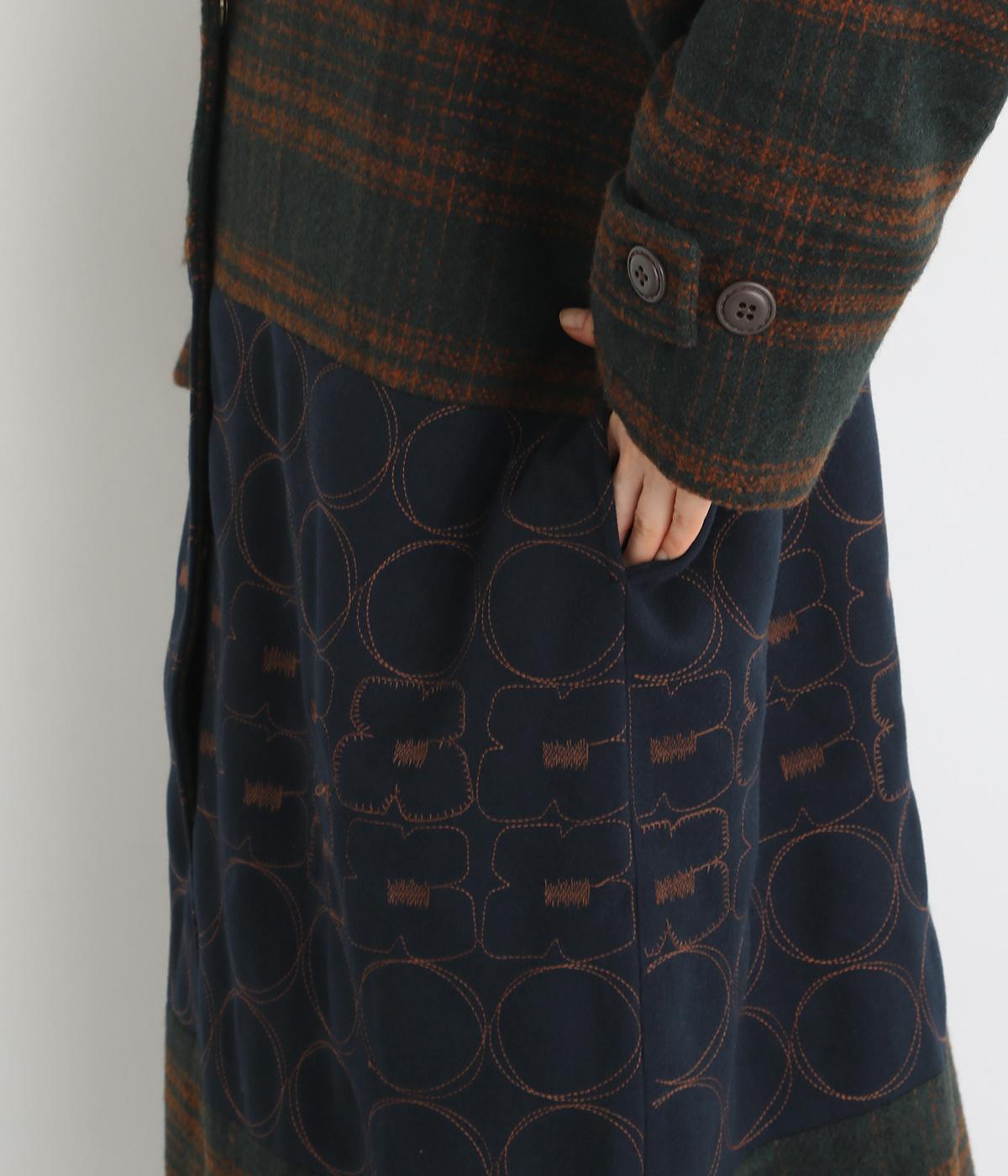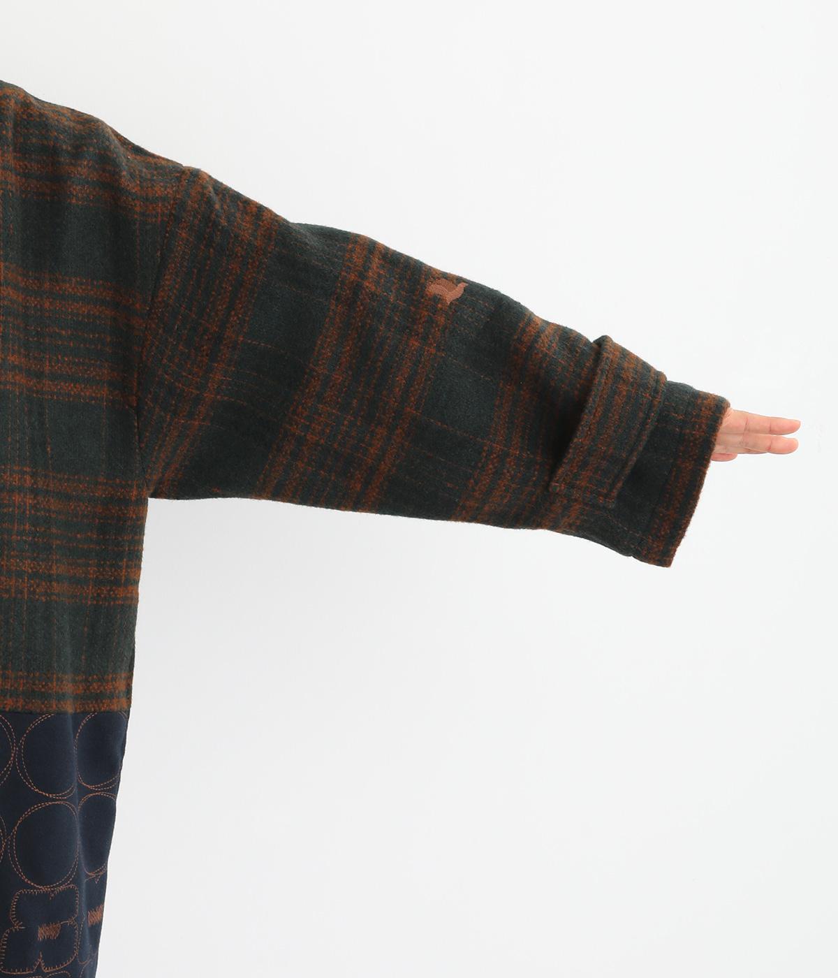 チェック柄と、リングと花の北欧風刺しゅうを絶妙なバランスで組み合わせたロングコート。身頃や袖にもところどころ鳥の刺しゅうをあしらいました。個性的な柄の組み合わせながらシックな雰囲気を叶え、ゆったりした身頃がカジュアル感を演出します。