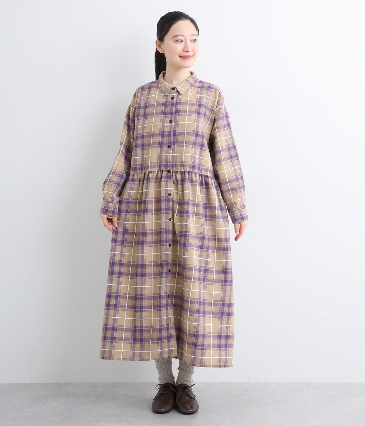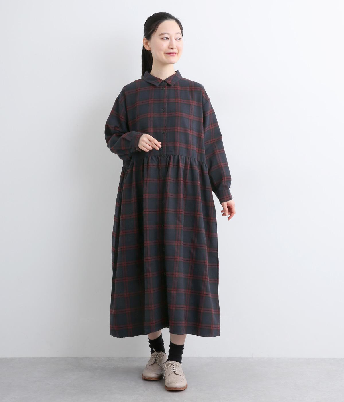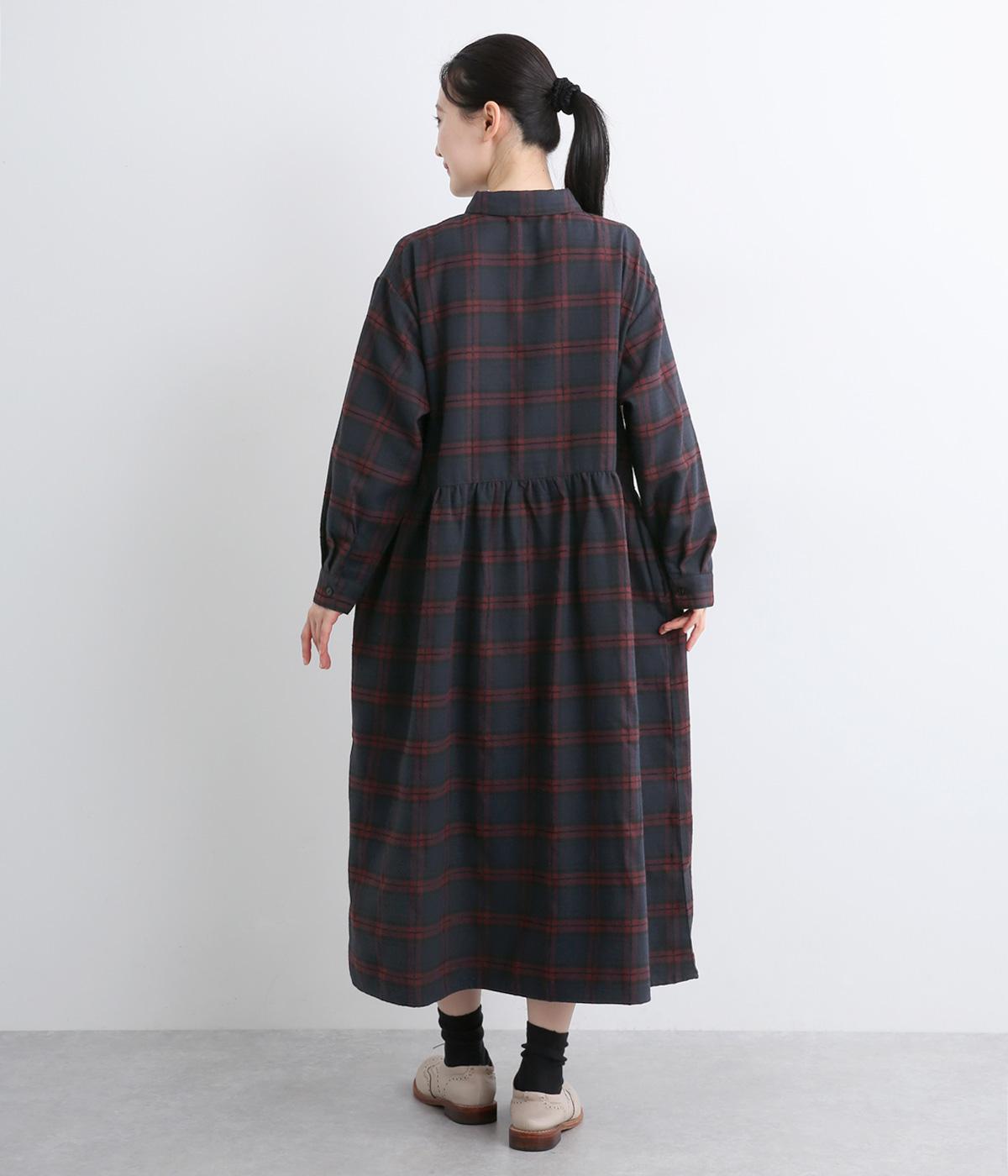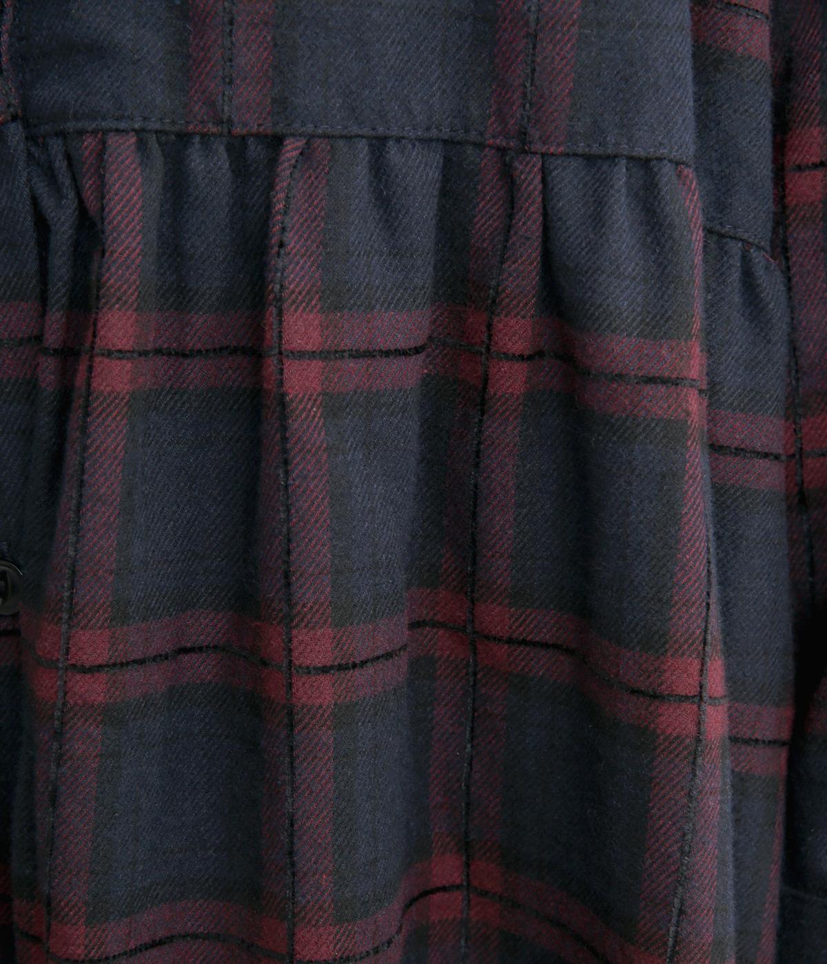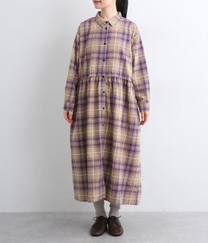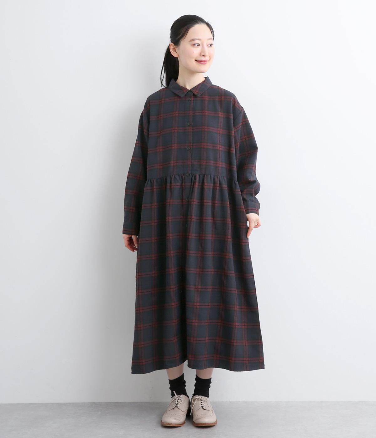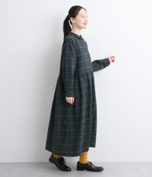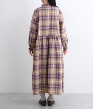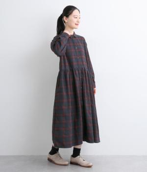 格子のラインを立体的な刺しゅうで仕立てたチェック柄のワンピースです。ウエストの切り替えにほどこしたギャザーがふんわりしたシルエットをつくり、女性らしさを演出します。ゆったりした身幅でリラックスした着心地です。