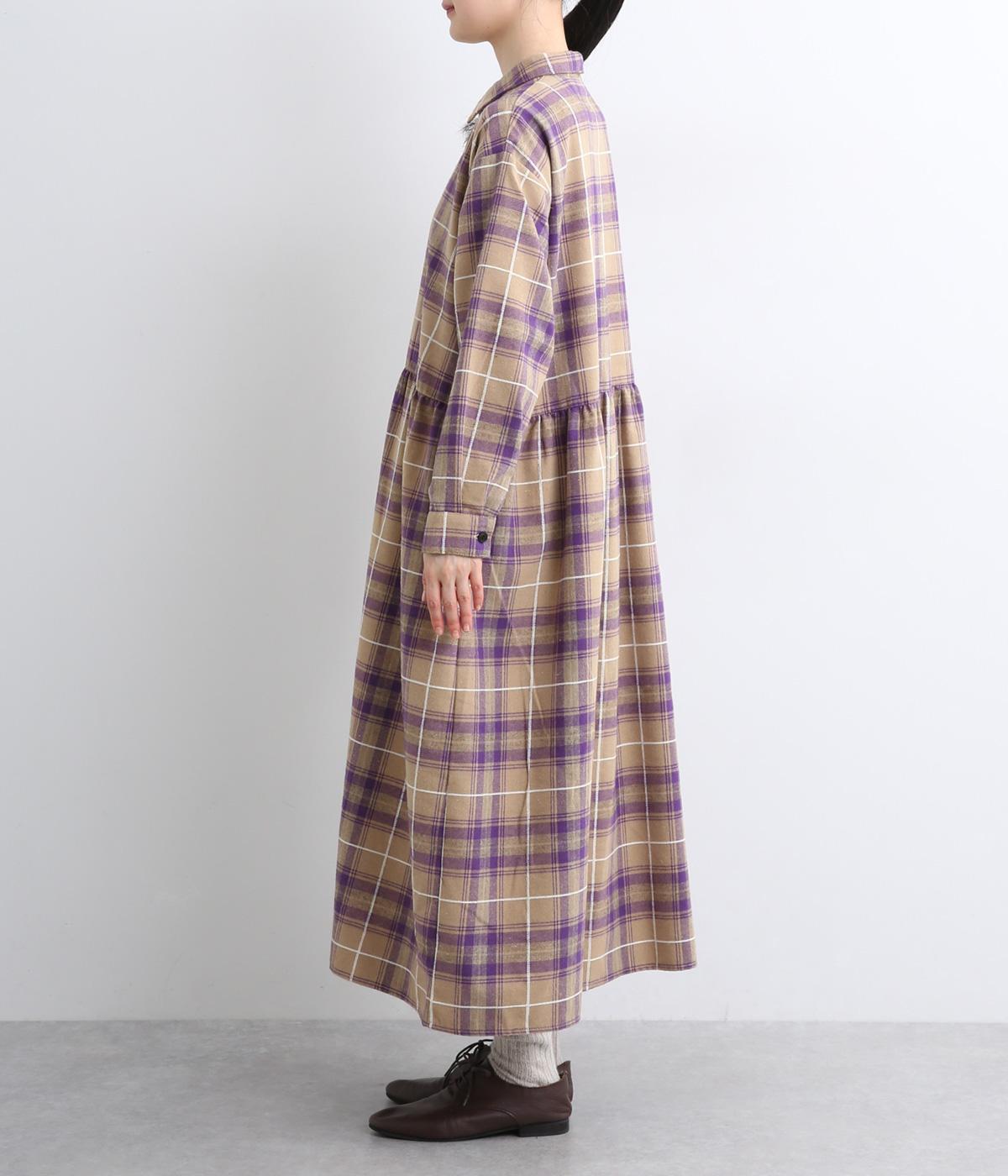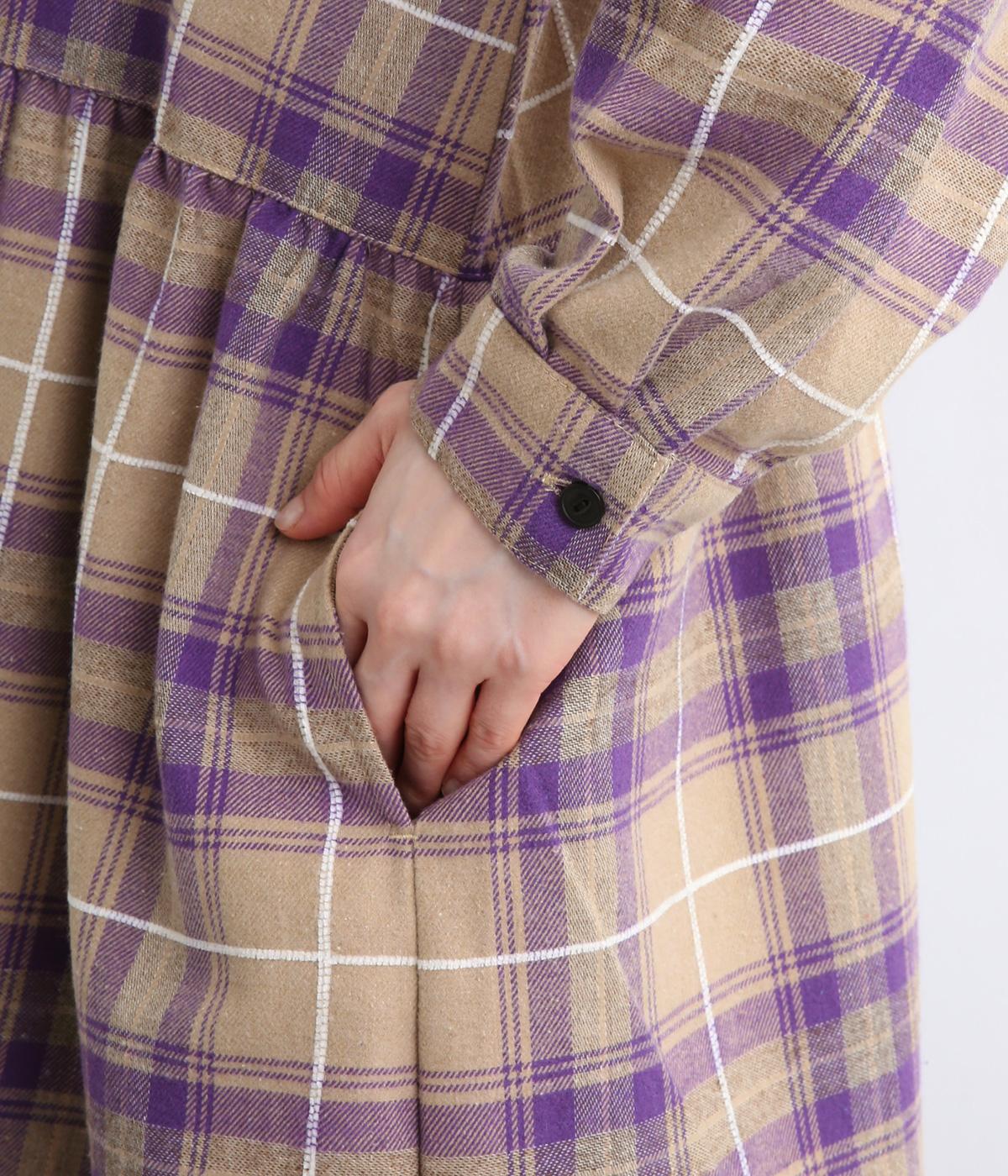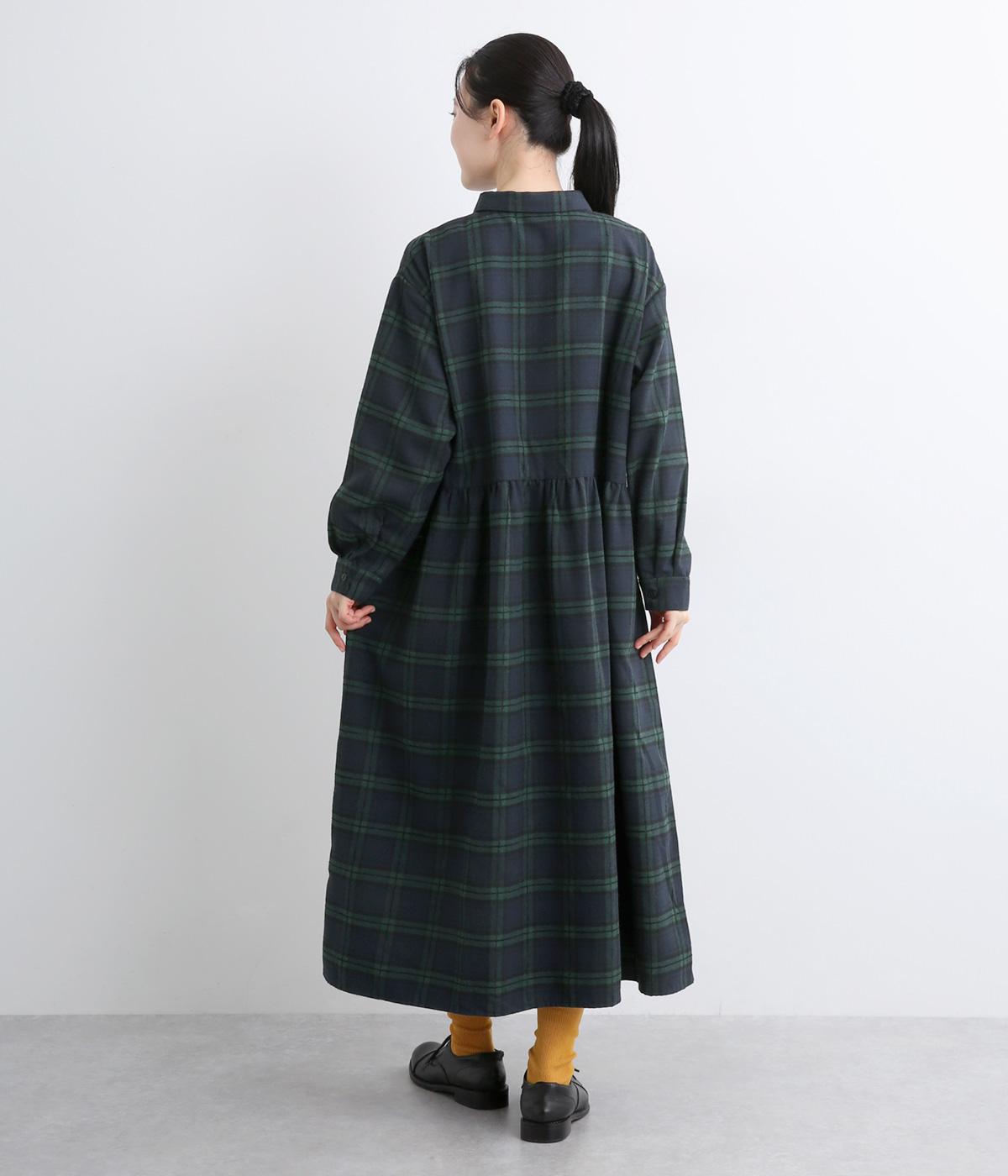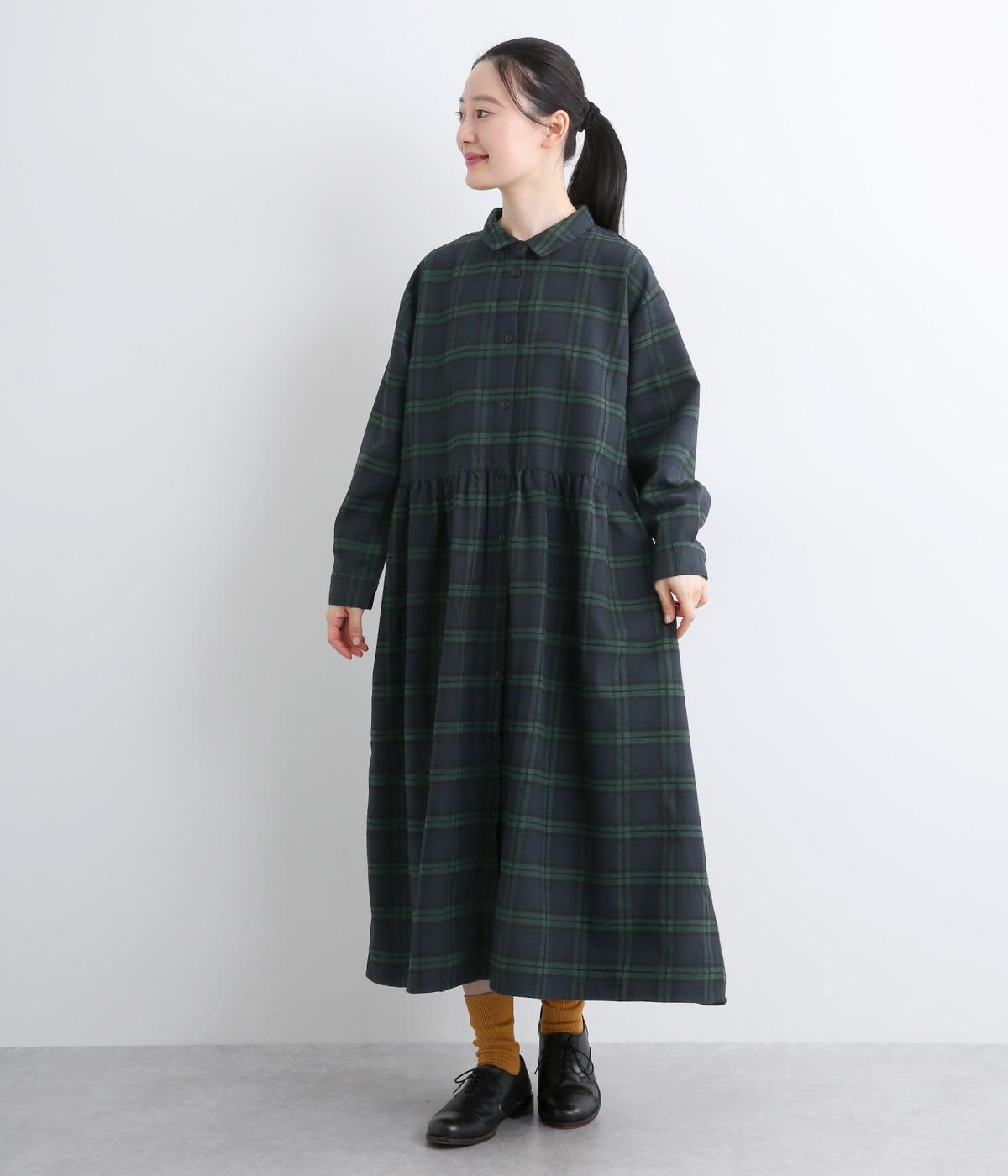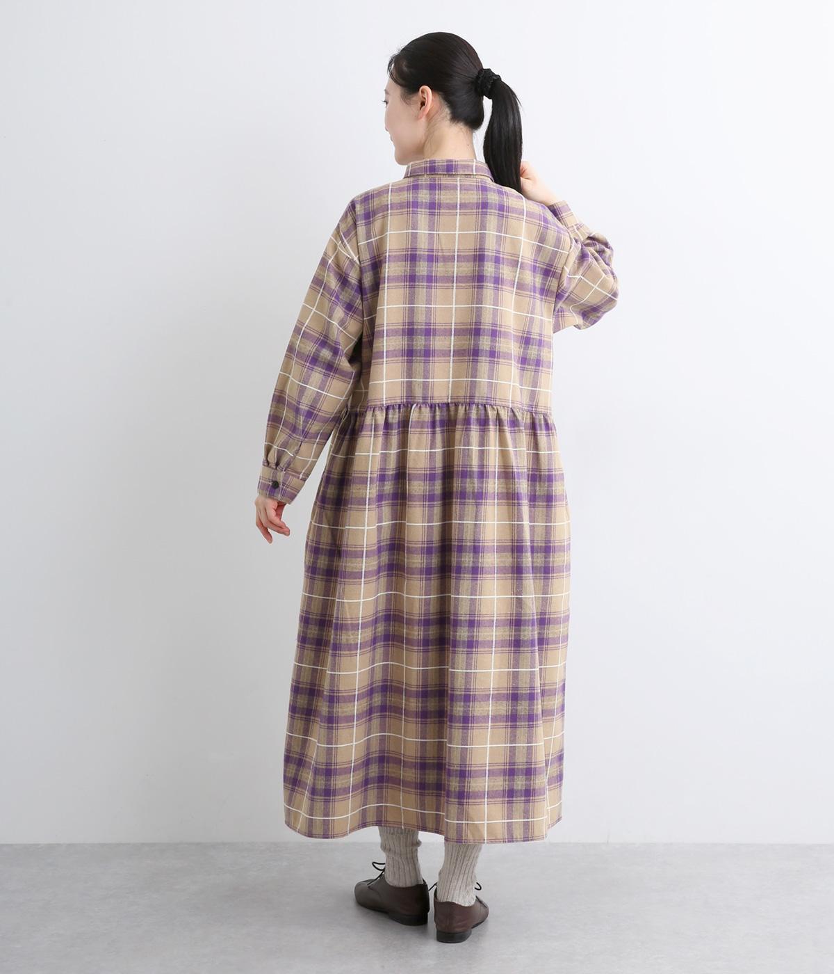 格子のラインを立体的な刺しゅうで仕立てたチェック柄のワンピースです。ウエストの切り替えにほどこしたギャザーがふんわりしたシルエットをつくり、女性らしさを演出します。ゆったりした身幅でリラックスした着心地です。