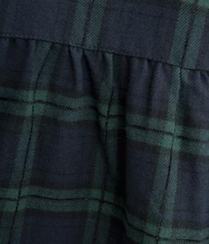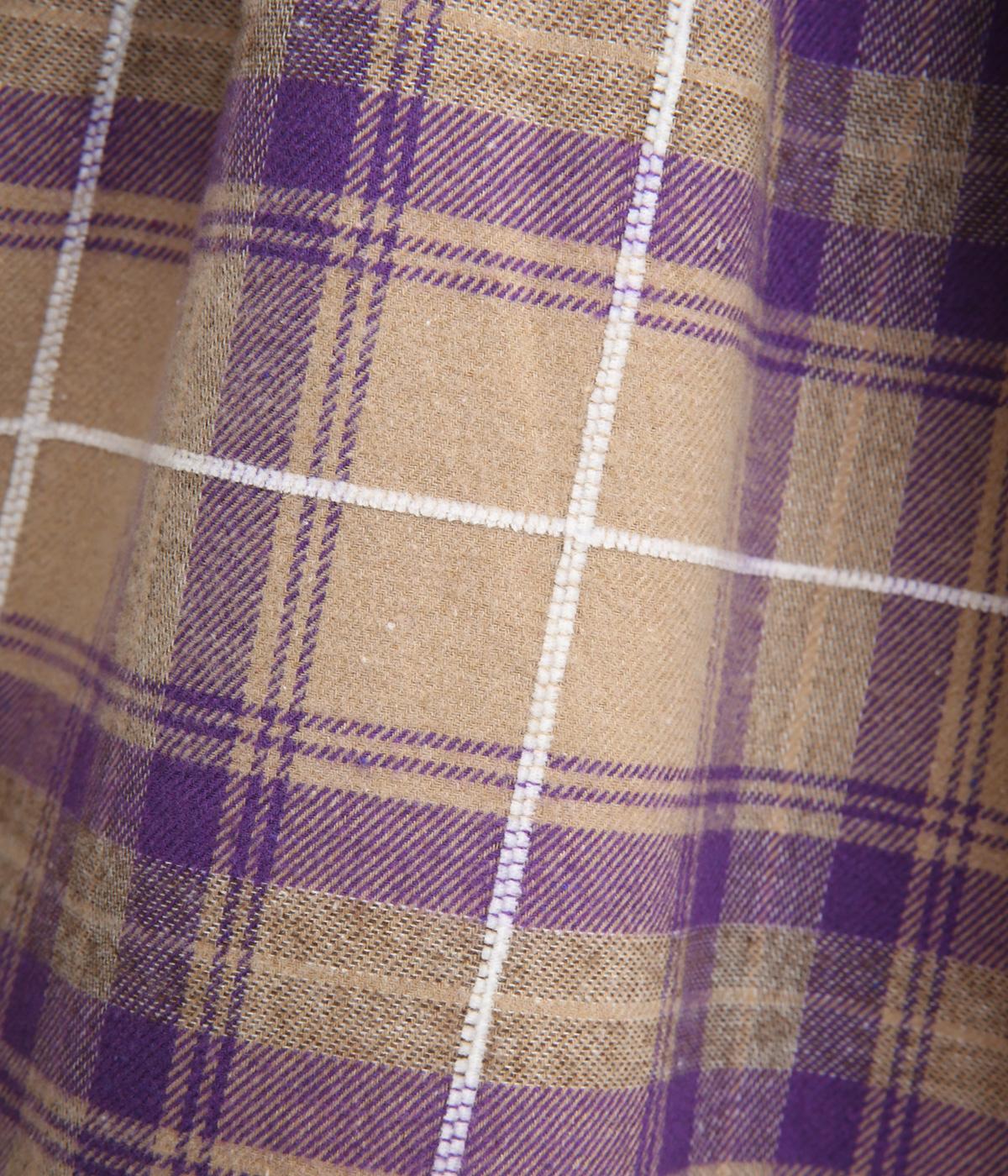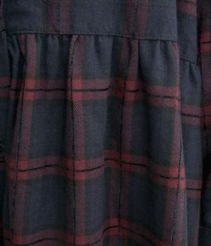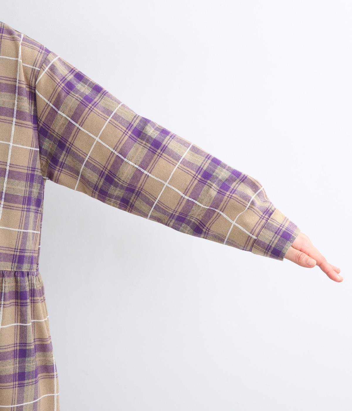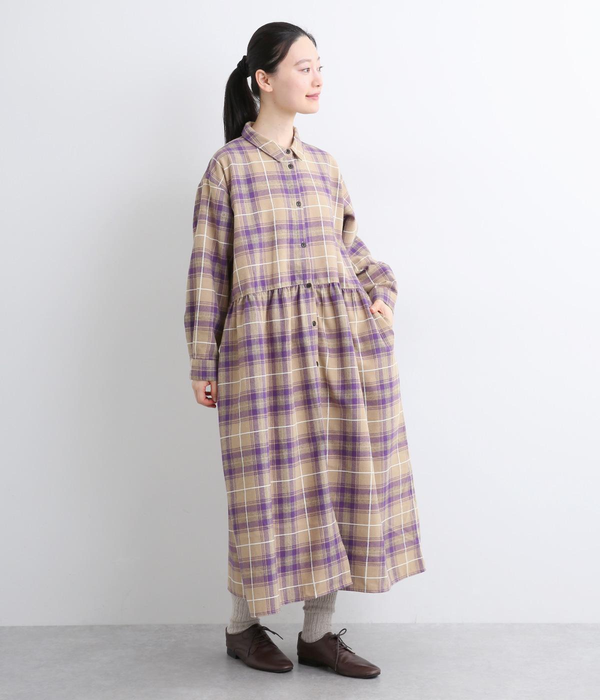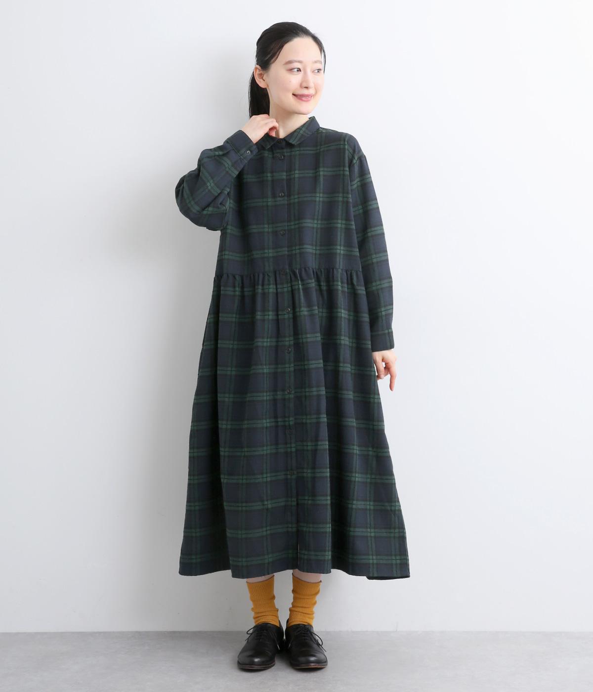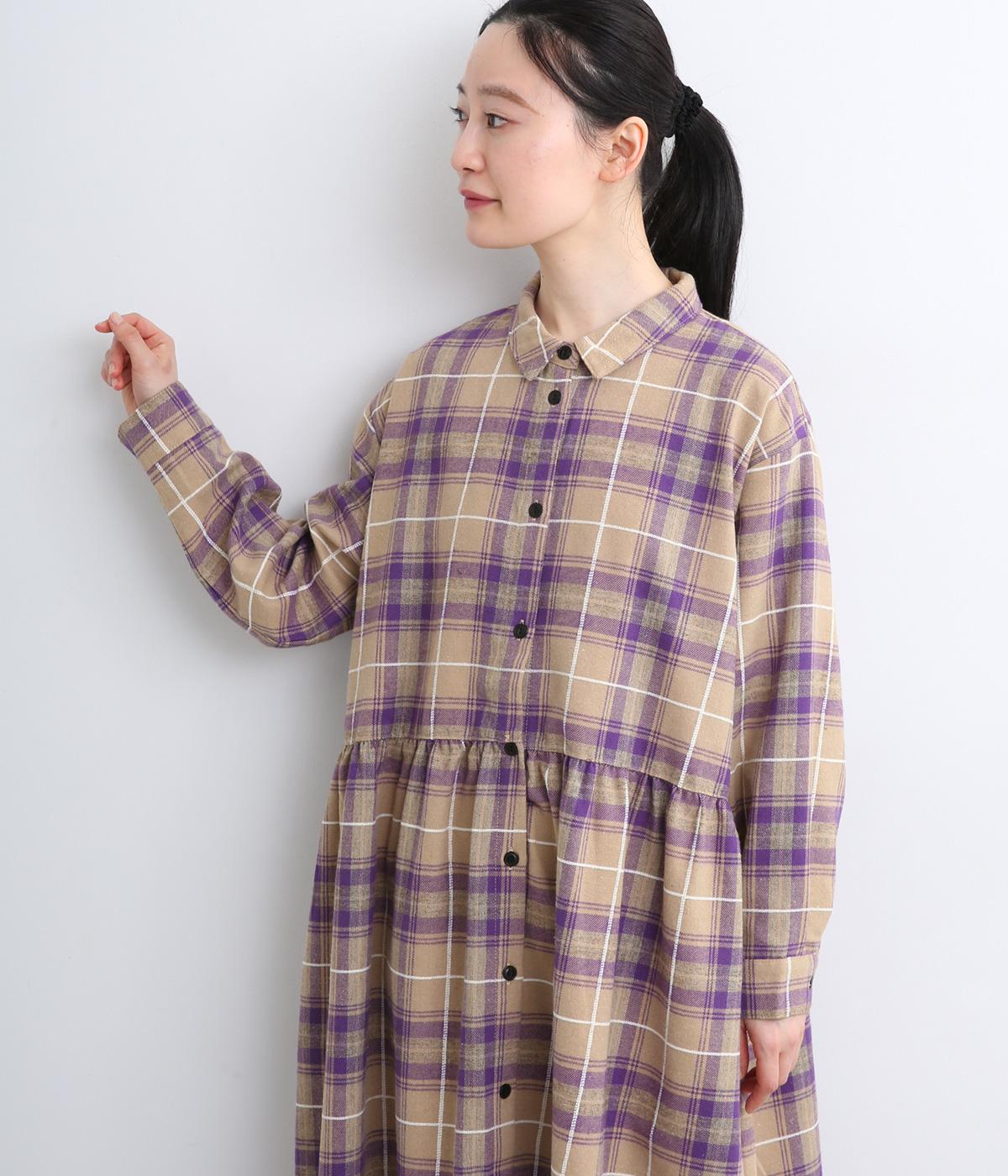 格子のラインを立体的な刺しゅうで仕立てたチェック柄のワンピースです。ウエストの切り替えにほどこしたギャザーがふんわりしたシルエットをつくり、女性らしさを演出します。ゆったりした身幅でリラックスした着心地です。