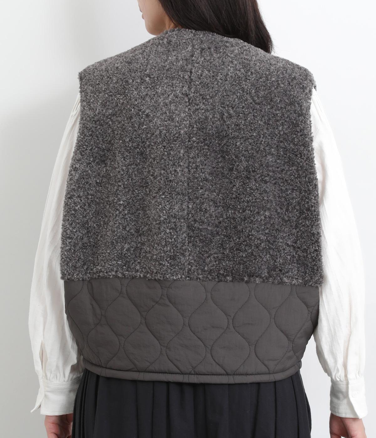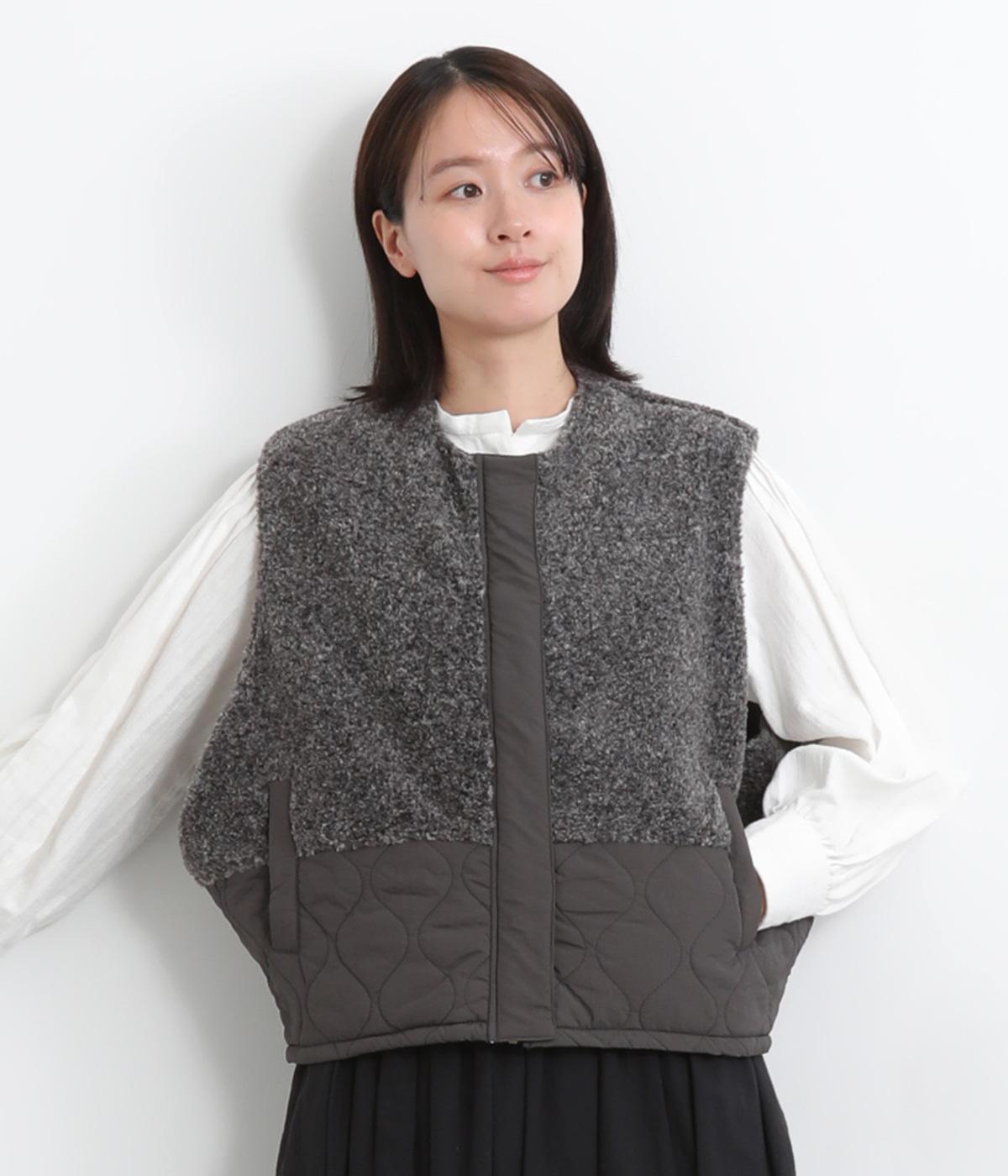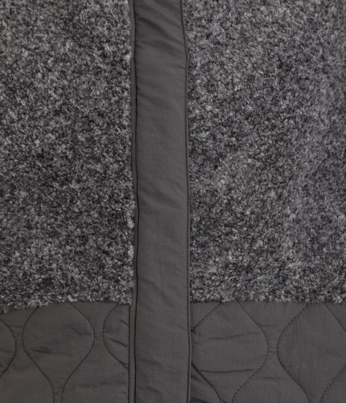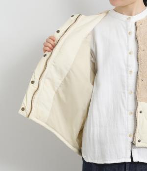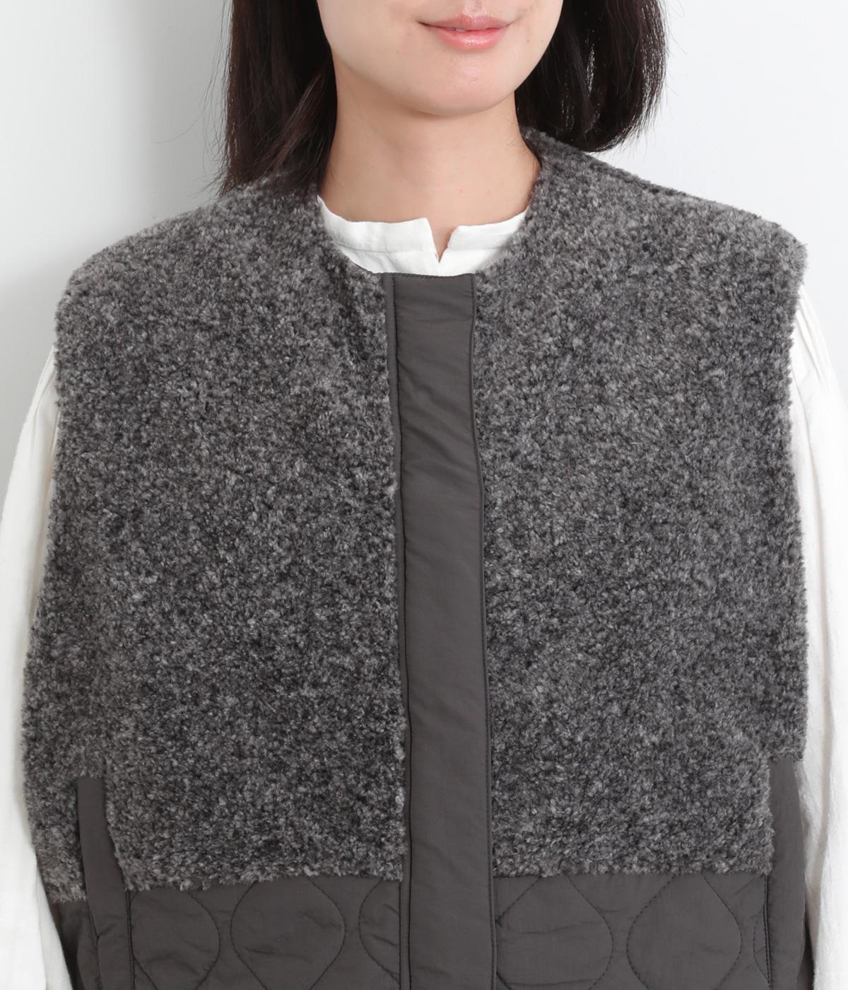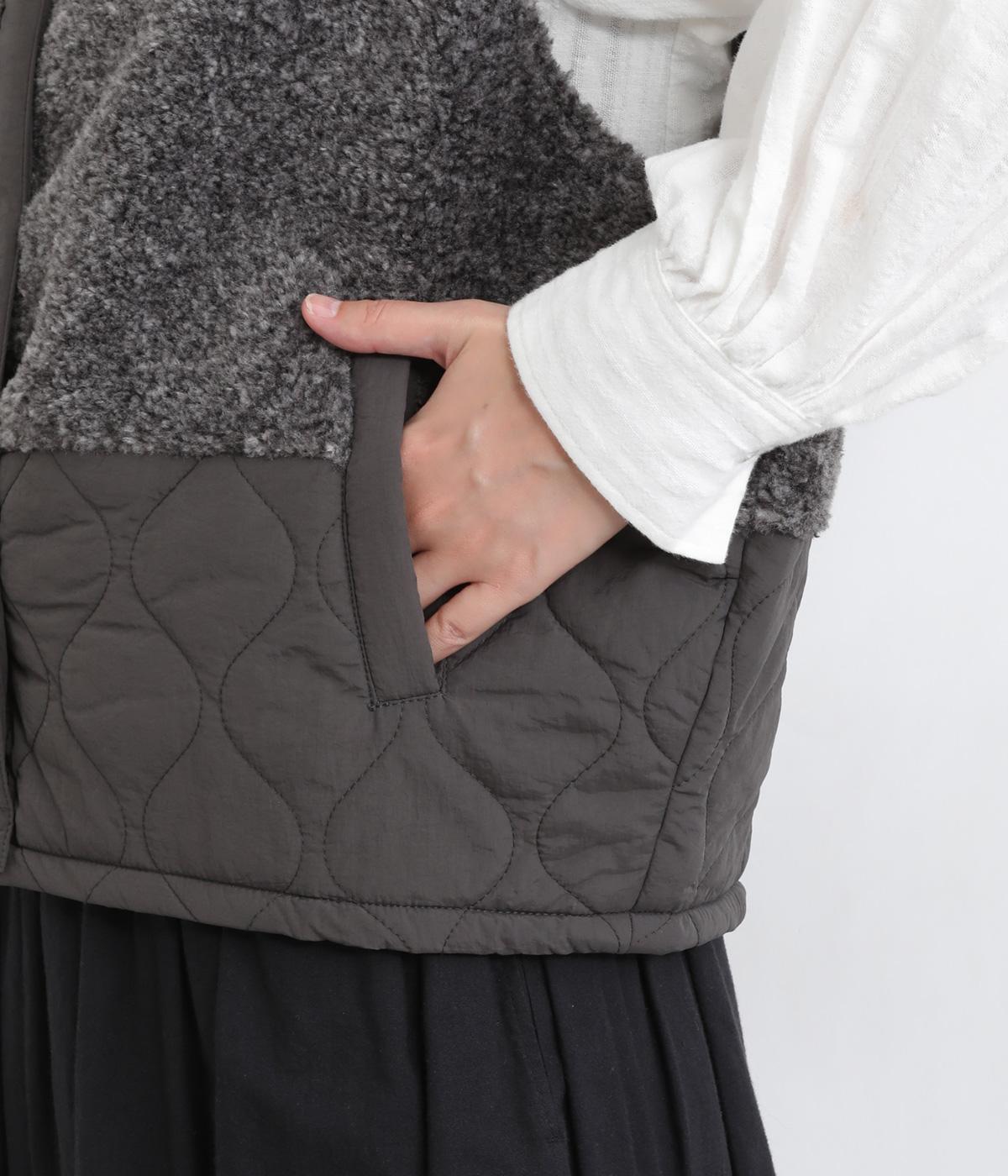 もこもことした表面感のボアとキルティングの異素材を組み合わせました。軽やかさをキープしながらも防寒力を高めた中綿入りです。