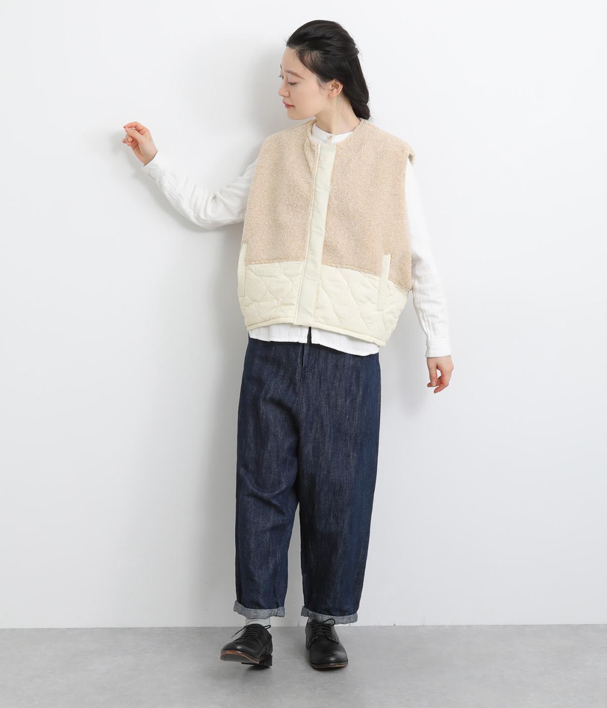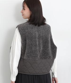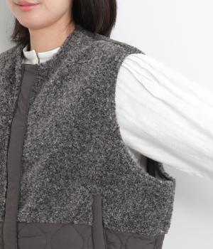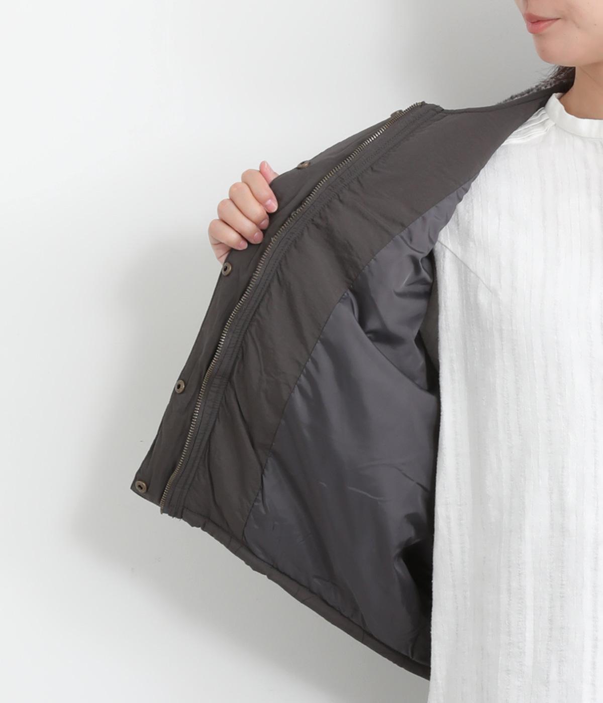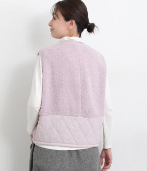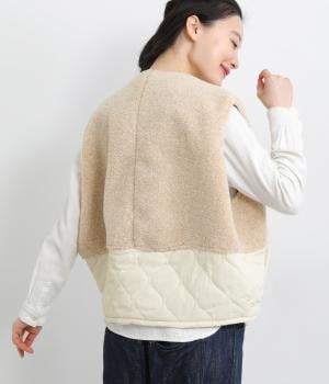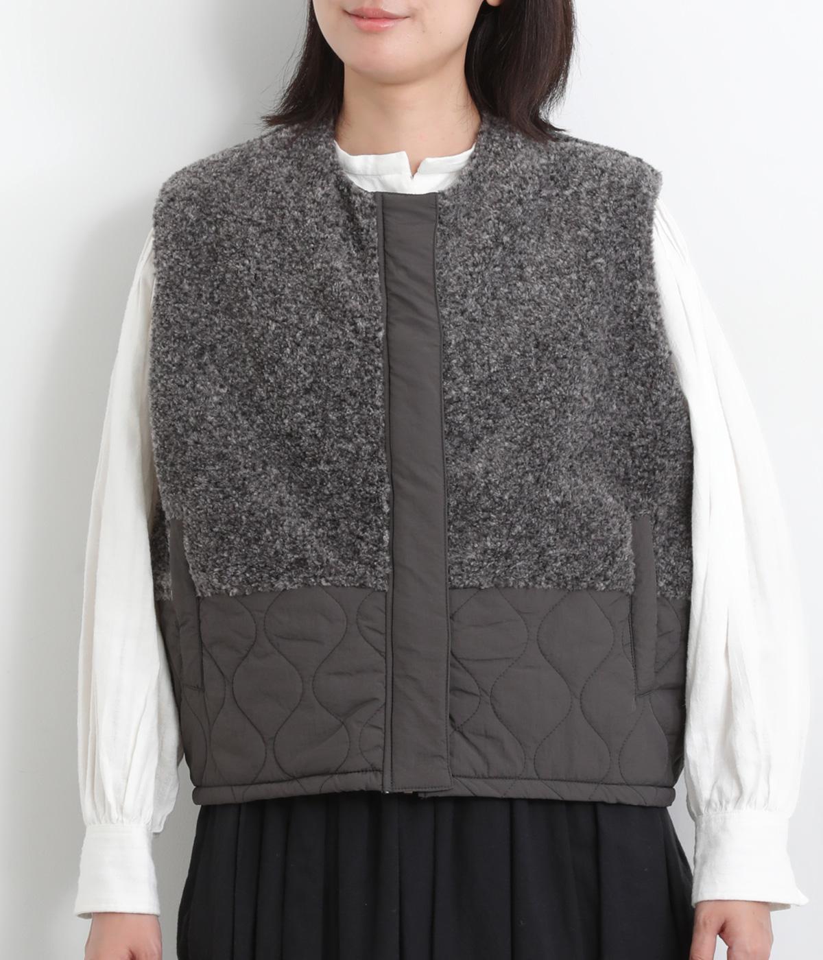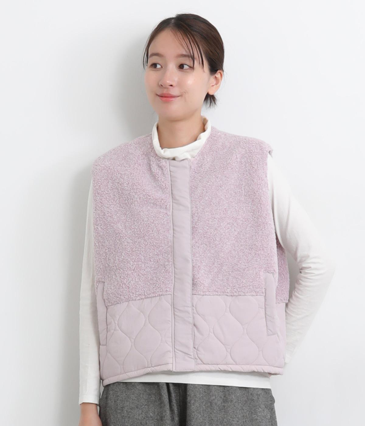 もこもことした表面感のボアとキルティングの異素材を組み合わせました。軽やかさをキープしながらも防寒力を高めた中綿入りです。