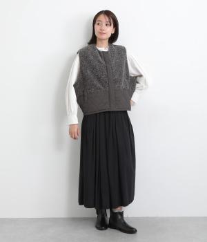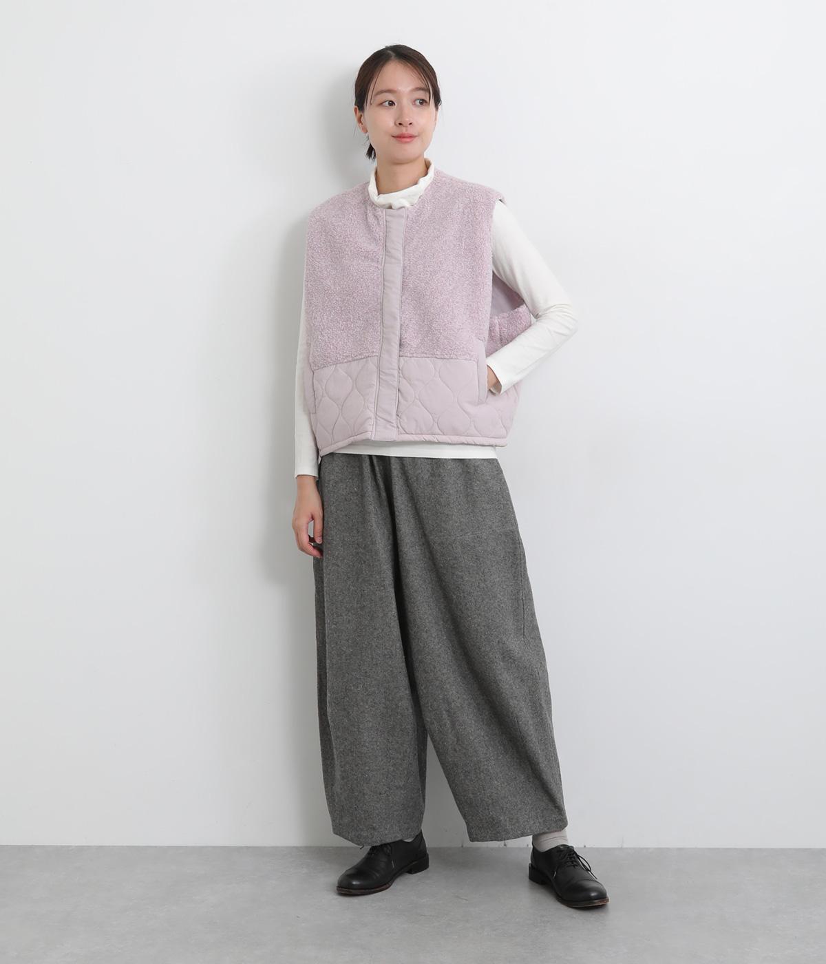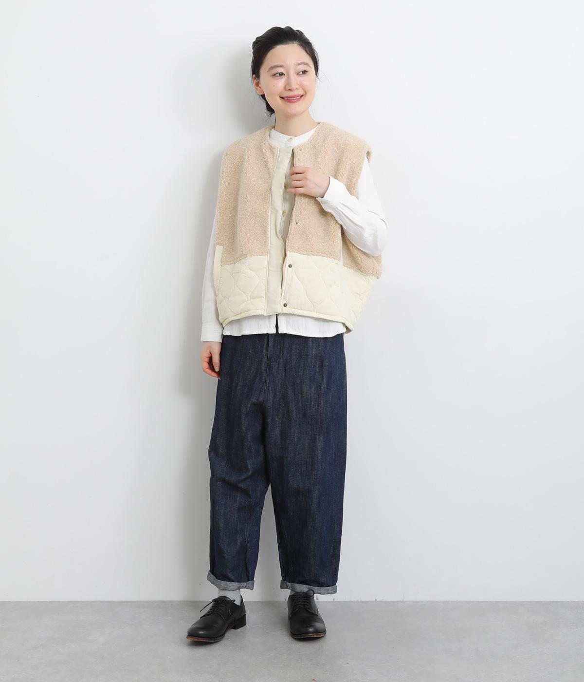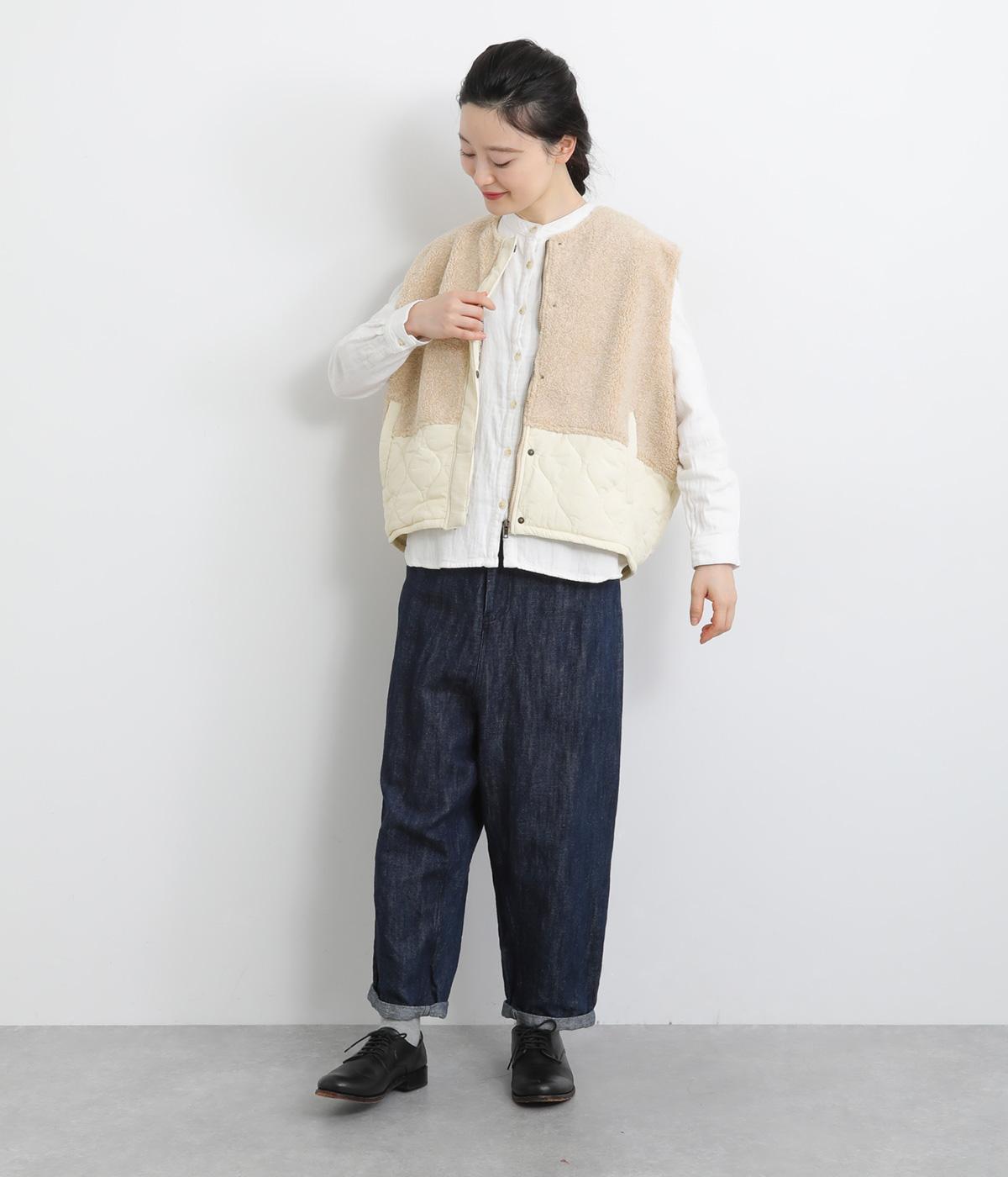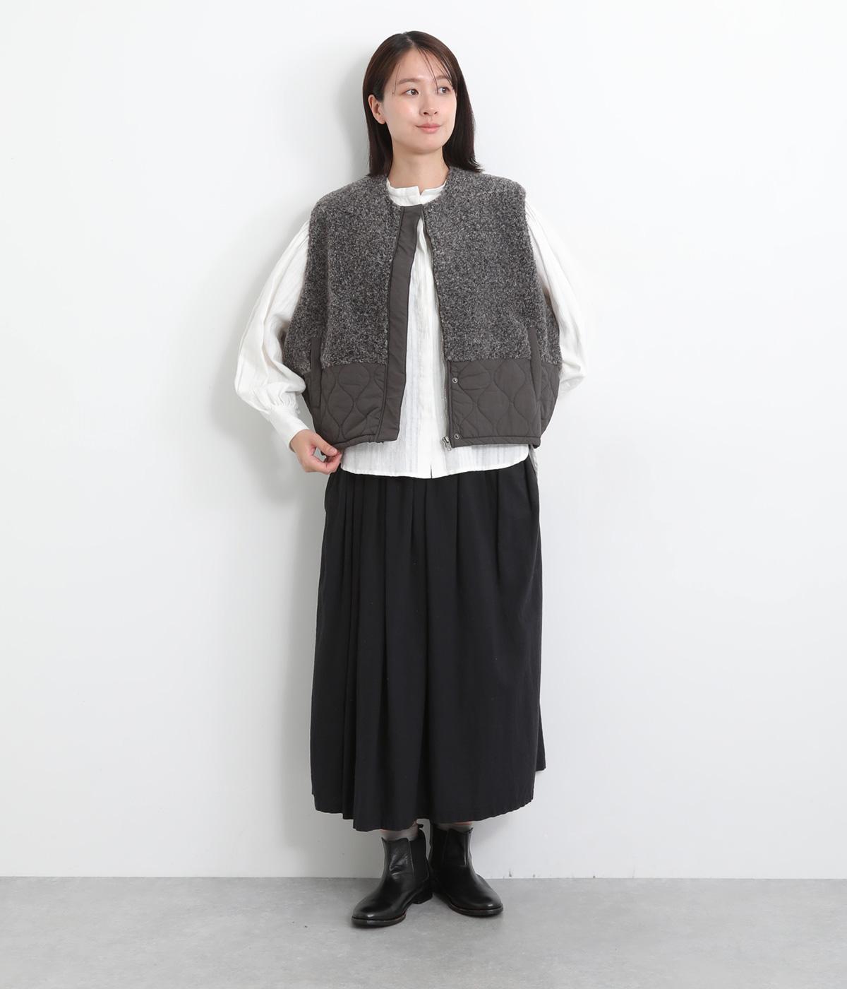もこもことした表面感のボアとキルティングの異素材を組み合わせました。軽やかさをキープしながらも防寒力を高めた中綿入りです。
