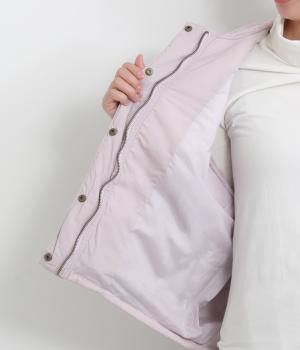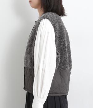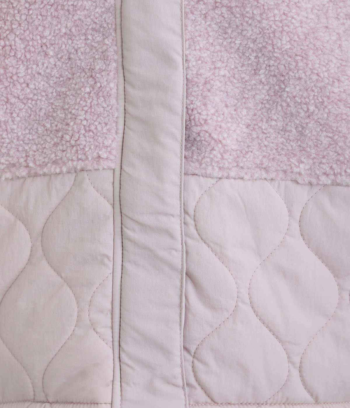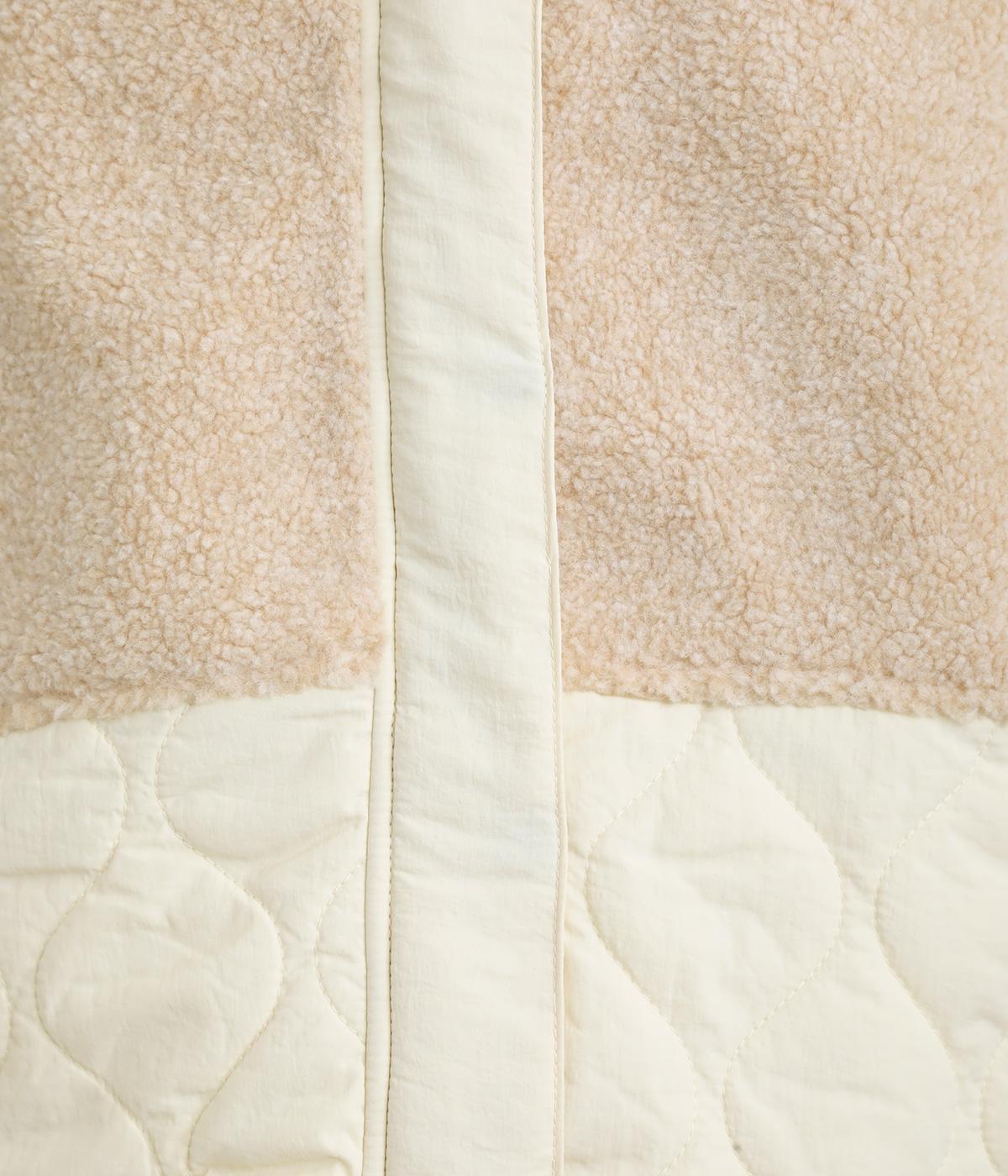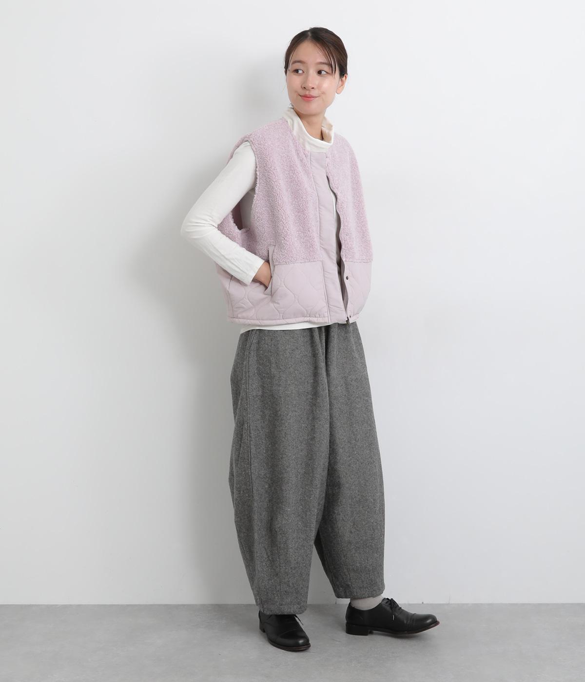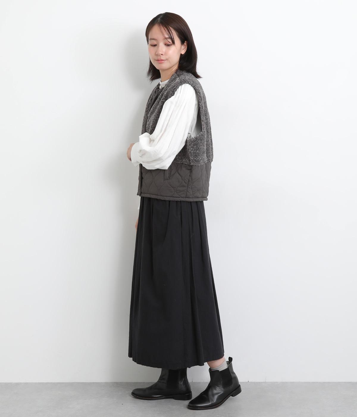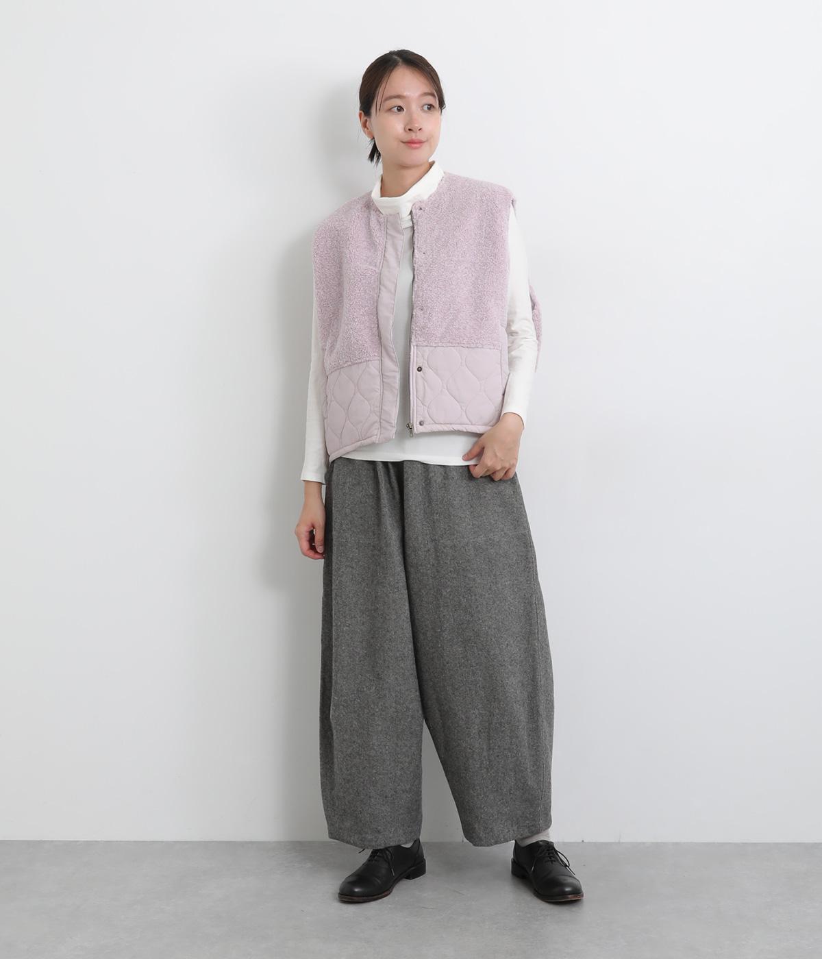 もこもことした表面感のボアとキルティングの異素材を組み合わせました。軽やかさをキープしながらも防寒力を高めた中綿入りです。