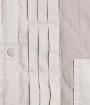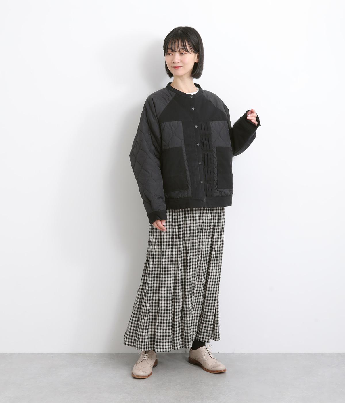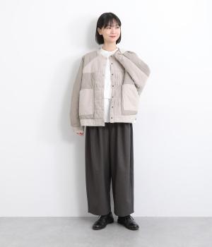 異素材の組み合わせが個性を放つブルゾン。前立てに施したプリーツがさりげない華やかさをプラスします。デザイン性を持たせながらも同系色でバランスよくまとめて日々のスタイリングにもすっとなじみます。