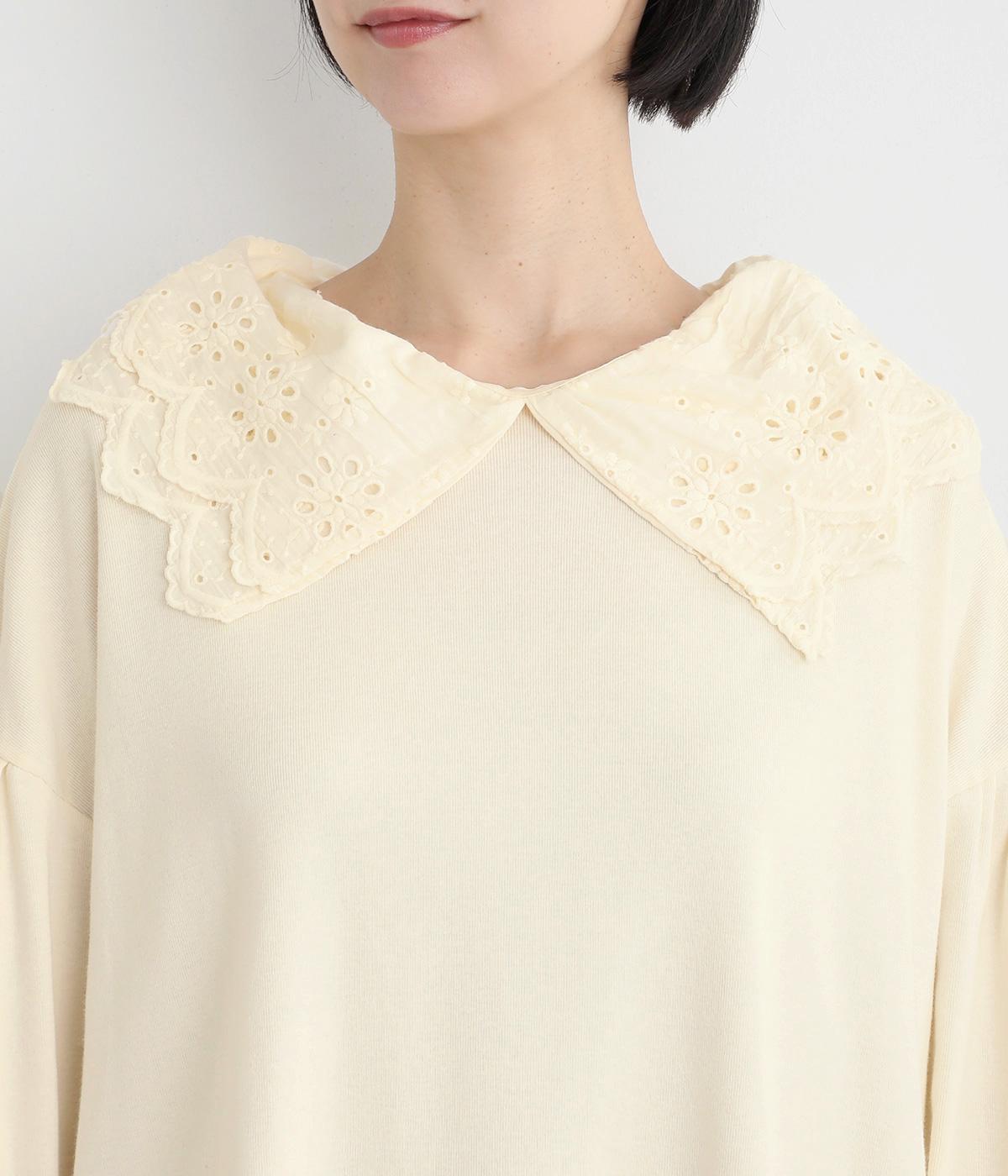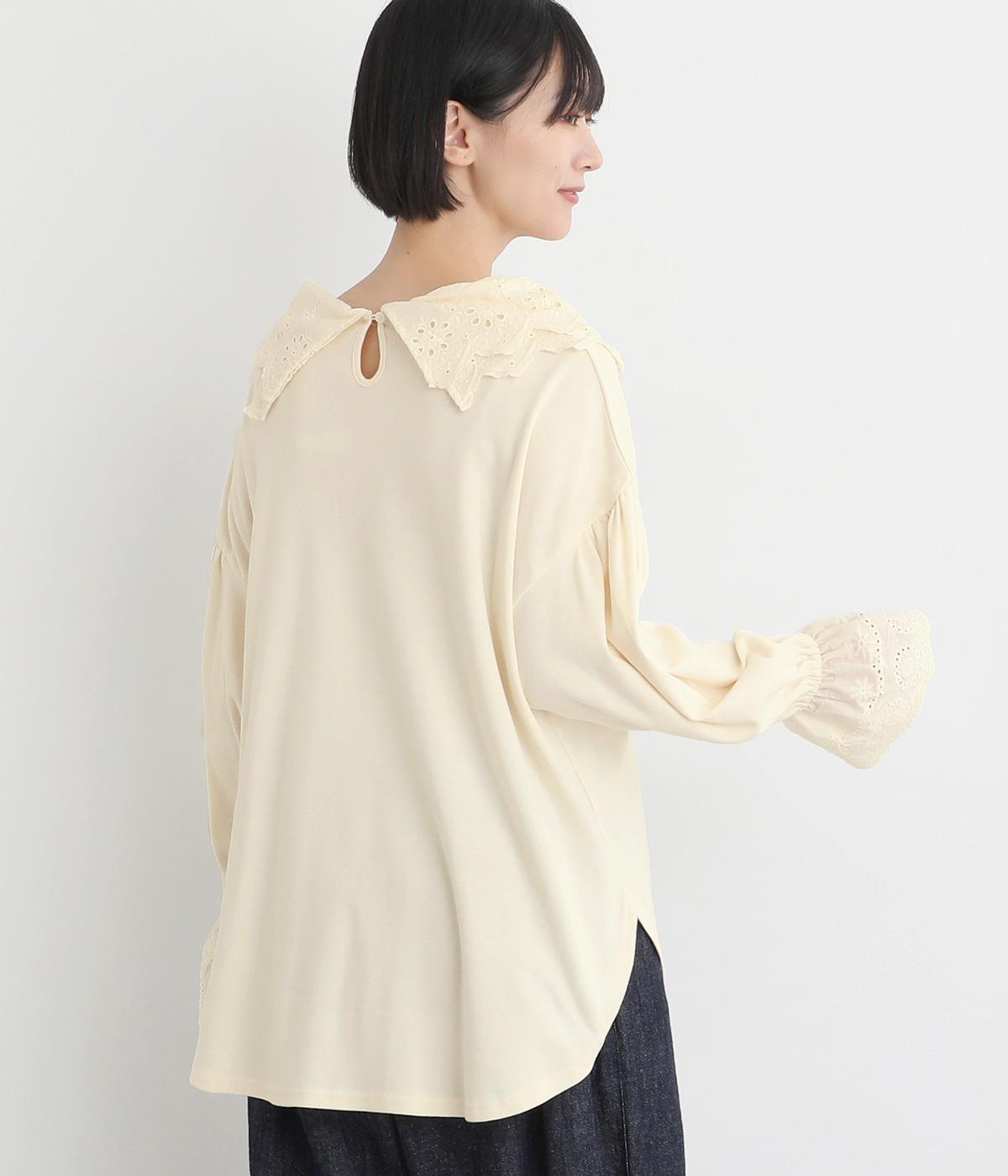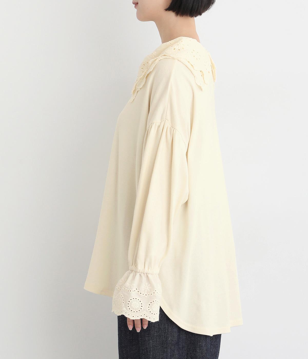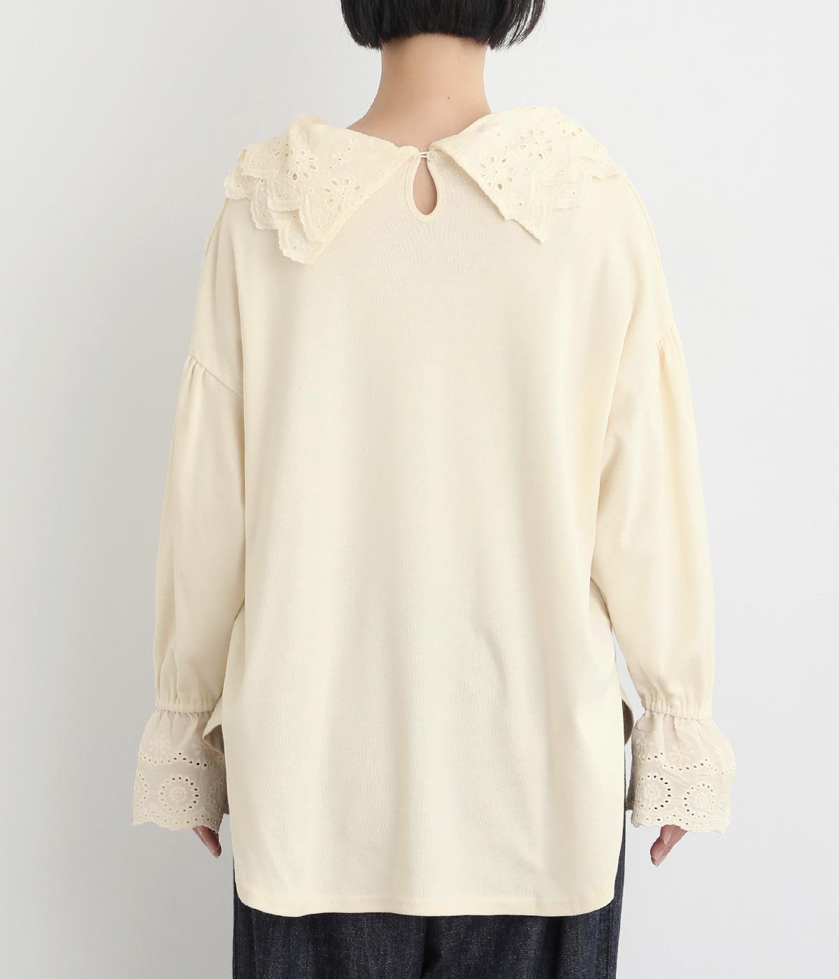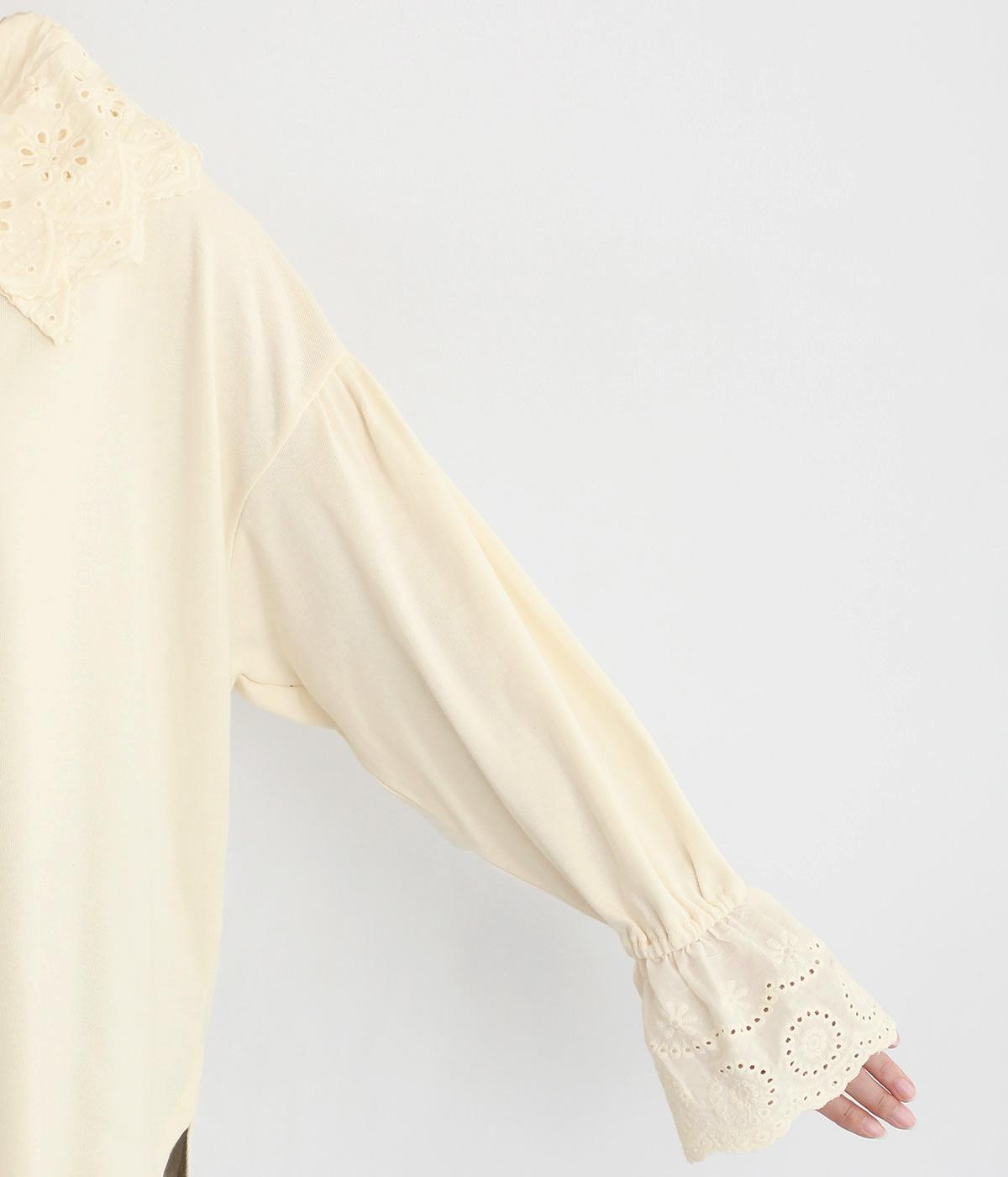 襟元と袖口の大振りレースがロマンティックで目を惹きます。カジュアルテイストなベースに立体感のあるレースが着映え力を高め、着こなしの主役になる一枚。サロペットなどのインナー使いでフリルを際立たせるのもおすすめ。
