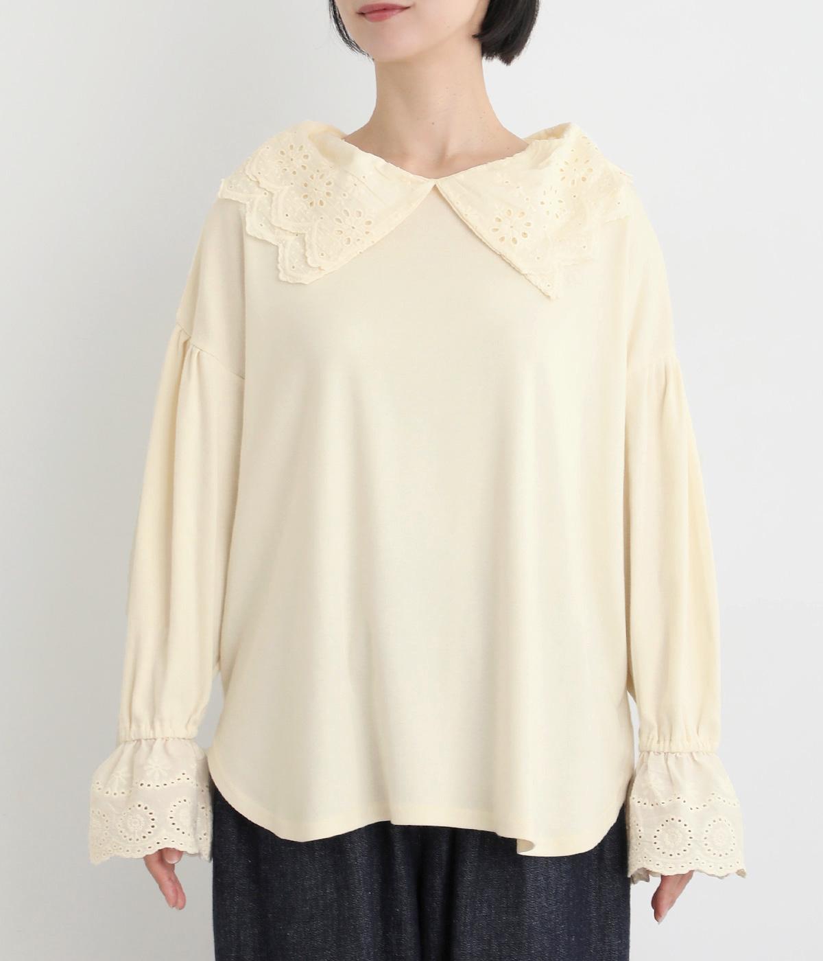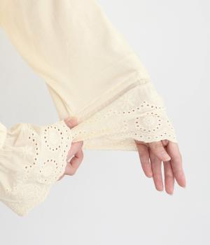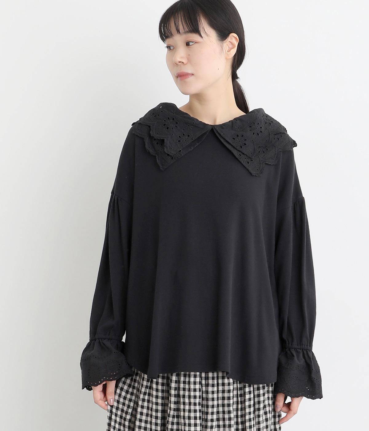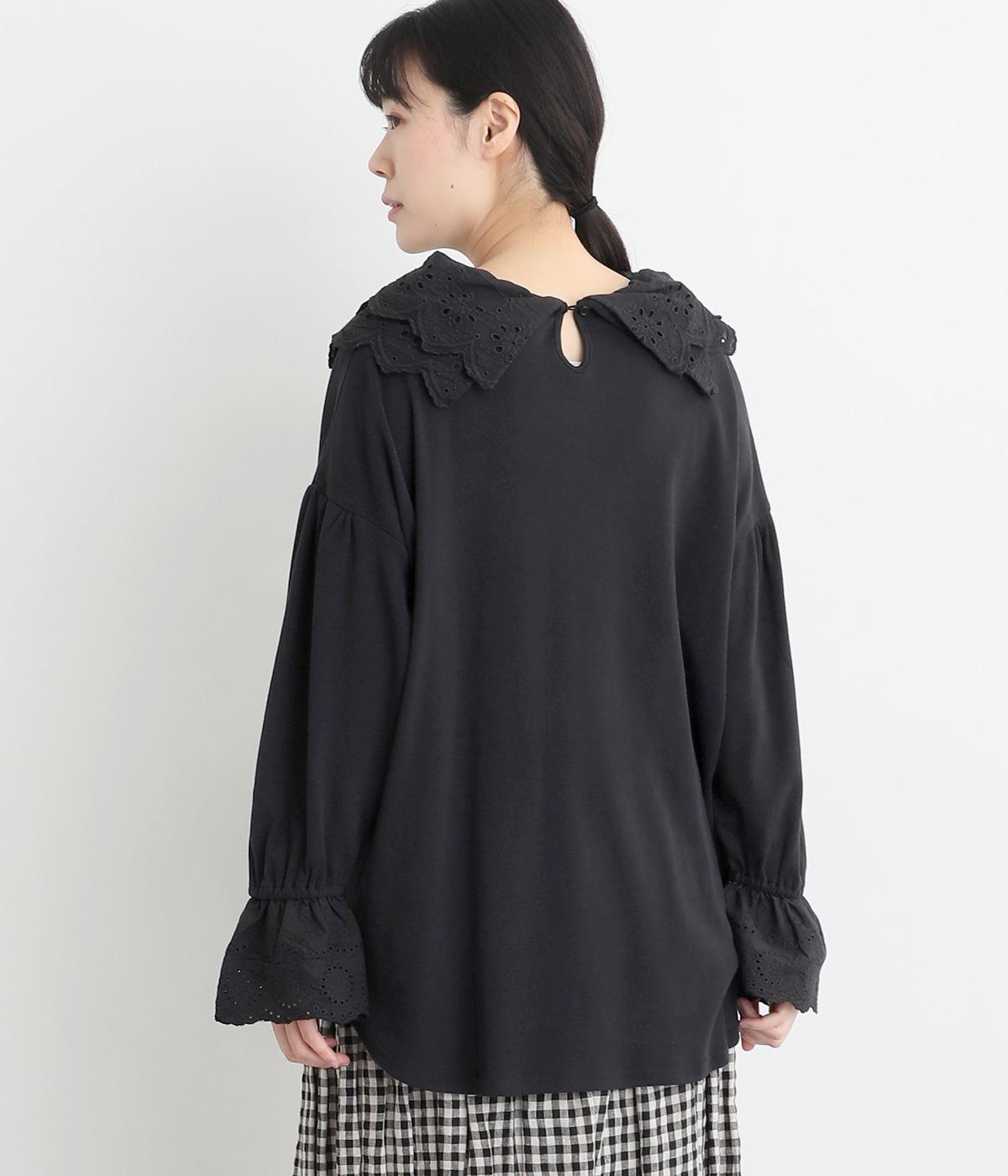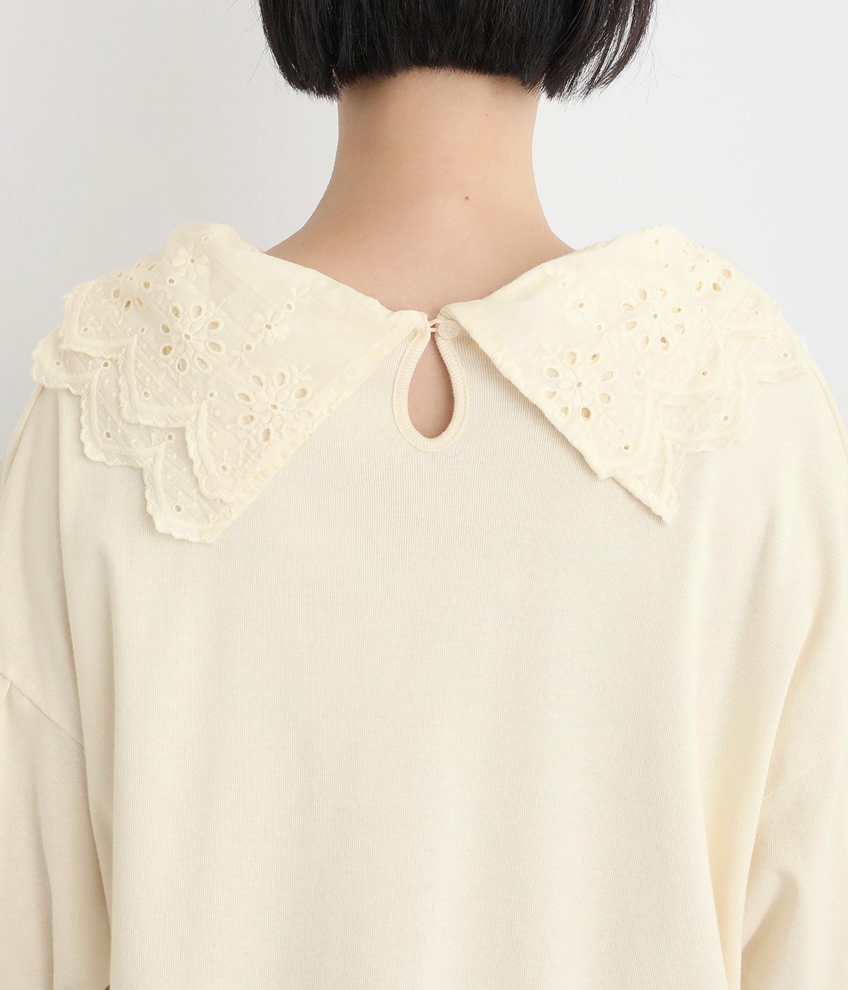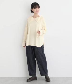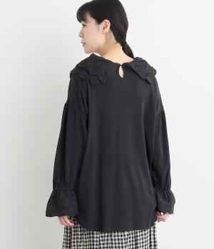 襟元と袖口の大振りレースがロマンティックで目を惹きます。カジュアルテイストなベースに立体感のあるレースが着映え力を高め、着こなしの主役になる一枚。サロペットなどのインナー使いでフリルを際立たせるのもおすすめ。