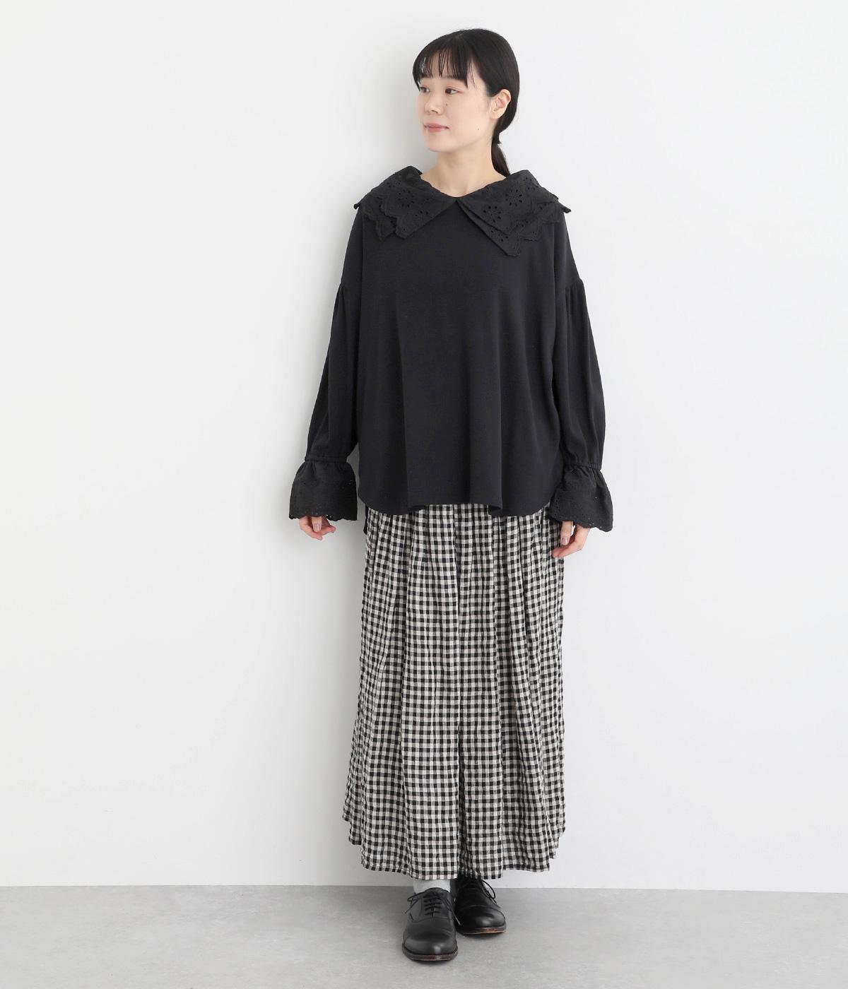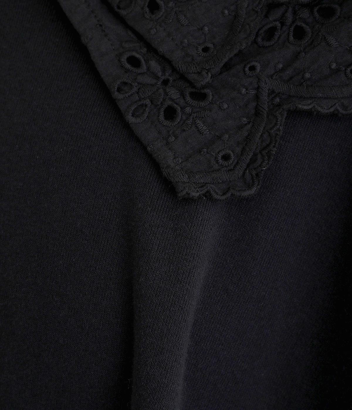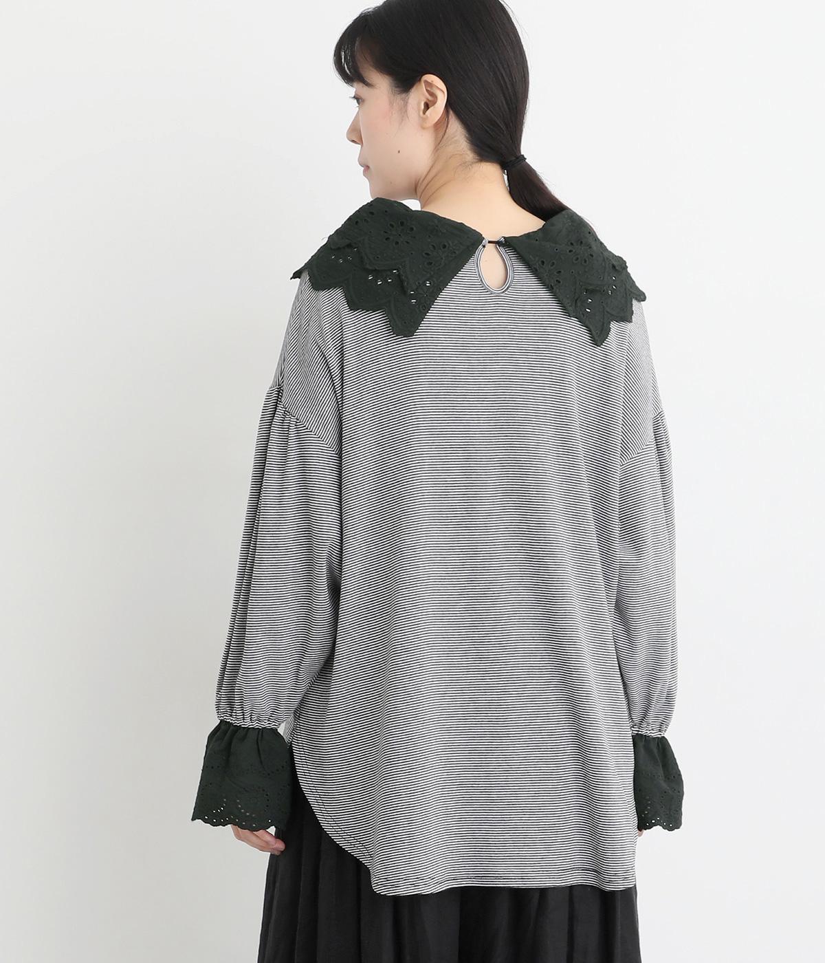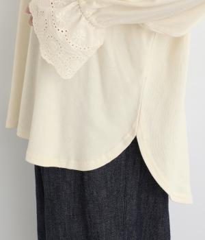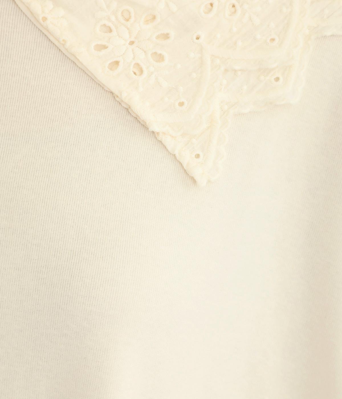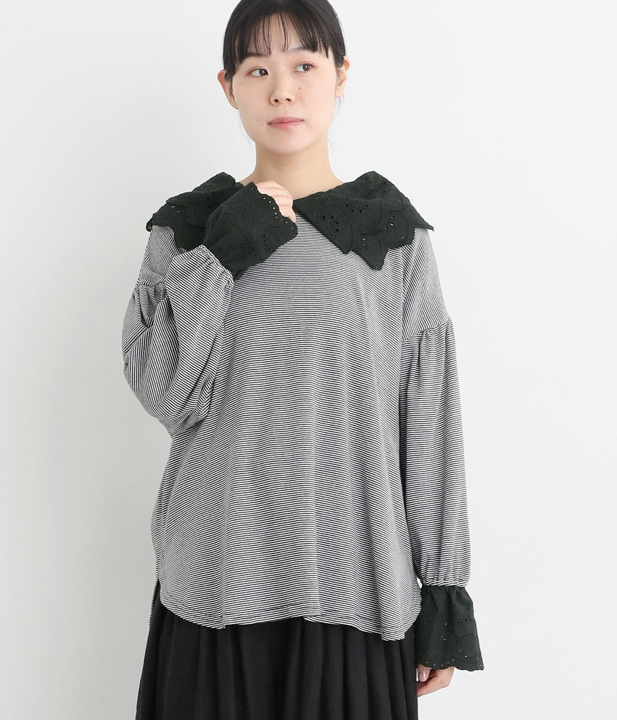襟元と袖口の大振りレースがロマンティックで目を惹きます。カジュアルテイストなベースに立体感のあるレースが着映え力を高め、着こなしの主役になる一枚。サロペットなどのインナー使いでフリルを際立たせるのもおすすめ。