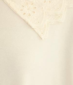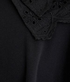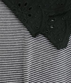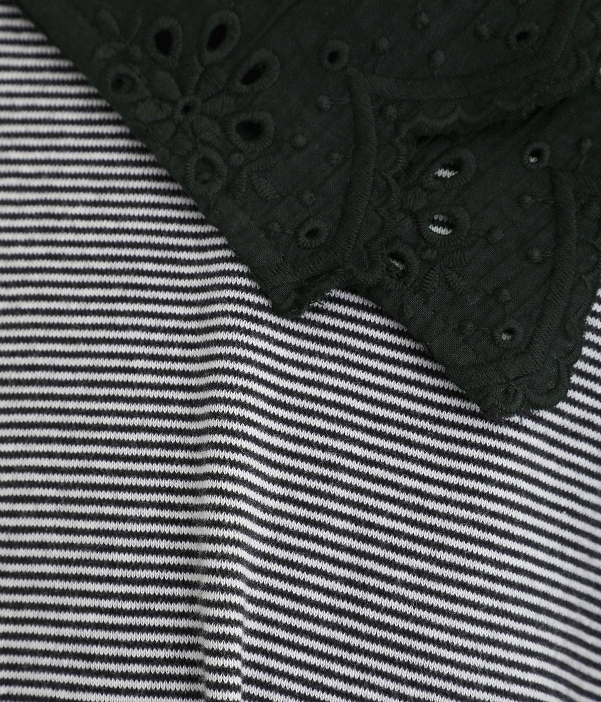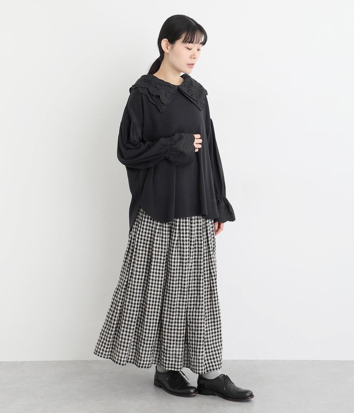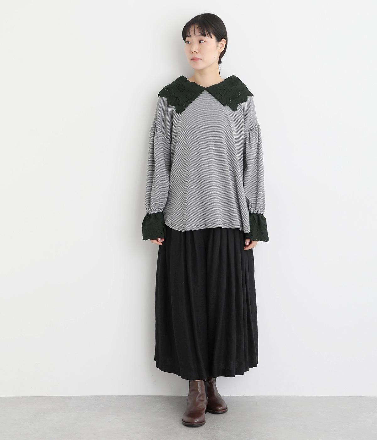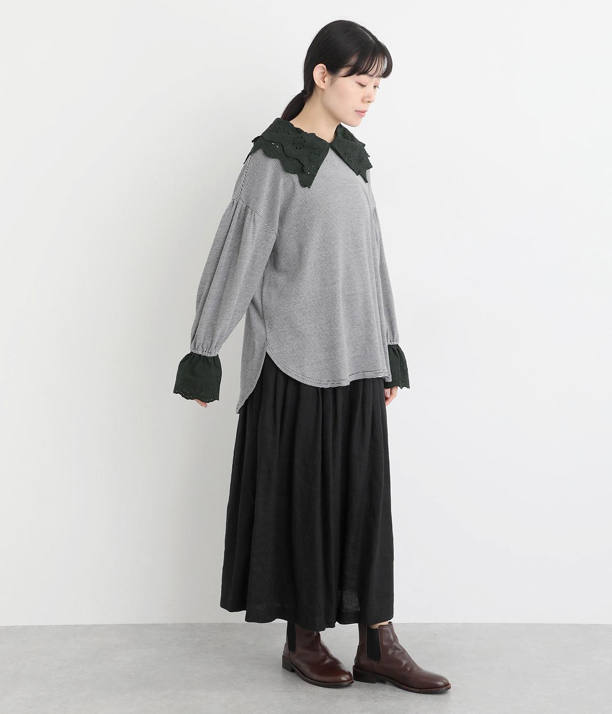 襟元と袖口の大振りレースがロマンティックで目を惹きます。カジュアルテイストなベースに立体感のあるレースが着映え力を高め、着こなしの主役になる一枚。サロペットなどのインナー使いでフリルを際立たせるのもおすすめ。