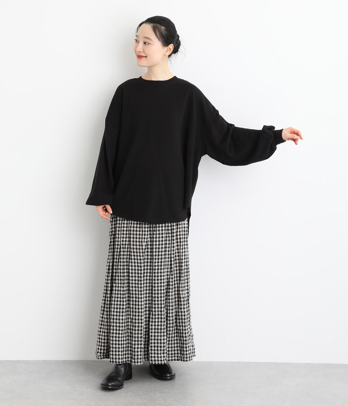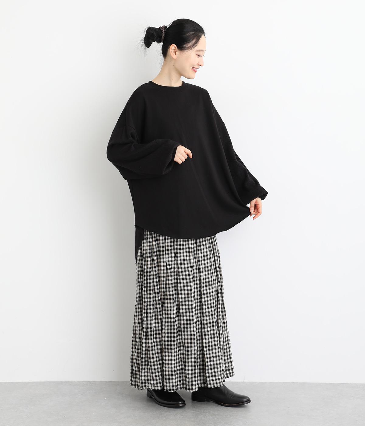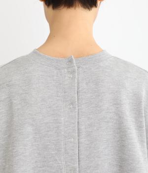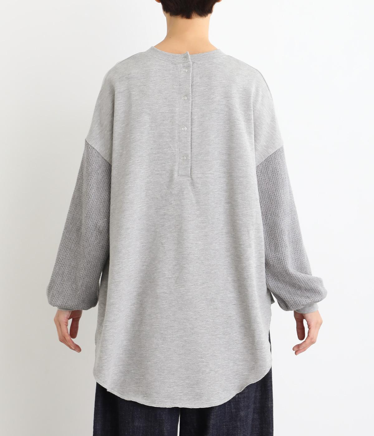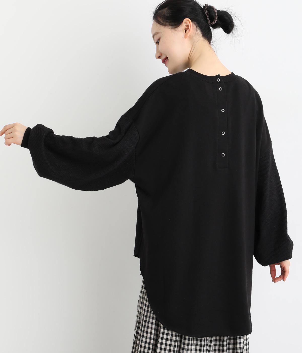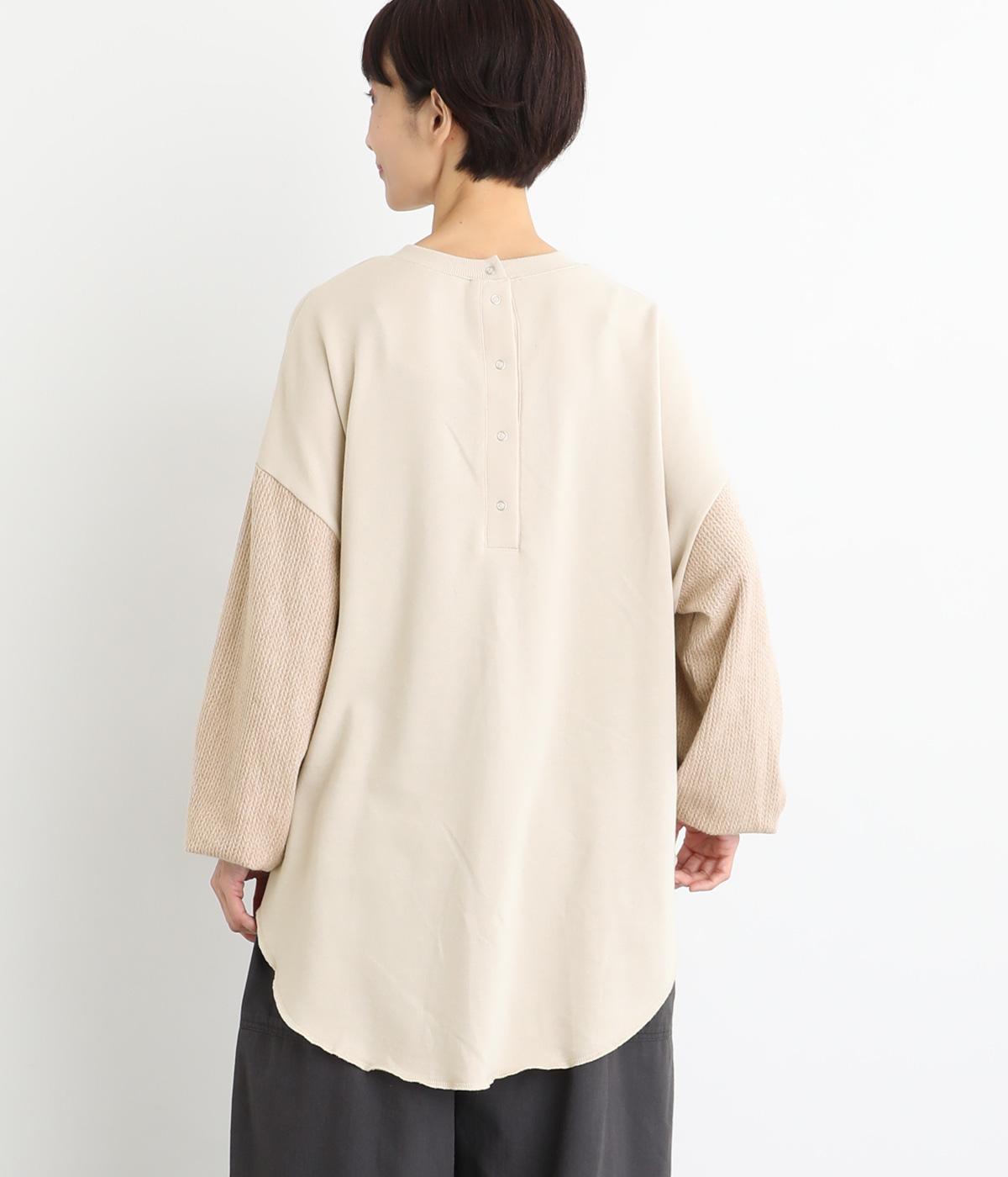 背中側にボタンをあしらったヘンリーチュニック。ボタンの開閉によって印象を変えることができ、適度に抜け感を出せるのが魅力。着脱もイージーにできます。裾はバックロングで、ヒップが隠れる丈感も◎。異素材ミックスの見た目がハイセンス。
