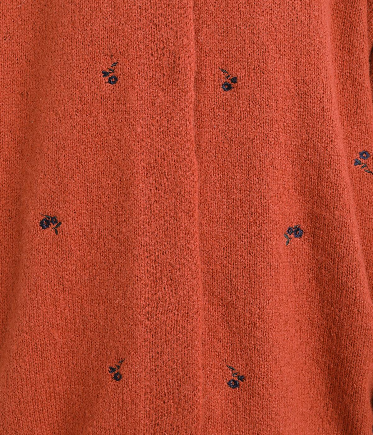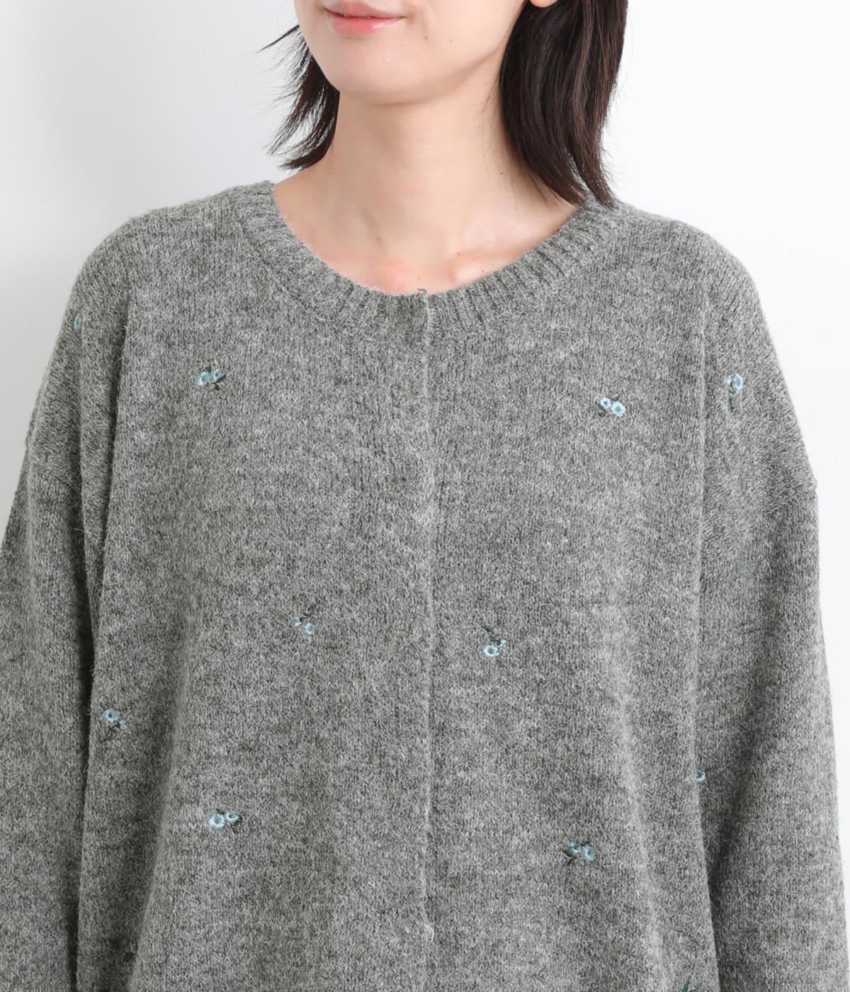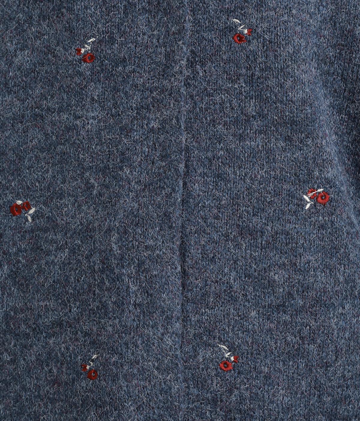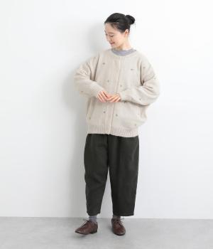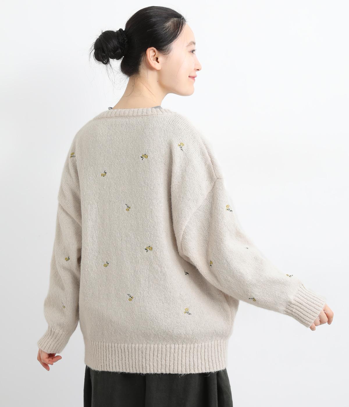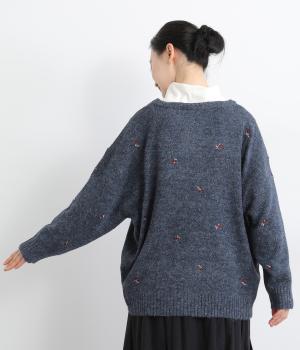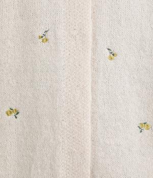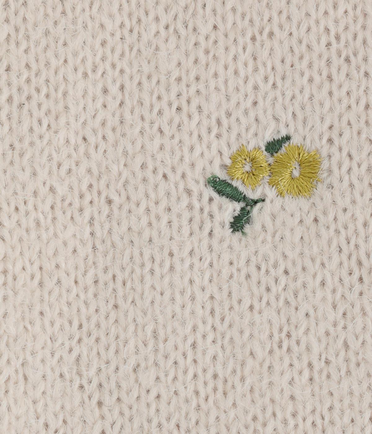 起毛感があり、あたたかみのある自然な風合いのニット生地です。軽やかでやわらかく体になじみ、やさしい着心地です。レトロでかわいらしい花柄の刺しゅうをところどころにほどこしました。