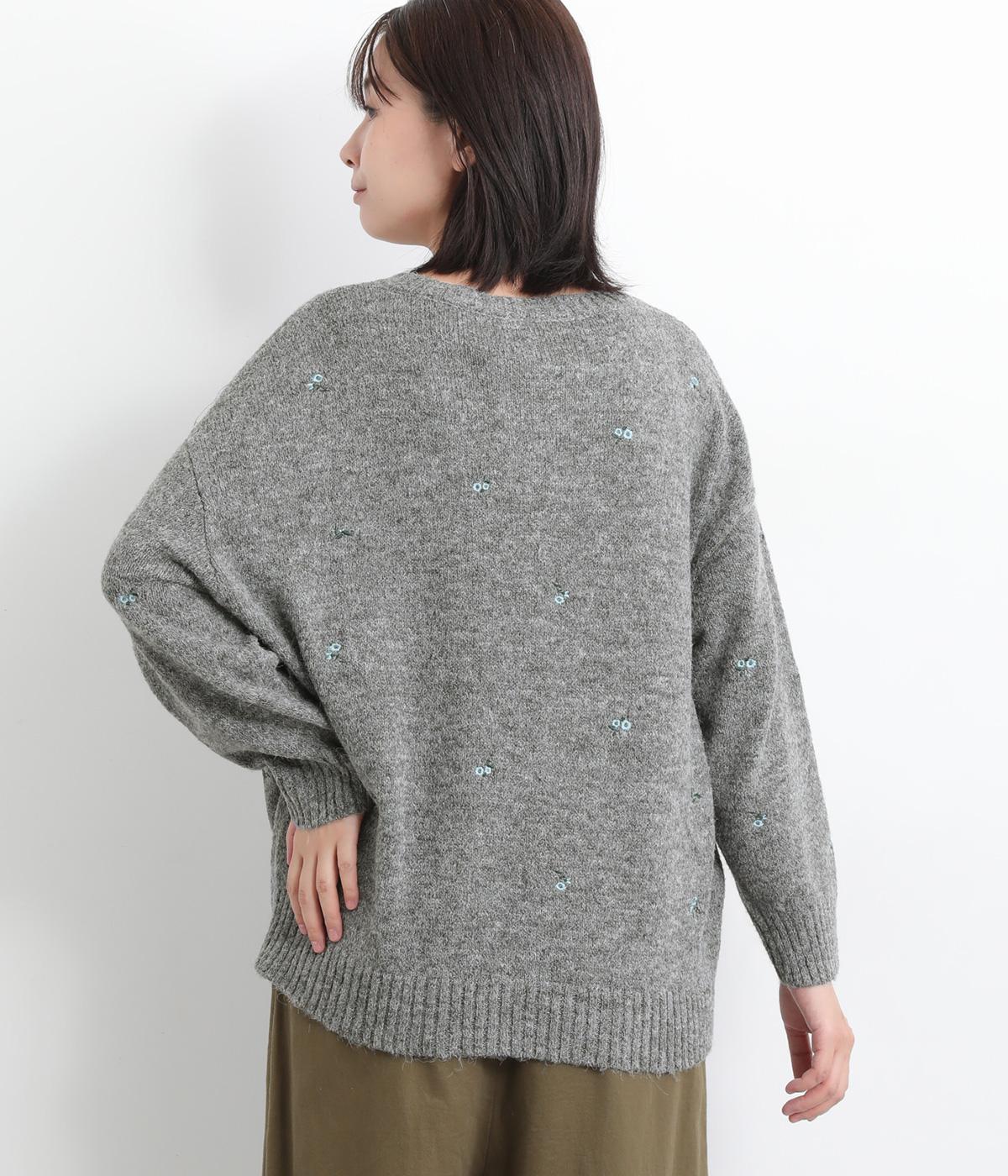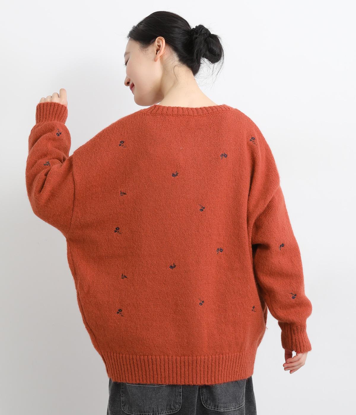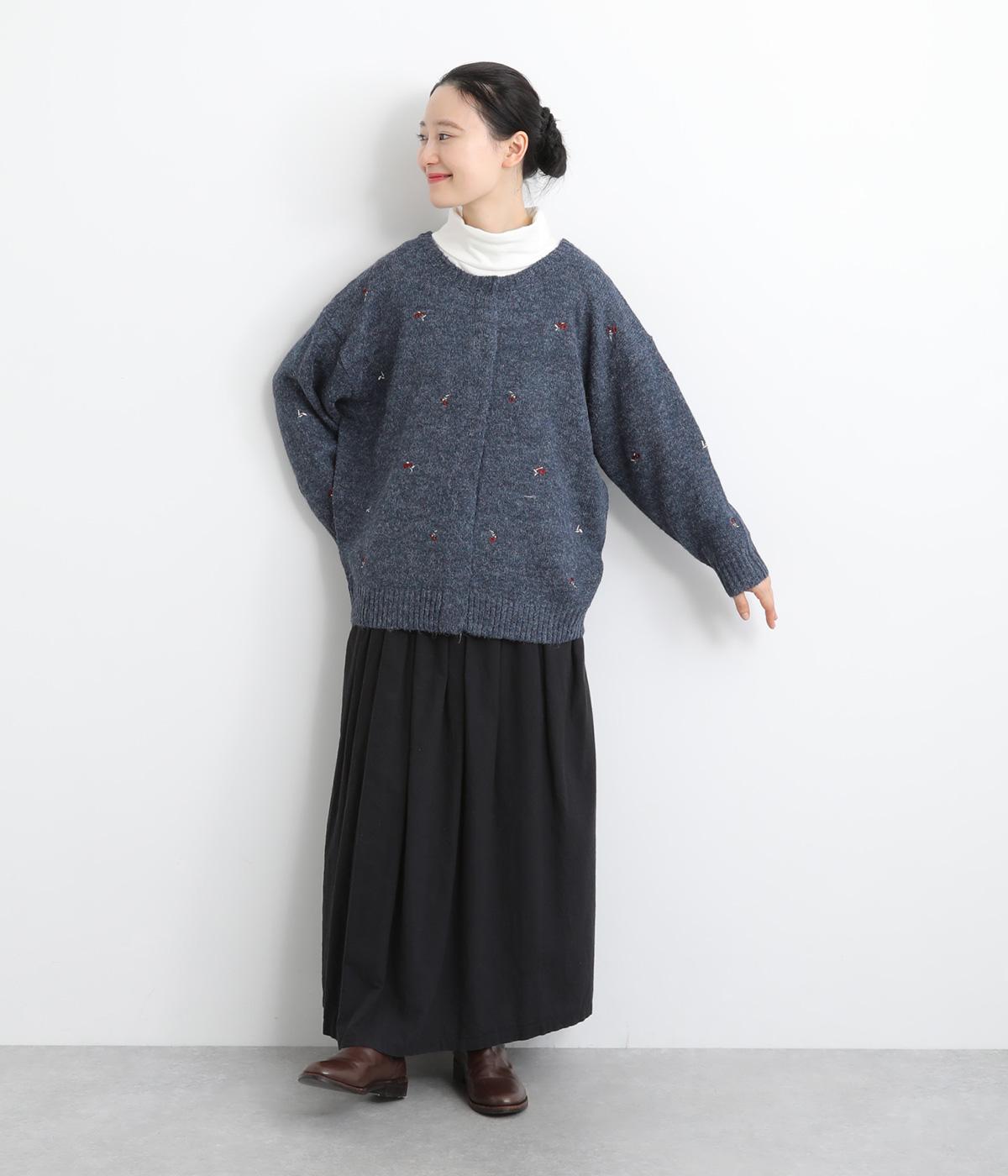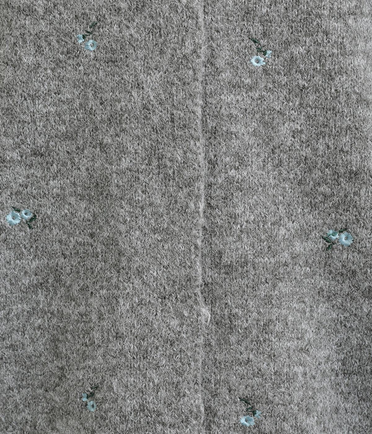 起毛感があり、あたたかみのある自然な風合いのニット生地です。軽やかでやわらかく体になじみ、やさしい着心地です。レトロでかわいらしい花柄の刺しゅうをところどころにほどこしました。