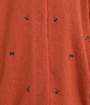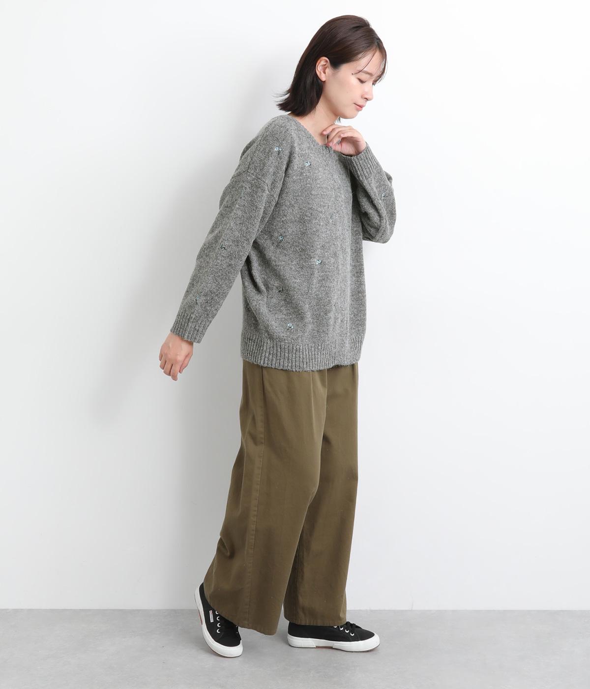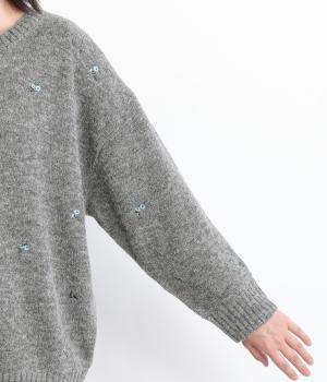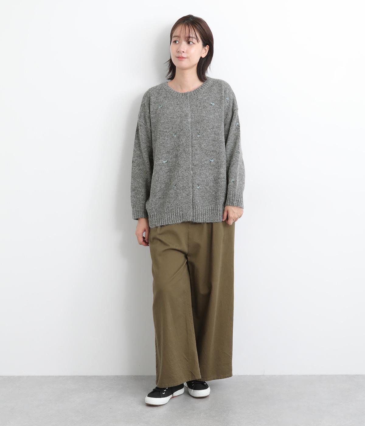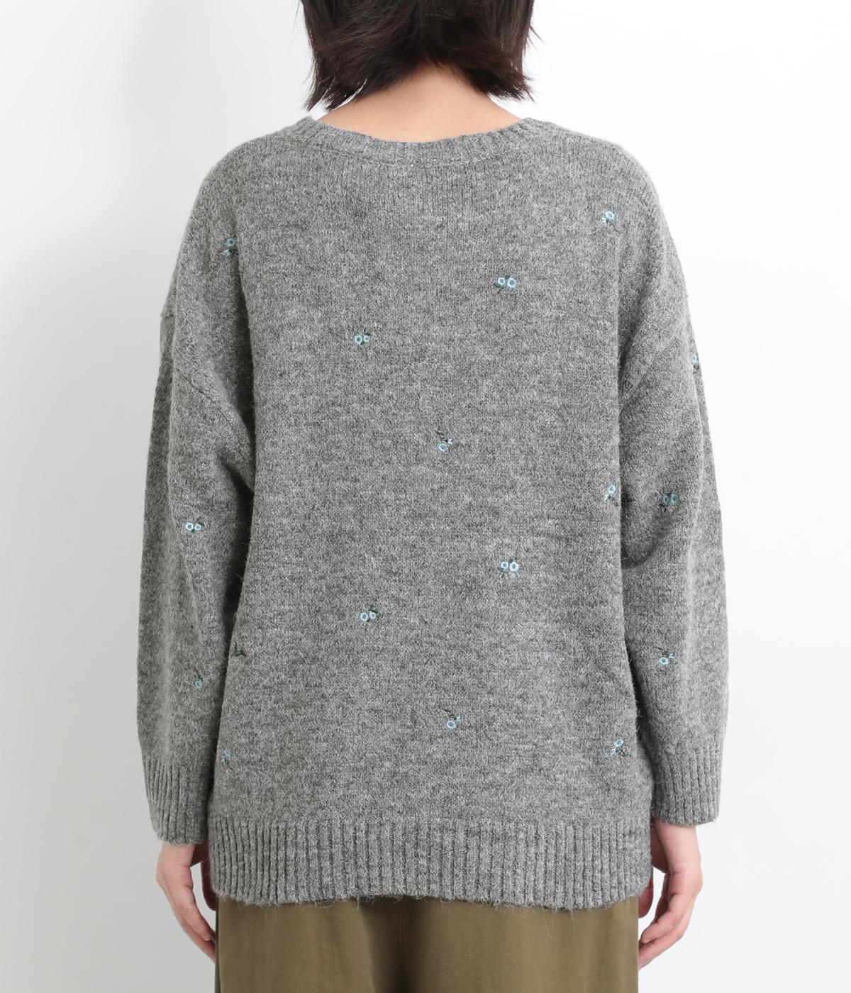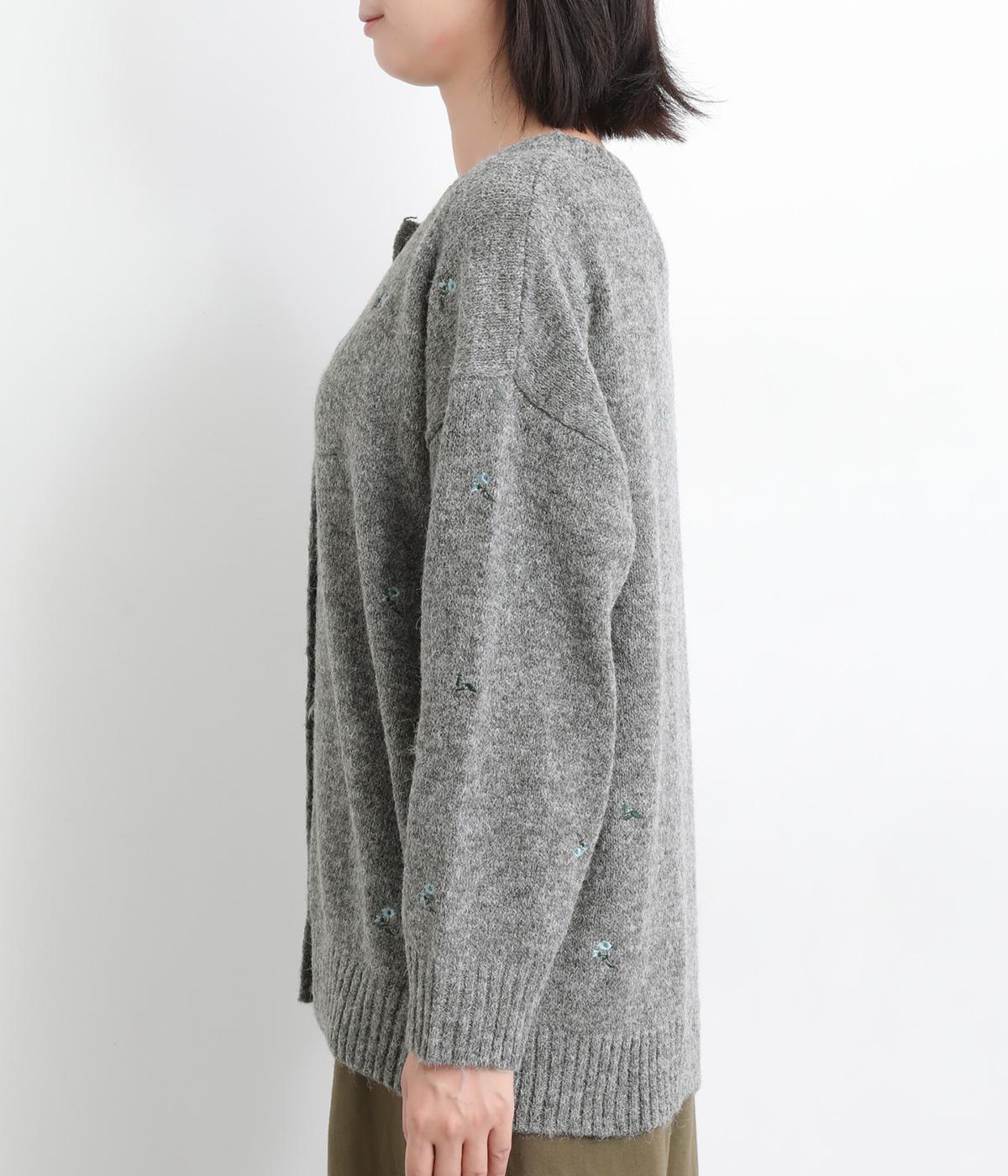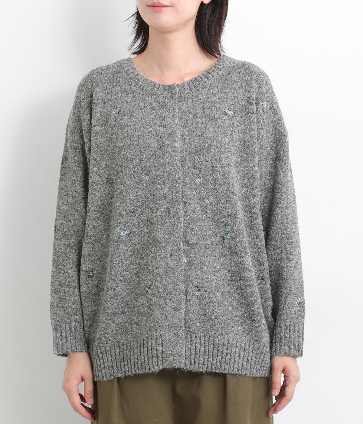 起毛感があり、あたたかみのある自然な風合いのニット生地です。軽やかでやわらかく体になじみ、やさしい着心地です。レトロでかわいらしい花柄の刺しゅうをところどころにほどこしました。