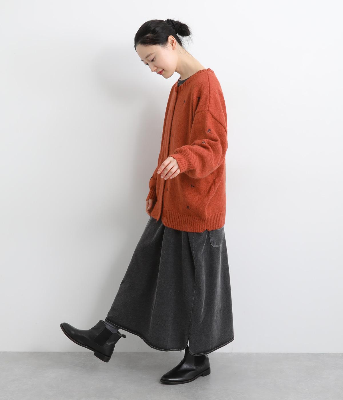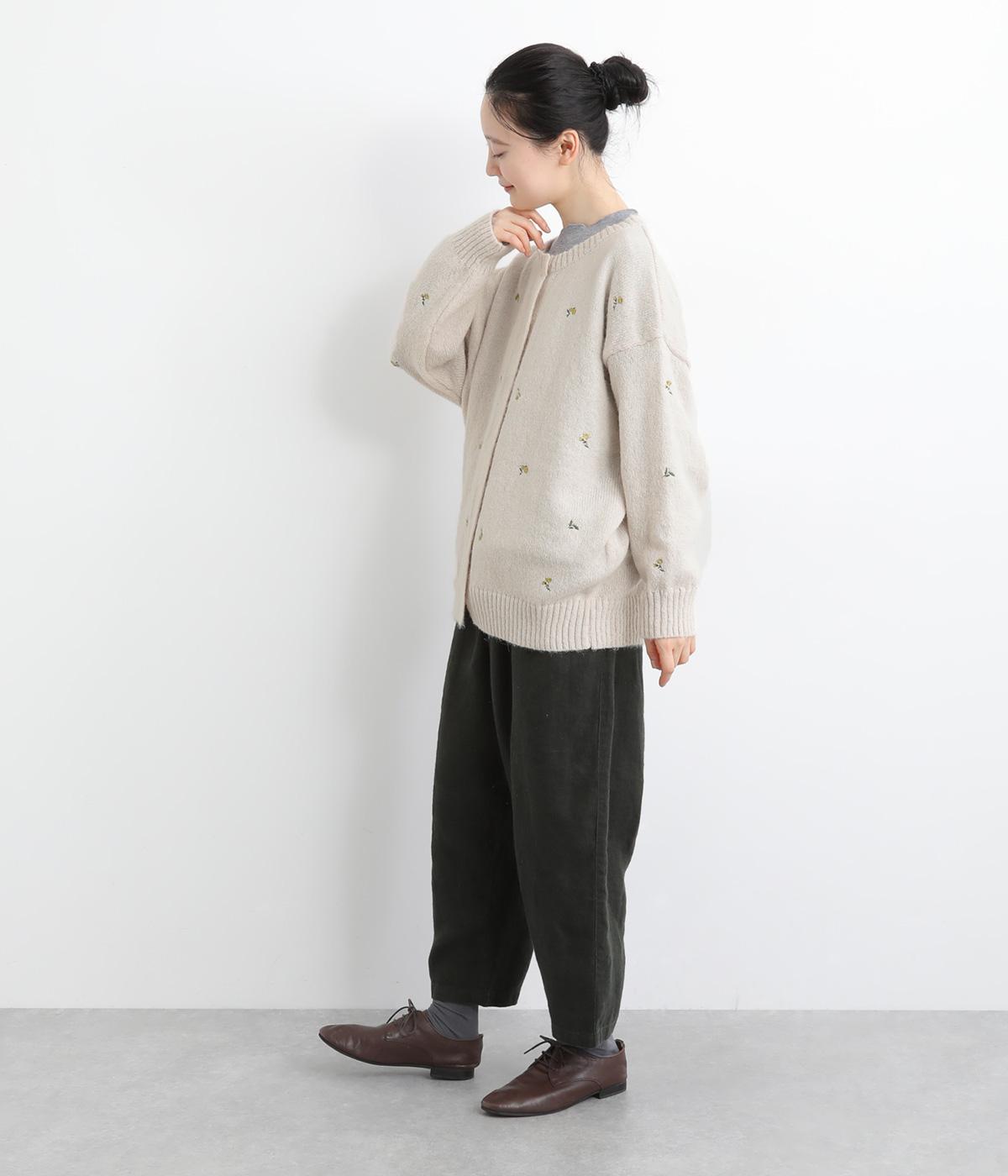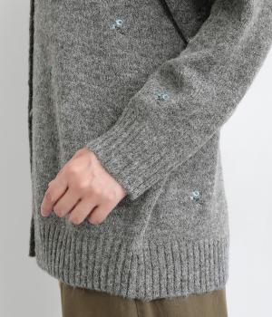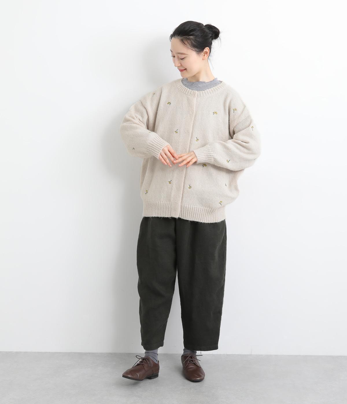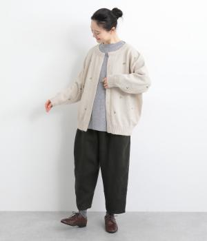かわいらしい花柄刺しゅうとあたたかみのある素材感で素朴な風合いに仕上がりました。前開きボタンは比翼仕立てですっきりと見せ、ボタンを開けて羽織ってもサマになります。ゆったりとしたシルエットと長めの丈でリラックス感のある着心地です。