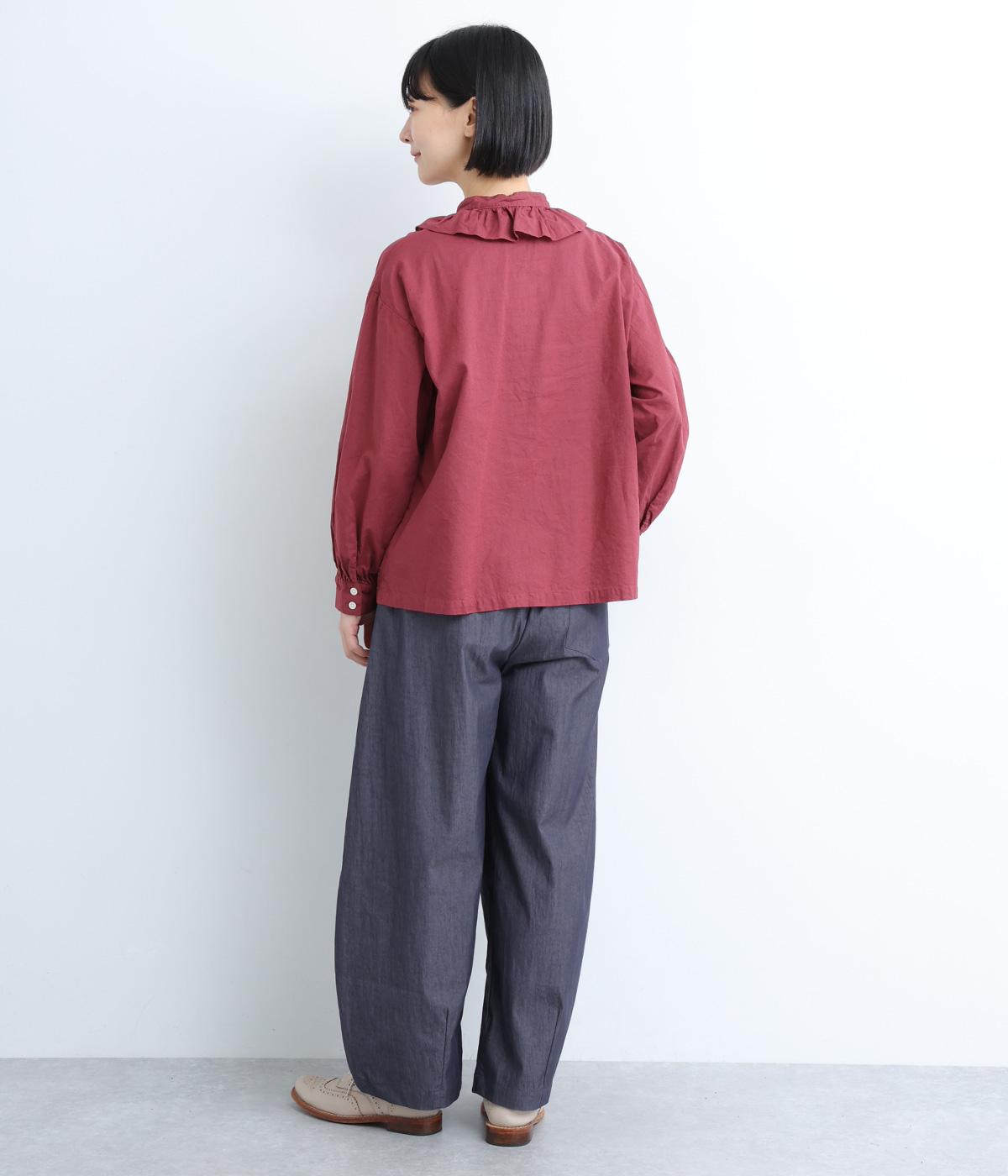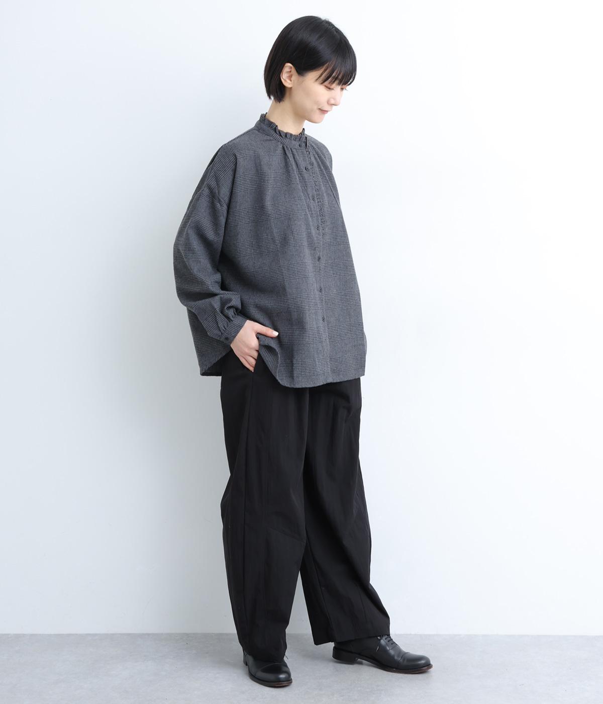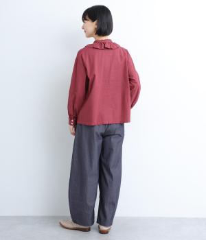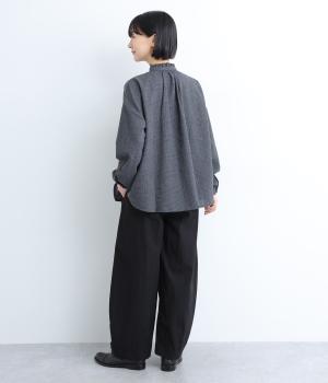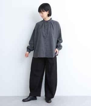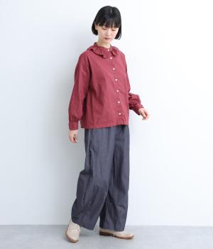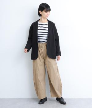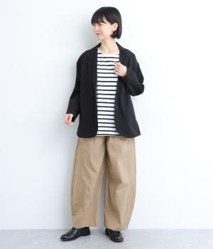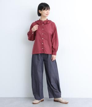 切り替えやダーツでふっくらとした立体的なシルエットを描きました。シンプルな合わせでもニュアンスのきいたお洒落なスタイリングが完成。ウエストは総ゴム+内紐のイージー仕様。フリルベルトを活かしたトップスインもおすすめ。