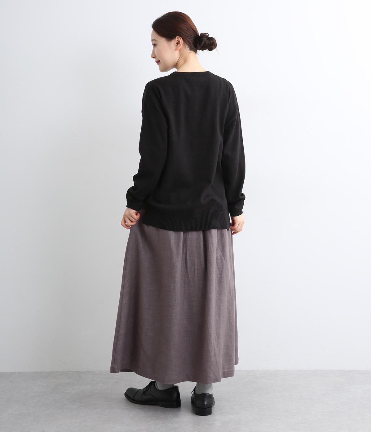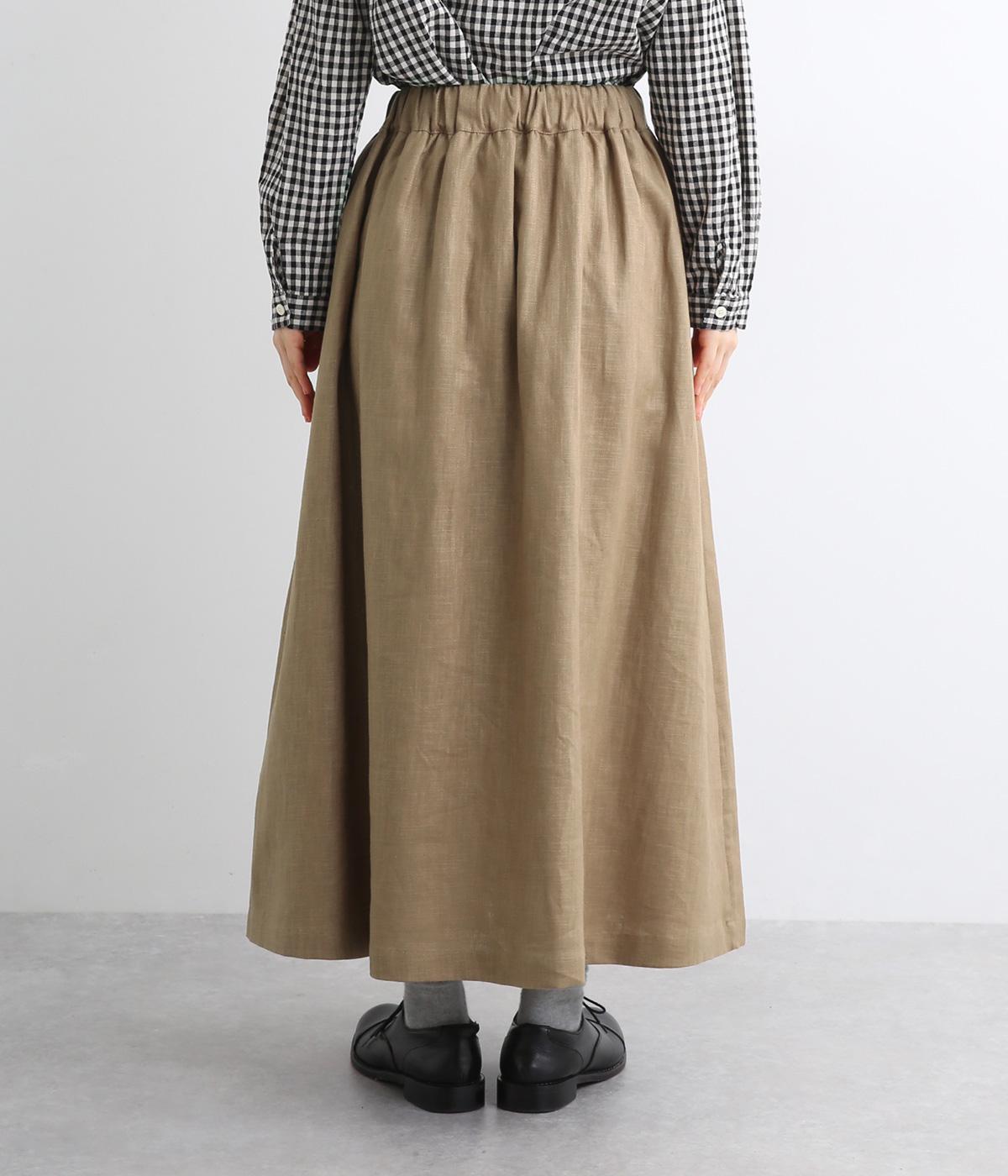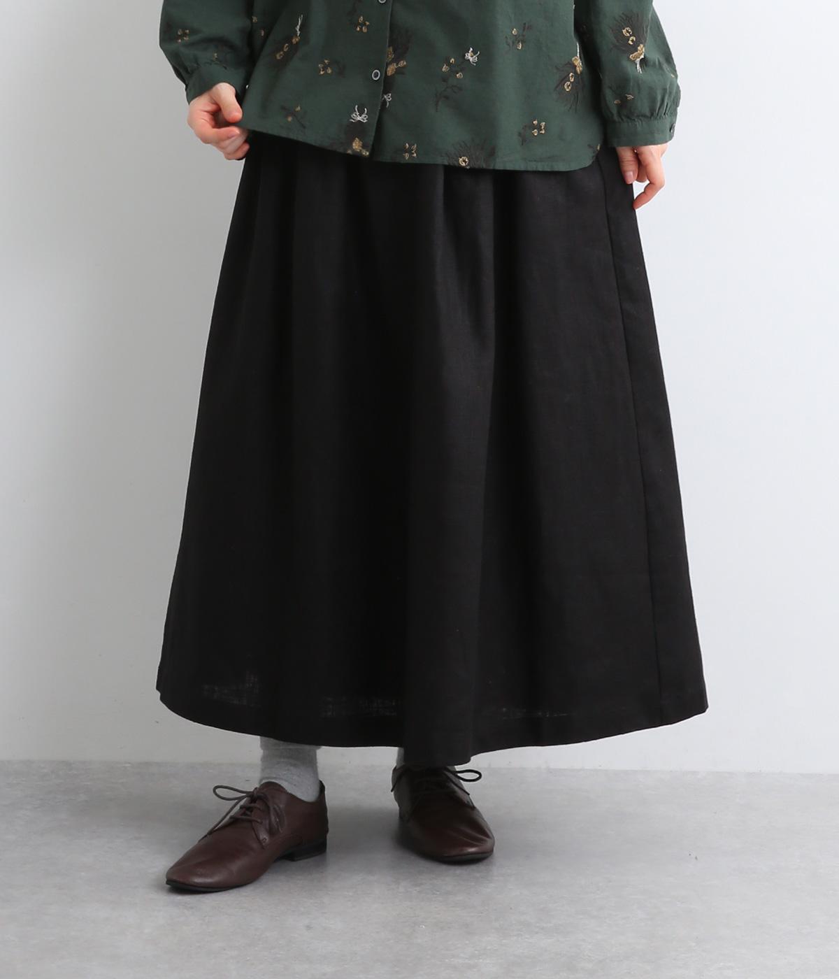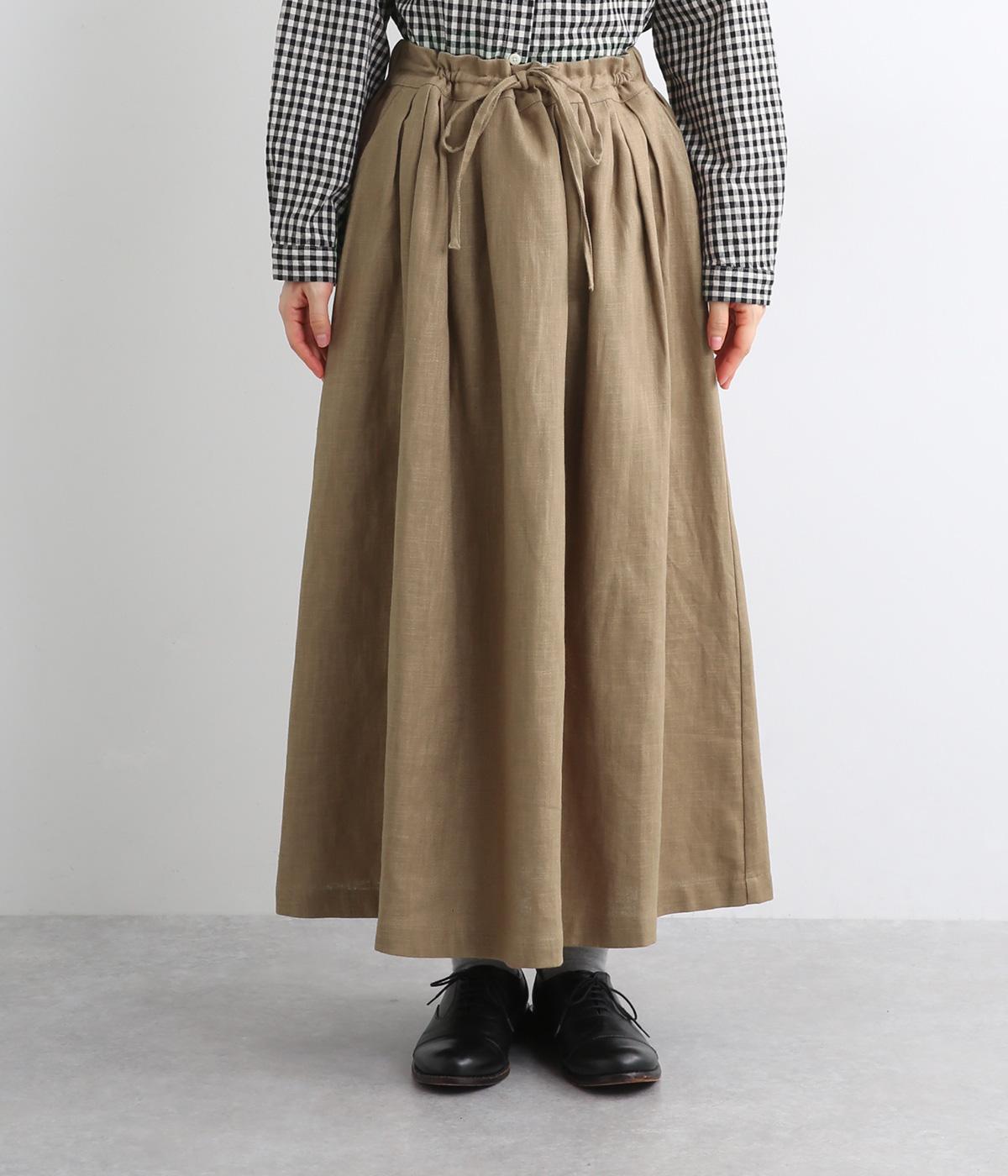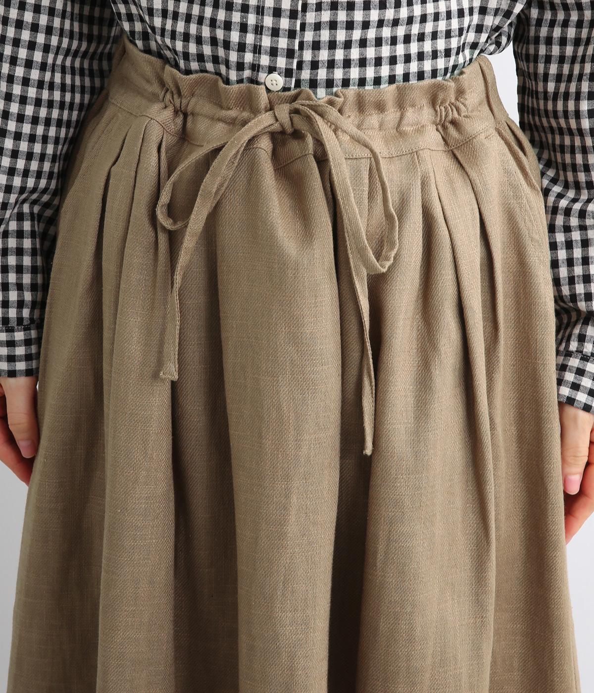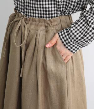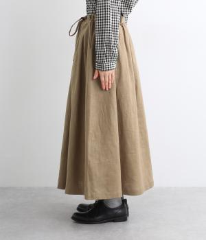 ランダムにタックが入ったロング丈のスカートです。きれいな落ち感が大人らしい品を演出します。ウエストはゴム仕様で調整用のリボンもアクセントに。同素材のショートジャケットとのセットアップがおすすめです。