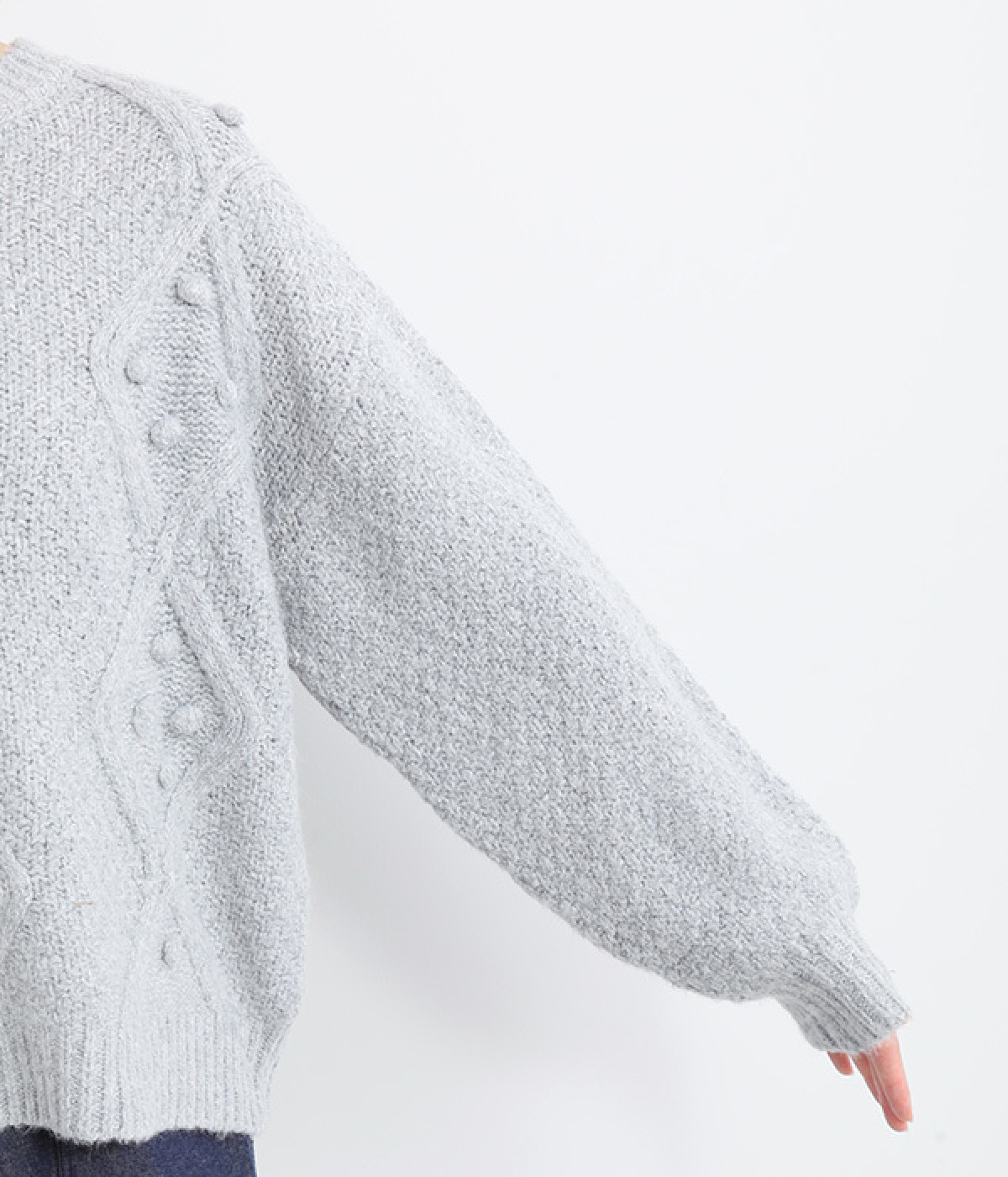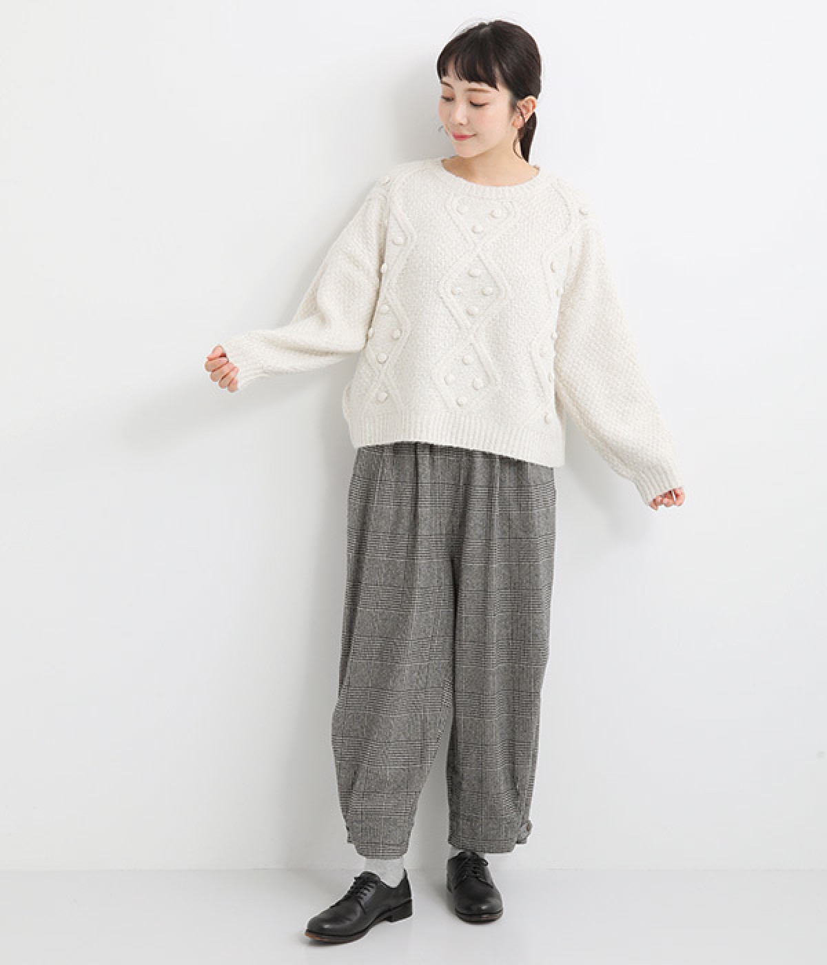ダイヤ編みの内側にあしらったポンポンがポイント