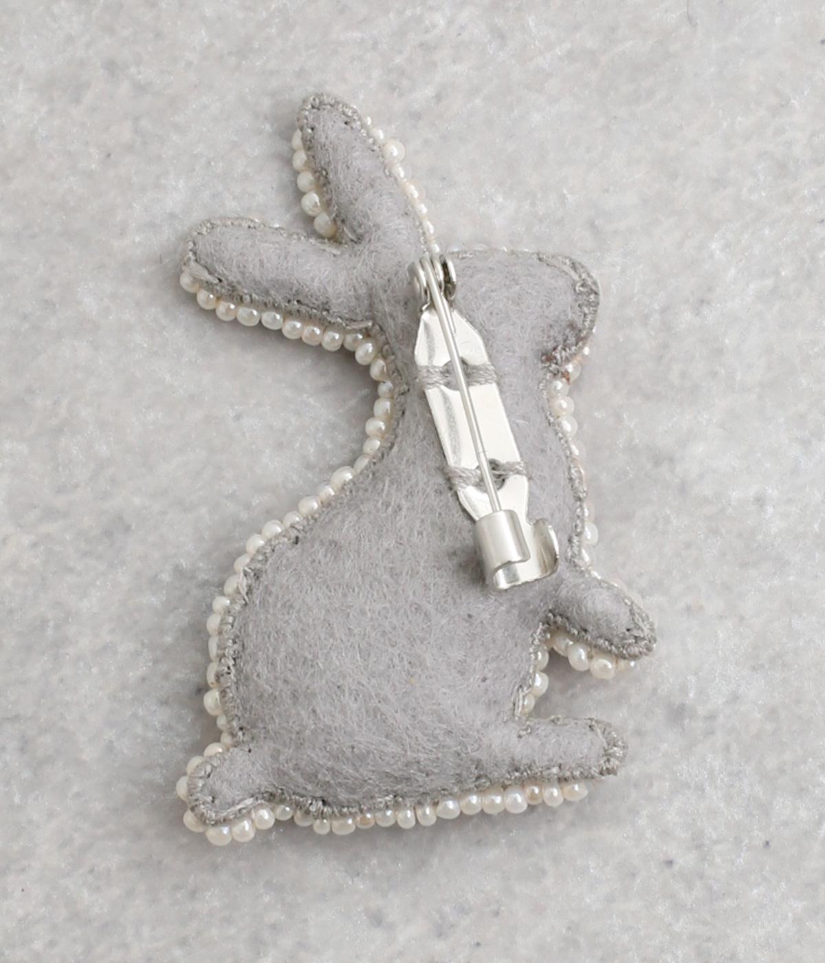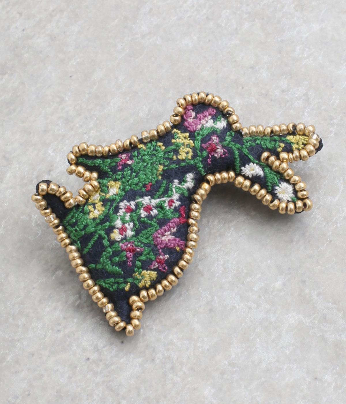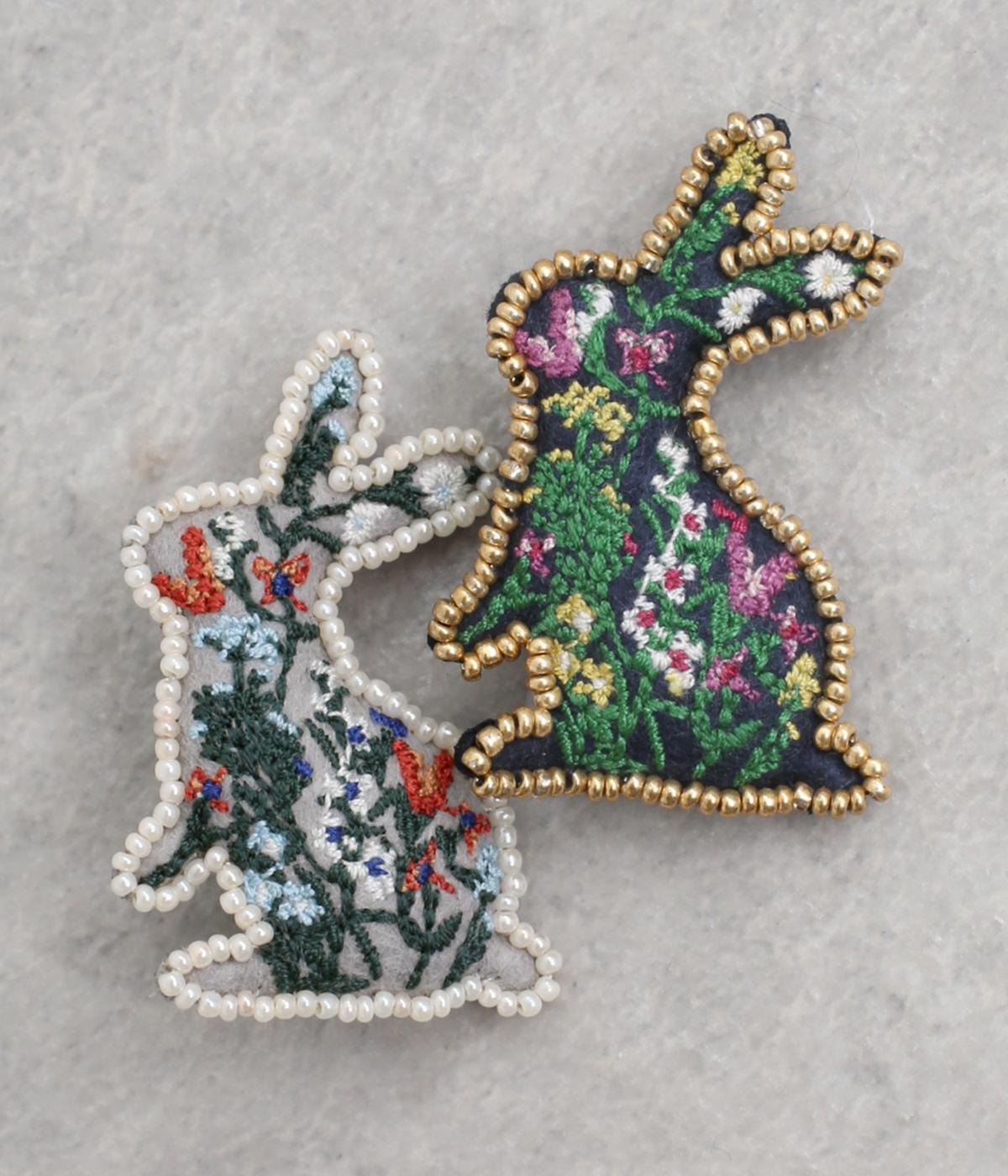 愛らしいうさぎとカラフルな草花の刺しゅうが遊び心いっぱいのブローチ。まわりのガラスビーズでさらに華やか西上がっています。コートやトップス、バッグなど、つけるだけでアクセントになってくれます。
