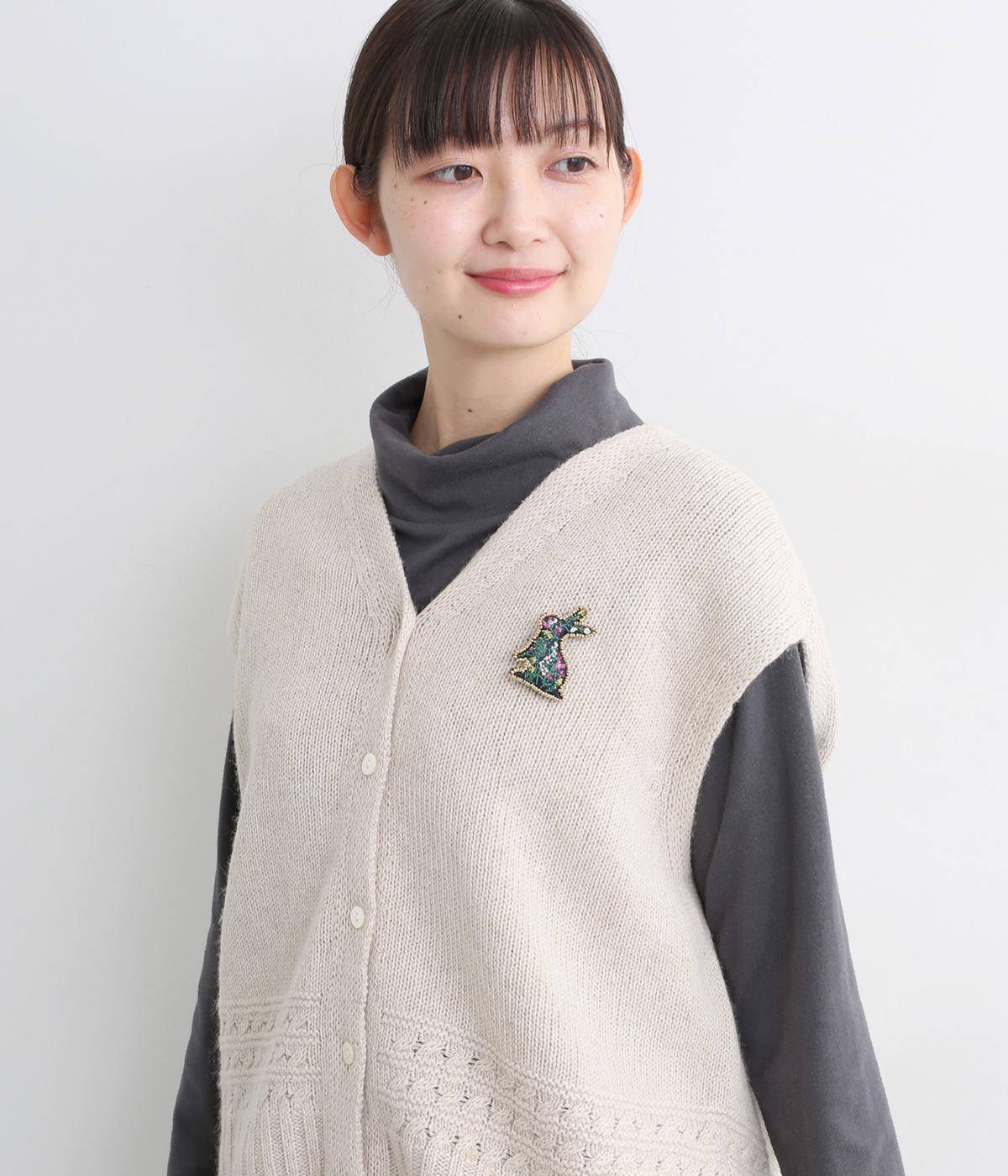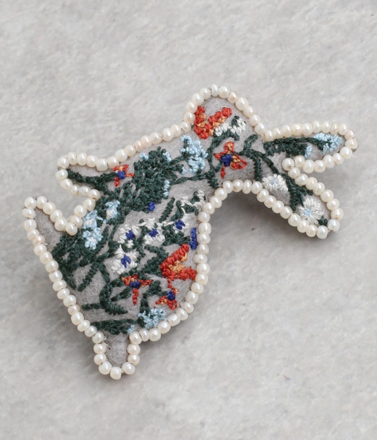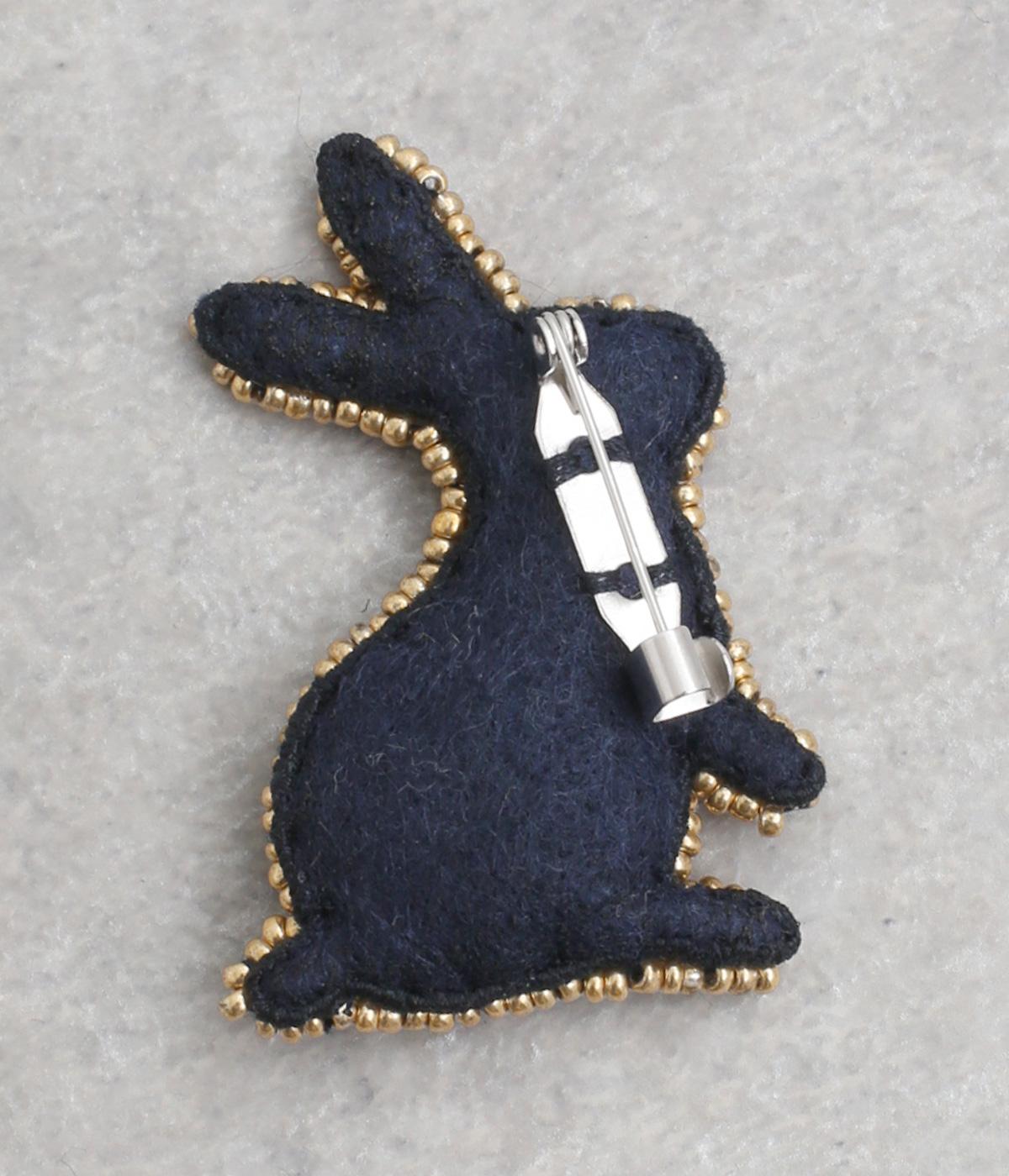 愛らしいうさぎとカラフルな草花の刺しゅうが遊び心いっぱいのブローチ。まわりのガラスビーズでさらに華やか西上がっています。コートやトップス、バッグなど、つけるだけでアクセントになってくれます。