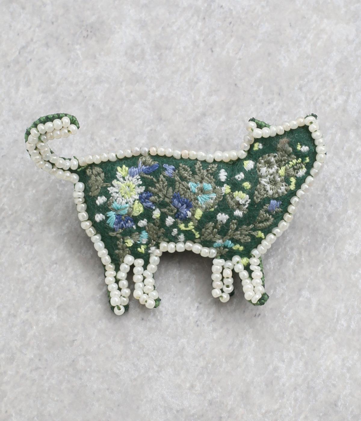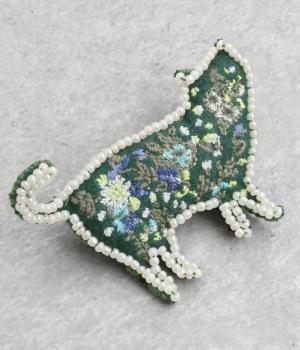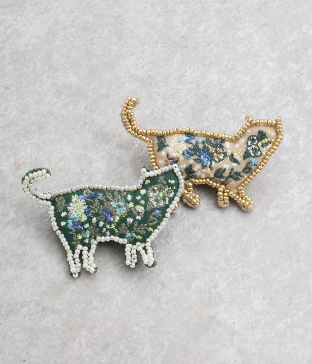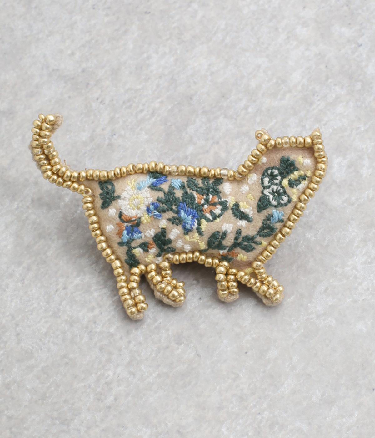 ネコのシルエットに細やかなお花&ドット刺しゅうをほどこしました。ガラスビーズのパイピングが、大人の上品さを醸し出します。