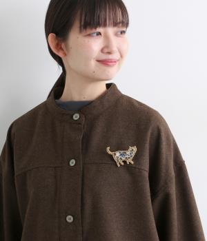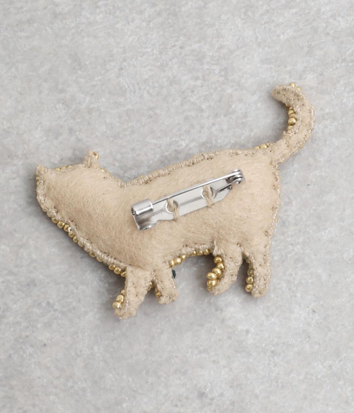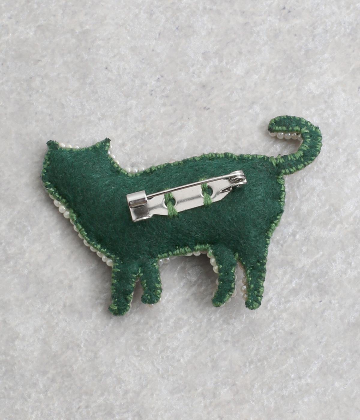 あたたかみあるフェルト地に、繊細な刺しゅうが映えるネコ型のブローチ。シャープな作りで、よりリアルなシルエットを意識しました。トップスの胸もとやバッグなど、好きなところにつけて楽しみたいアイテム。