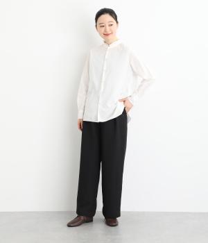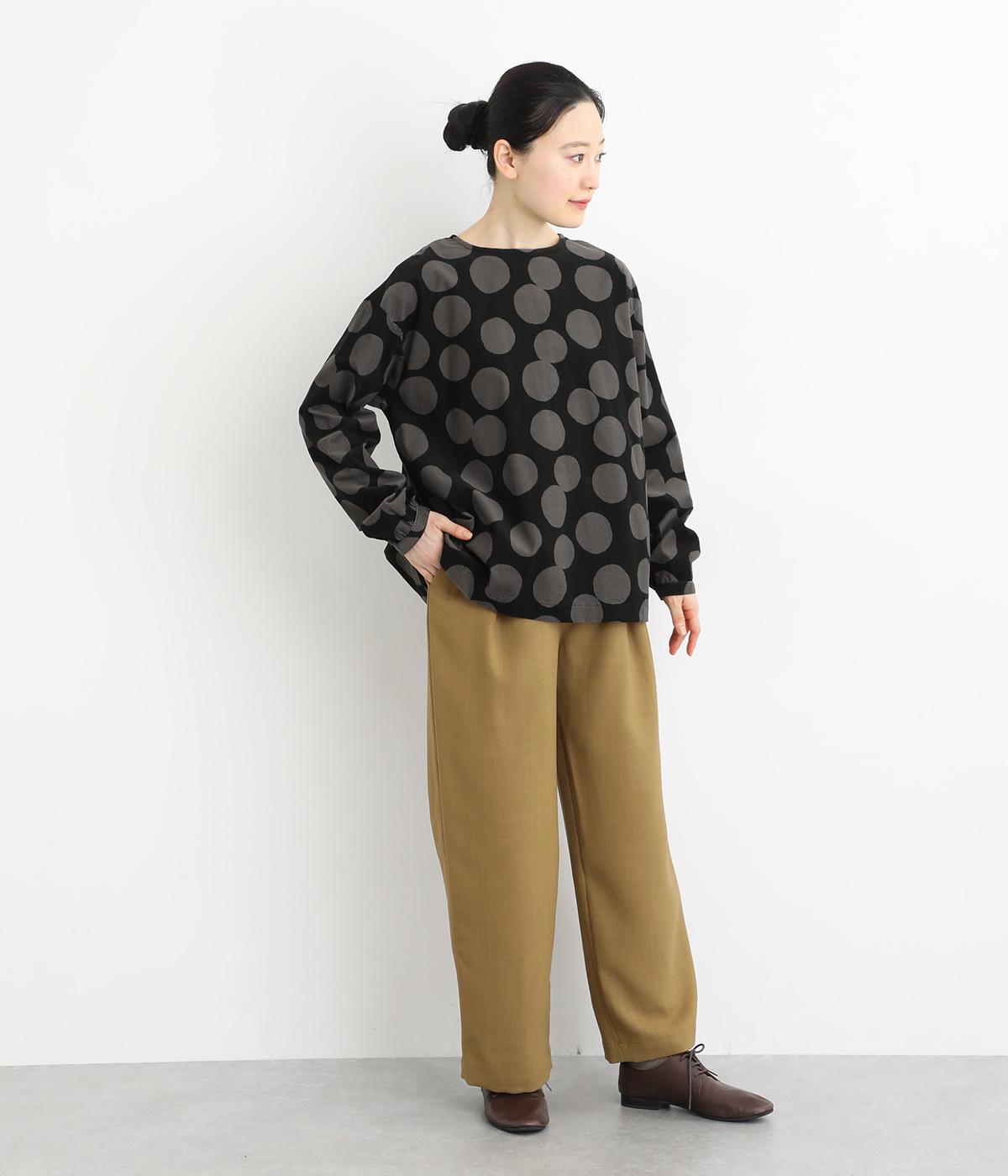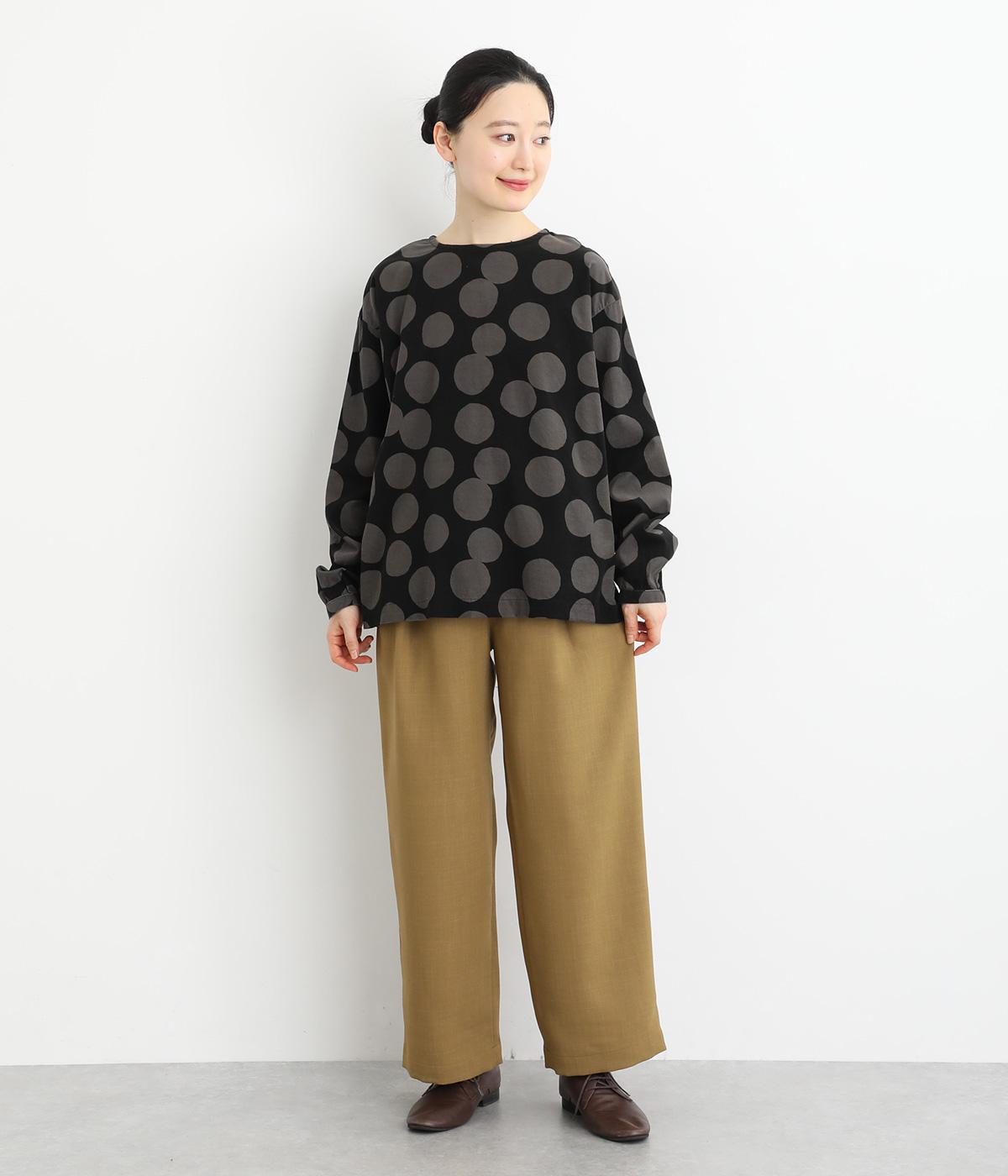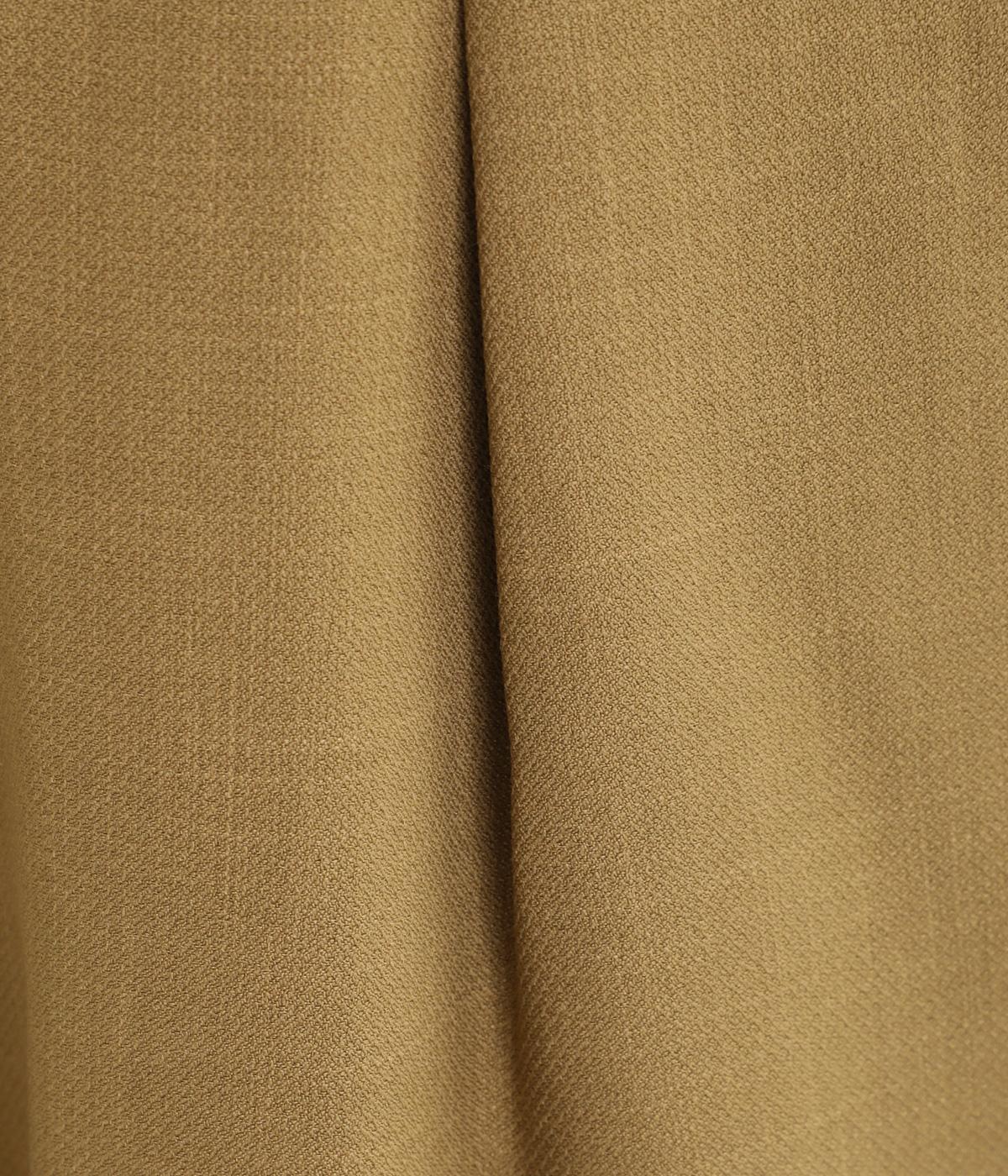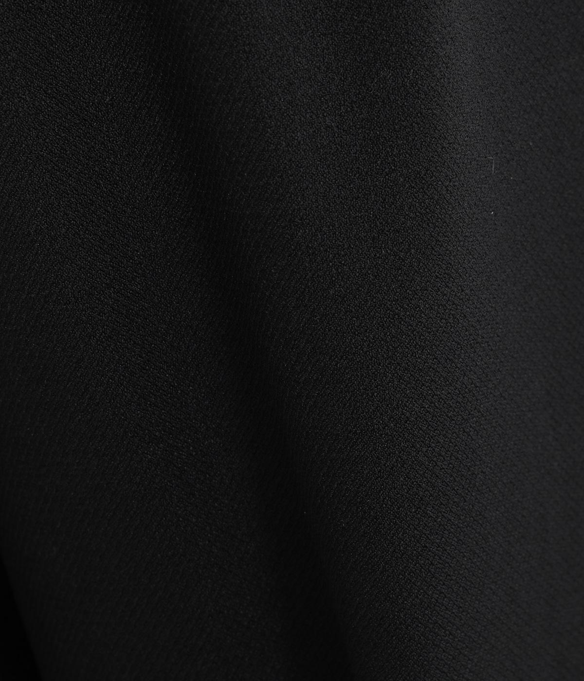 さらりとしたタッチで扱いやすい、ポリエステル生地を使用しました。シワになりにくいので、扱いやすいのもうれしいポイント。ほんのり光沢をまとった織りの表情が、きちんと感を添えてくれます。