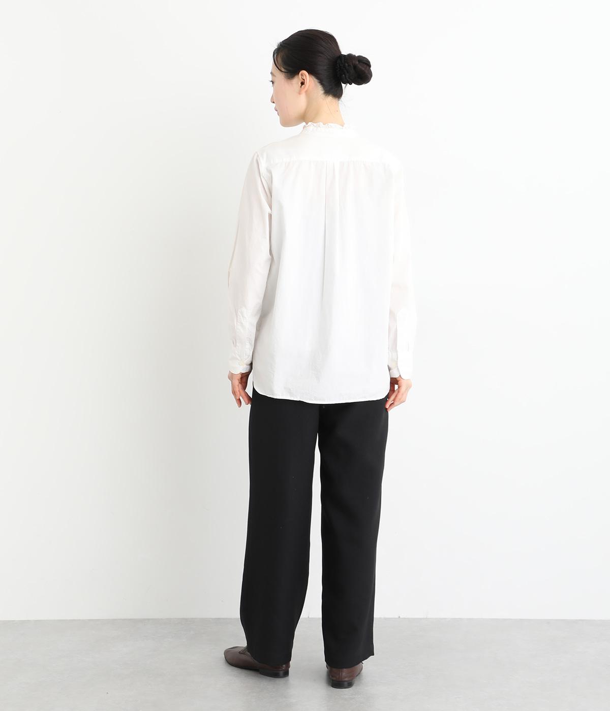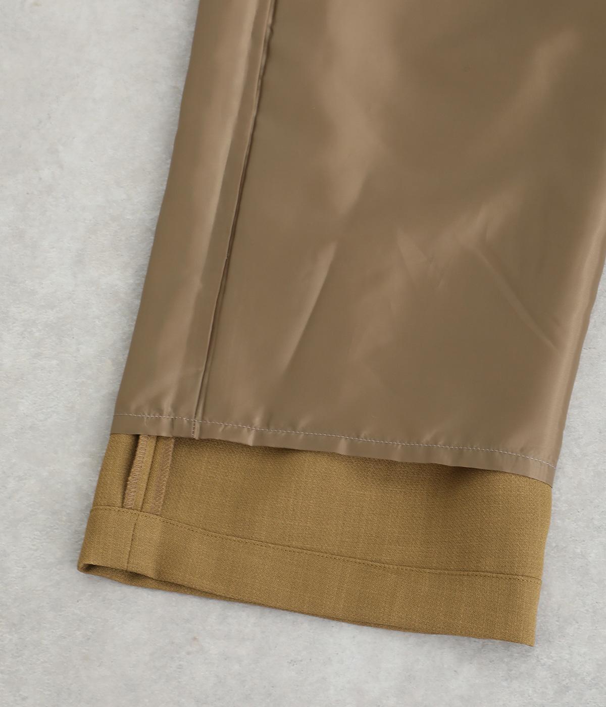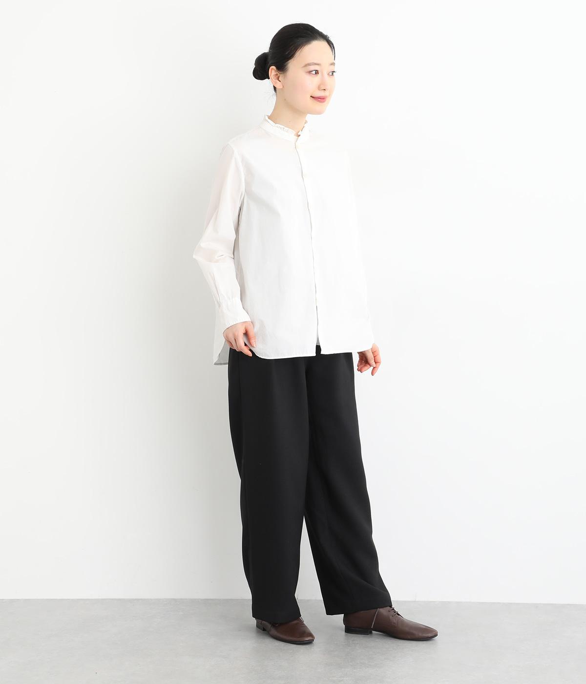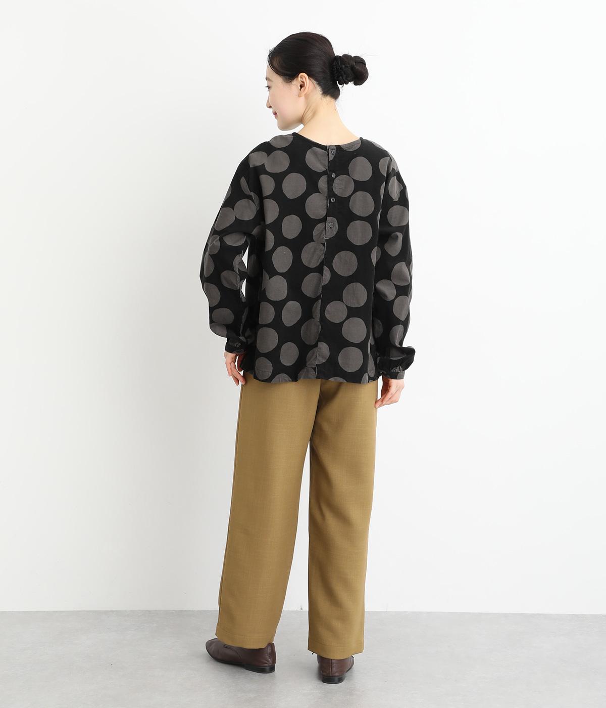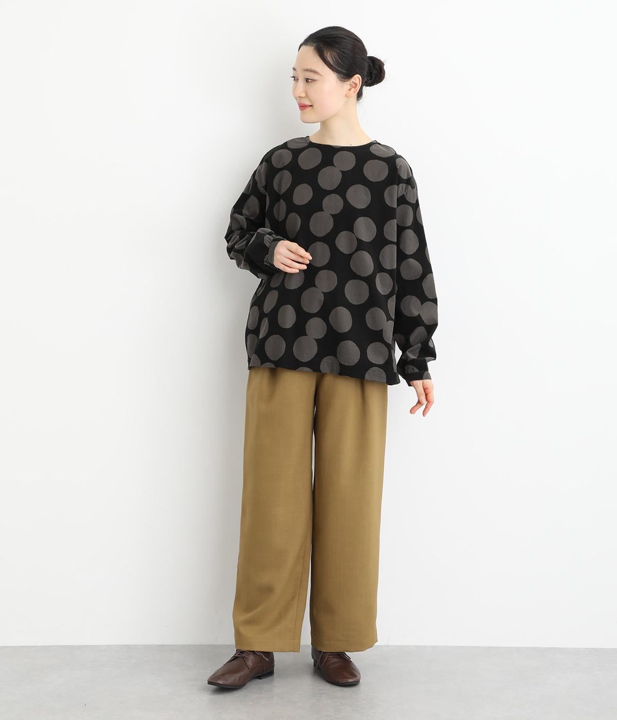 さらりとしたタッチで扱いやすい、ポリエステル生地を使用しました。シワになりにくいので、扱いやすいのもうれしいポイント。ほんのり光沢をまとった織りの表情が、きちんと感を添えてくれます。