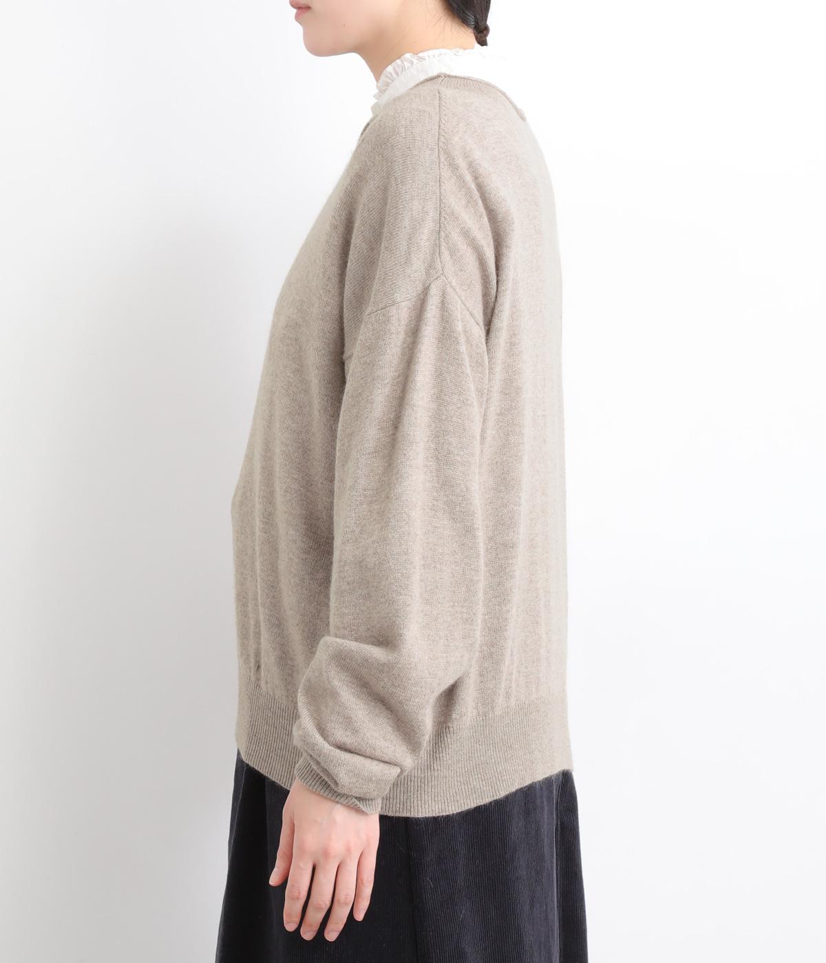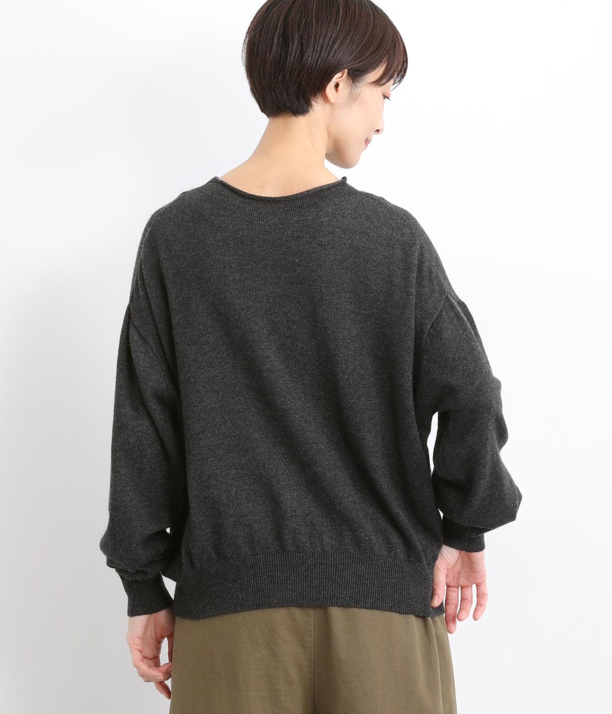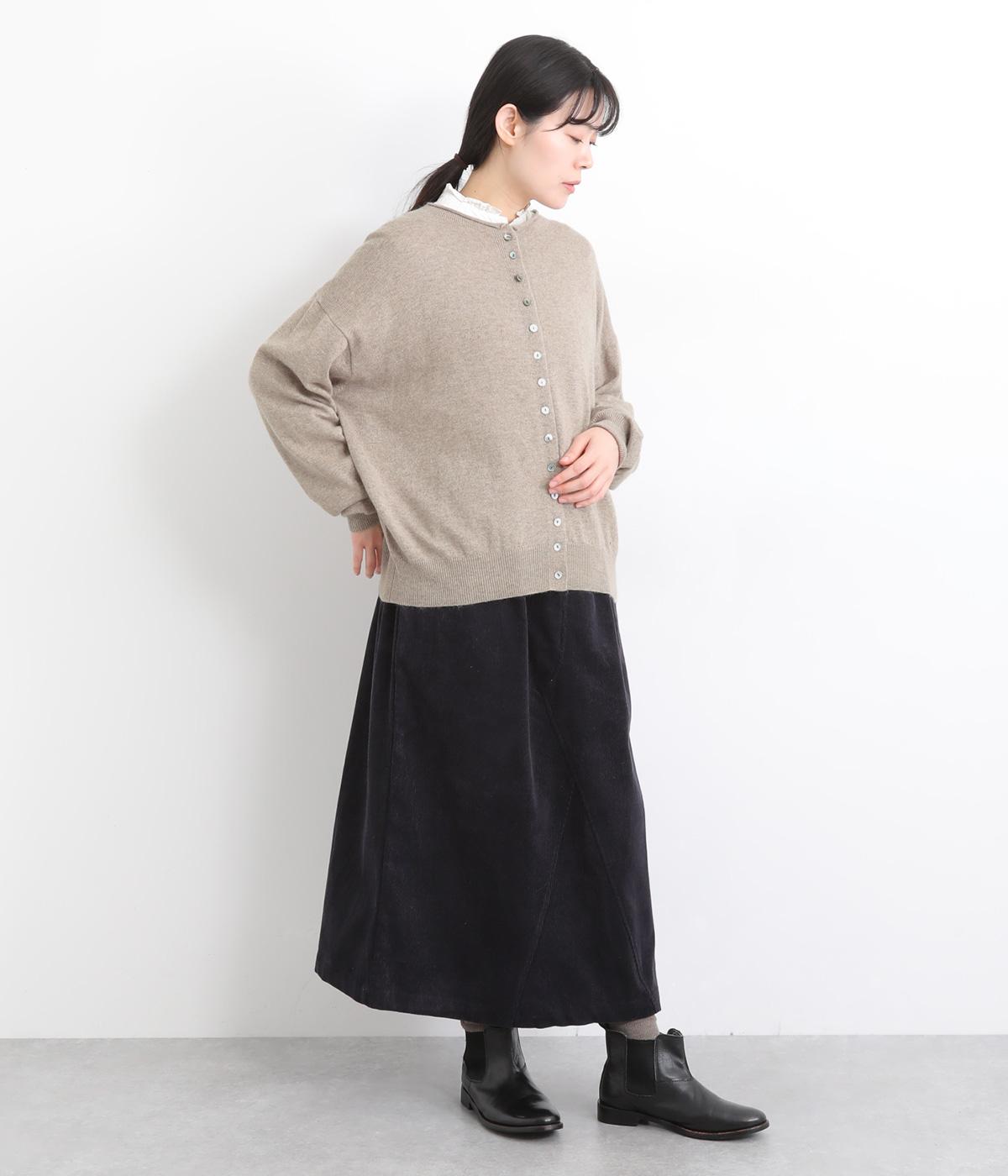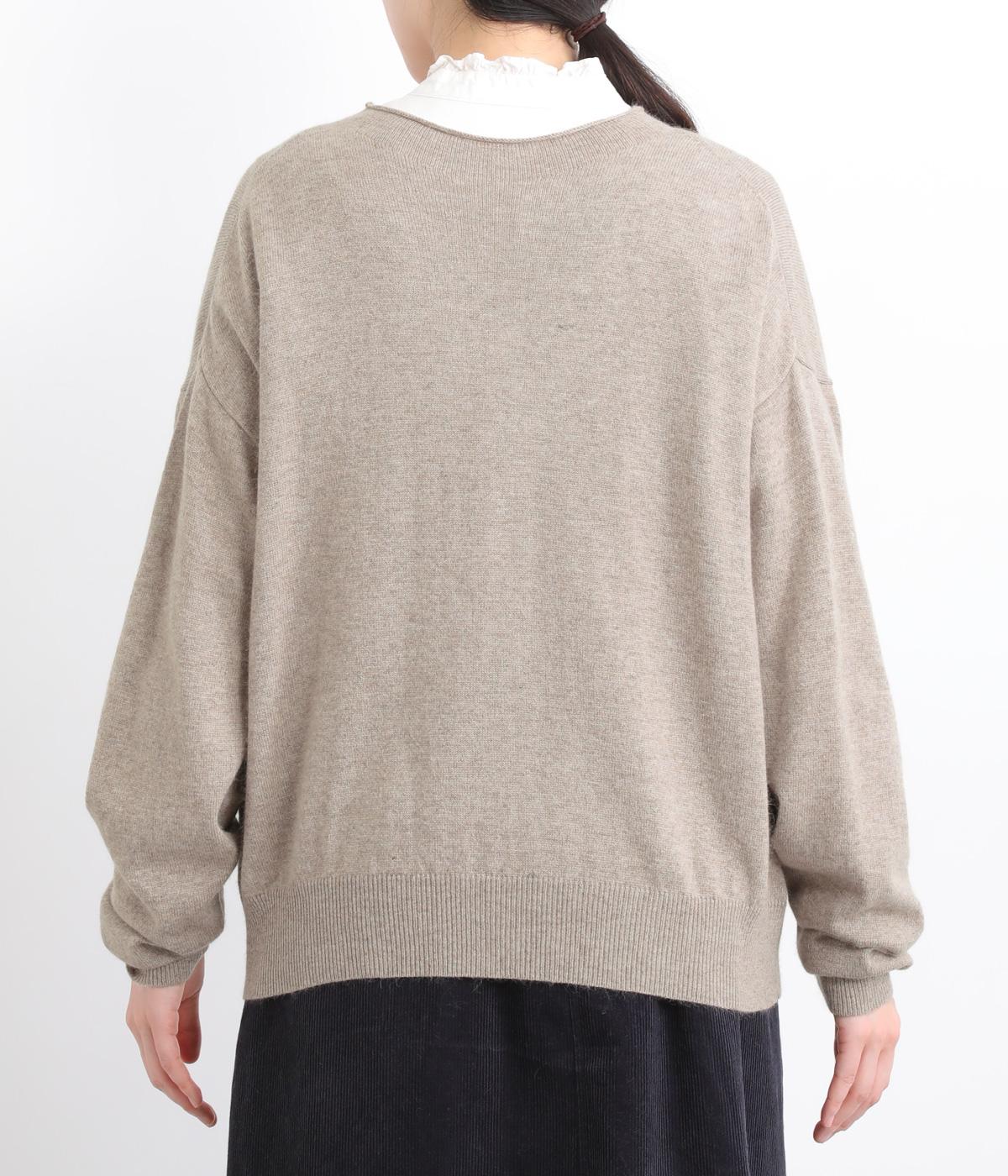 レーヨンやアンゴラ、ウールをまぜたリッチ感のあるソフトニットを使用しています。やわらかで伸びも良く、肉厚すぎないので羽織り合わせもしやすい生地感です。