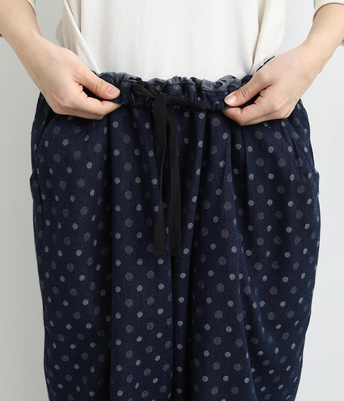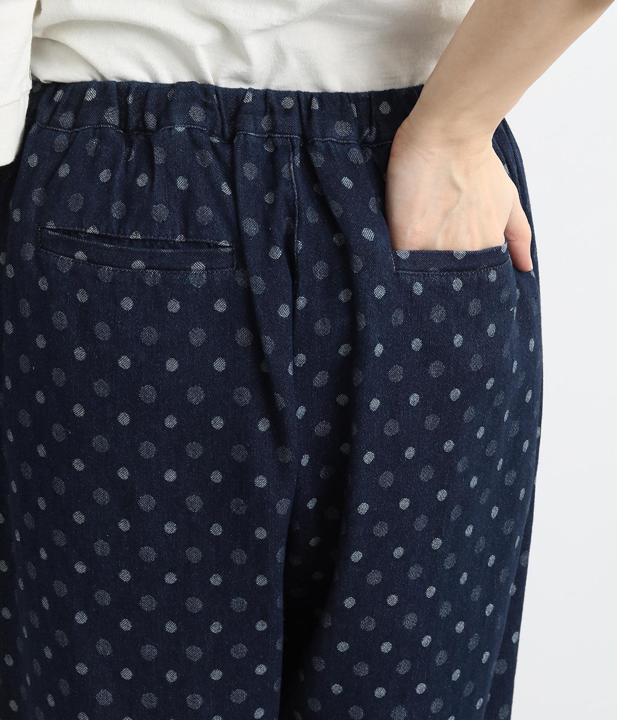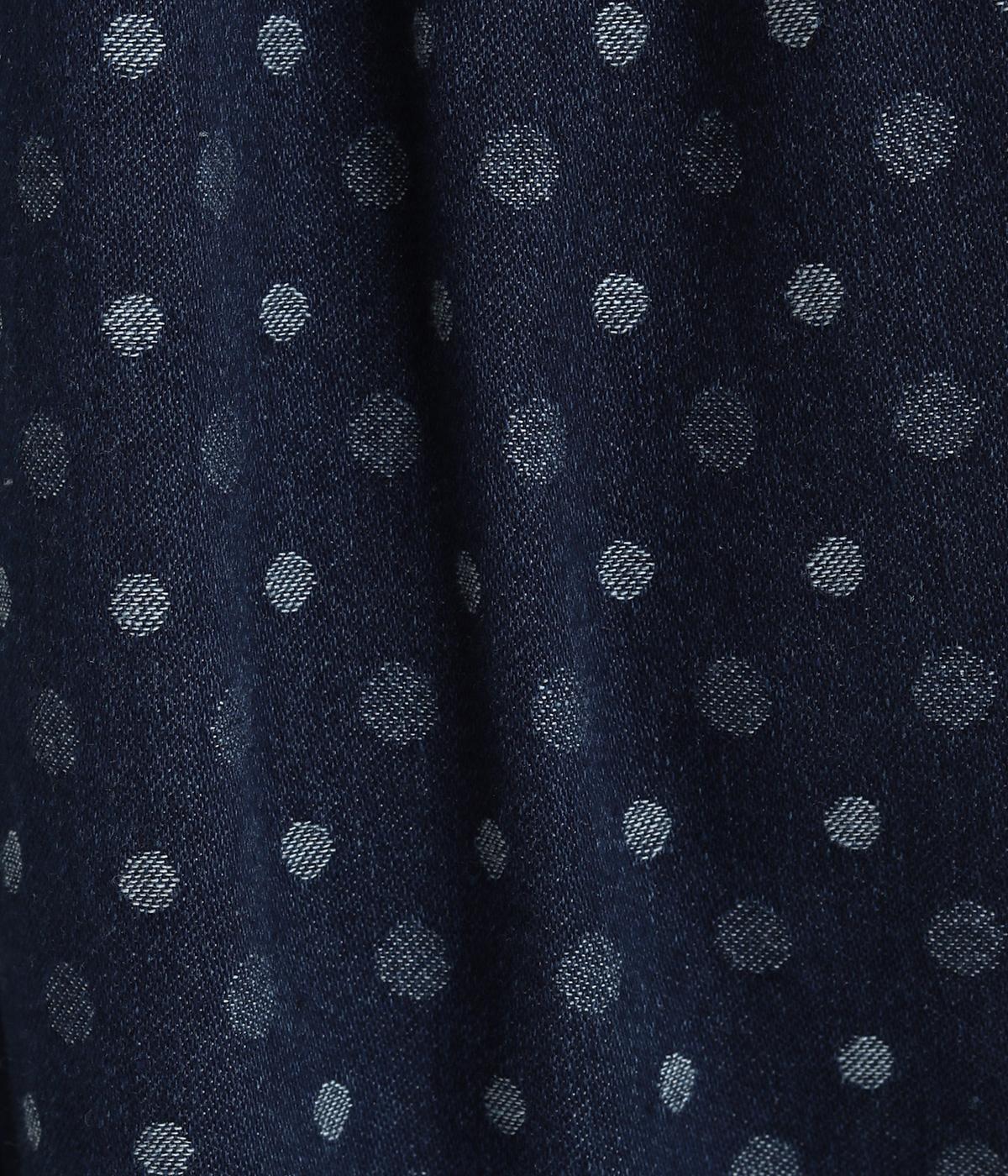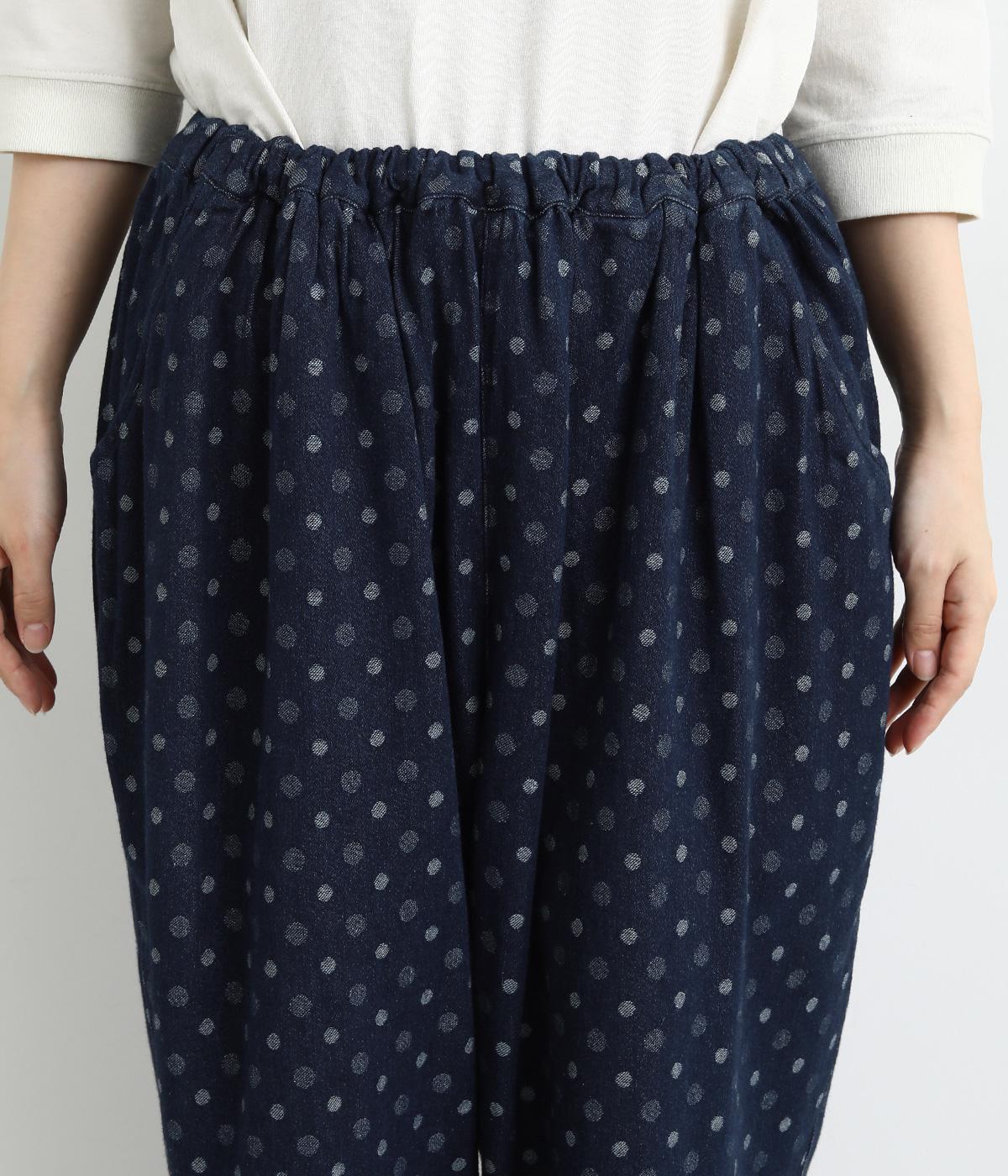 穿きはじめからやさしくなじむ、とてもやわらかな風合いのコットンデニム。ジャカード織りで表現されたドット柄が、さりげなくも目をひくポイントに。通年対応の素材で、一枚あると重宝します。
