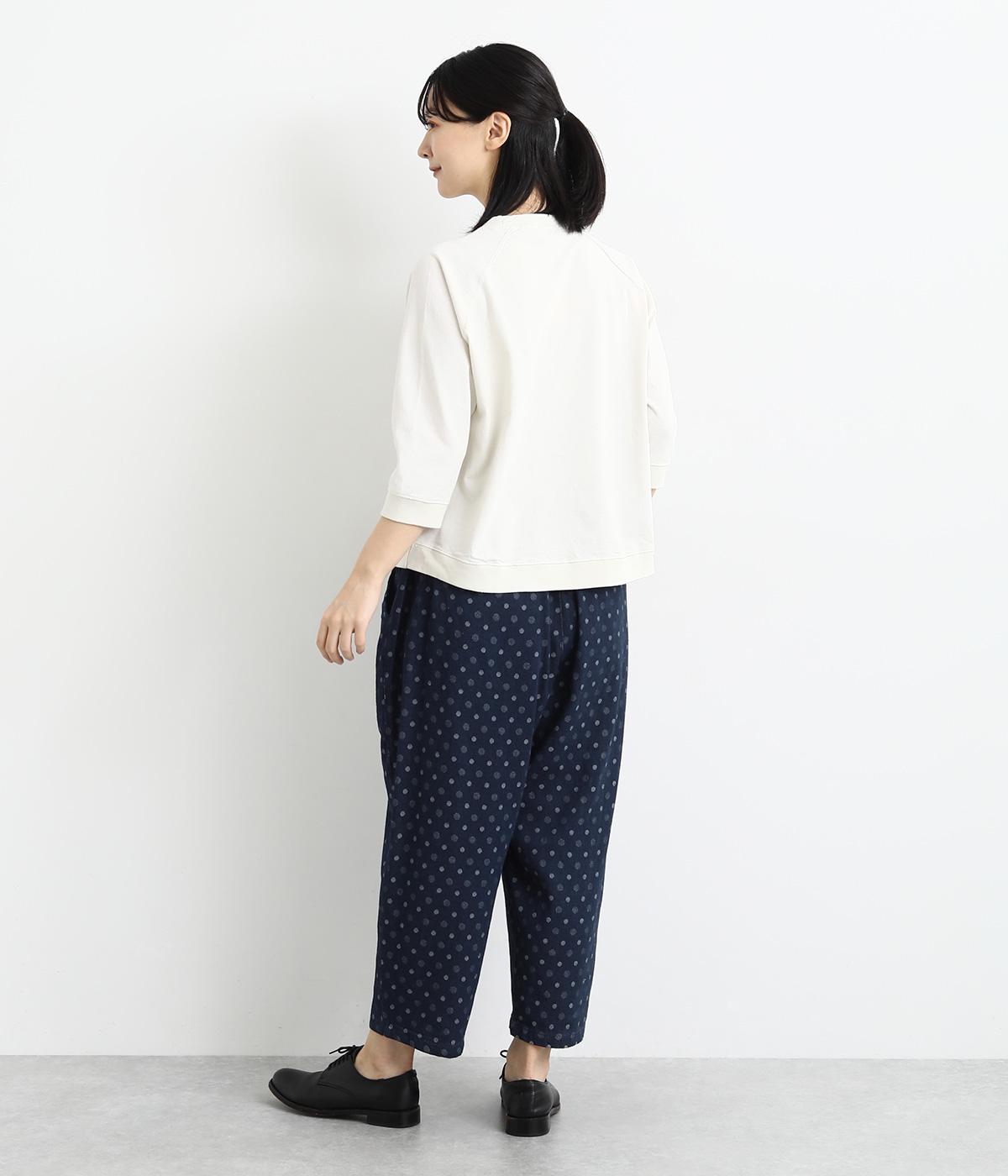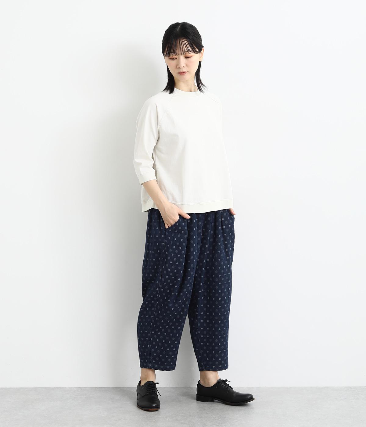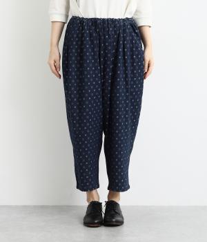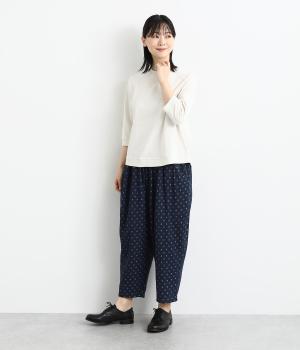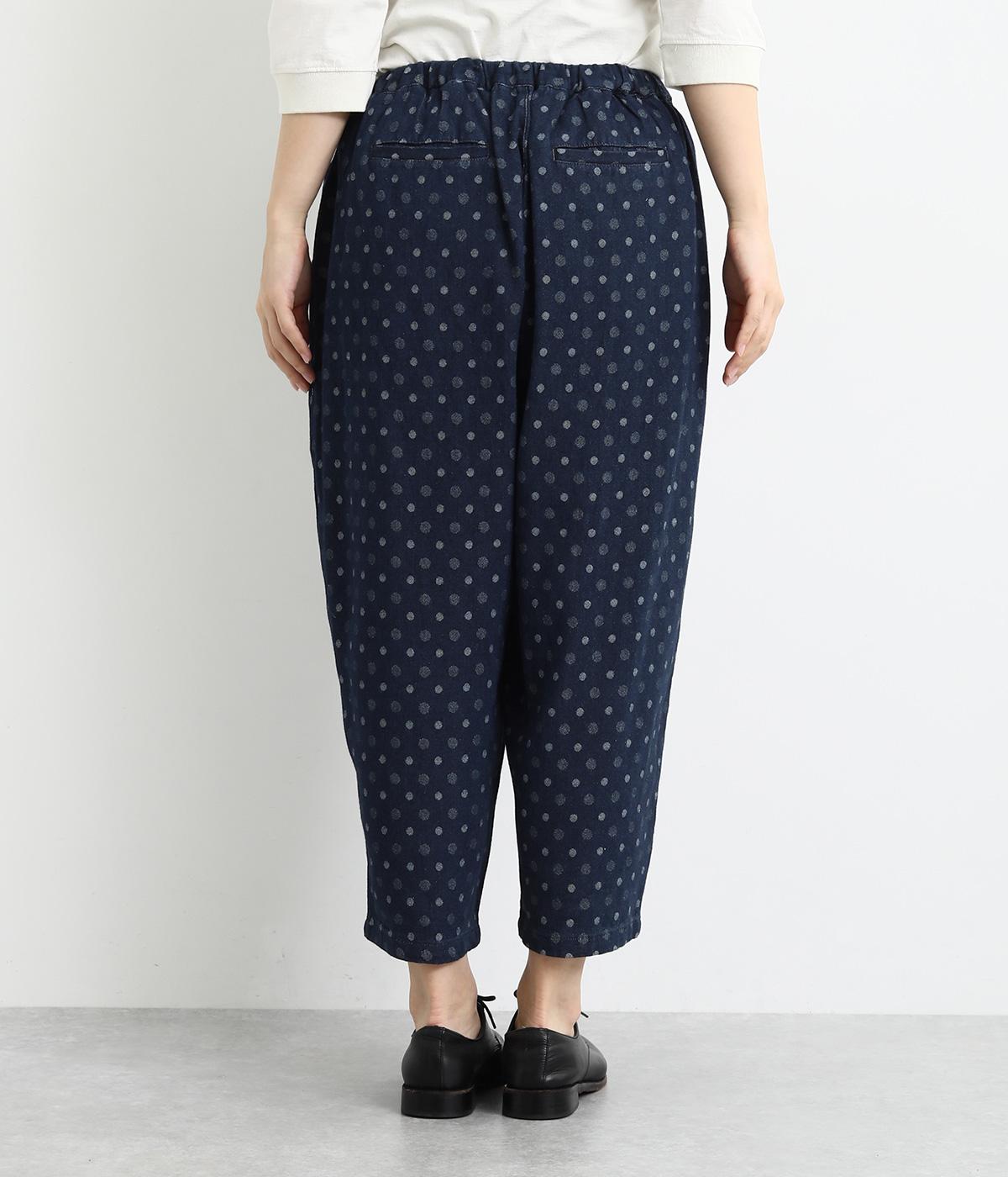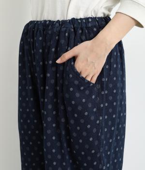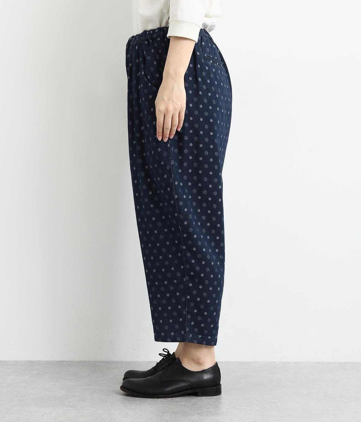 穿きはじめからやさしくなじむ、とてもやわらかな風合いのコットンデニム。ジャカード織りで表現されたドット柄が、さりげなくも目をひくポイントに。通年対応の素材で、一枚あると重宝します。