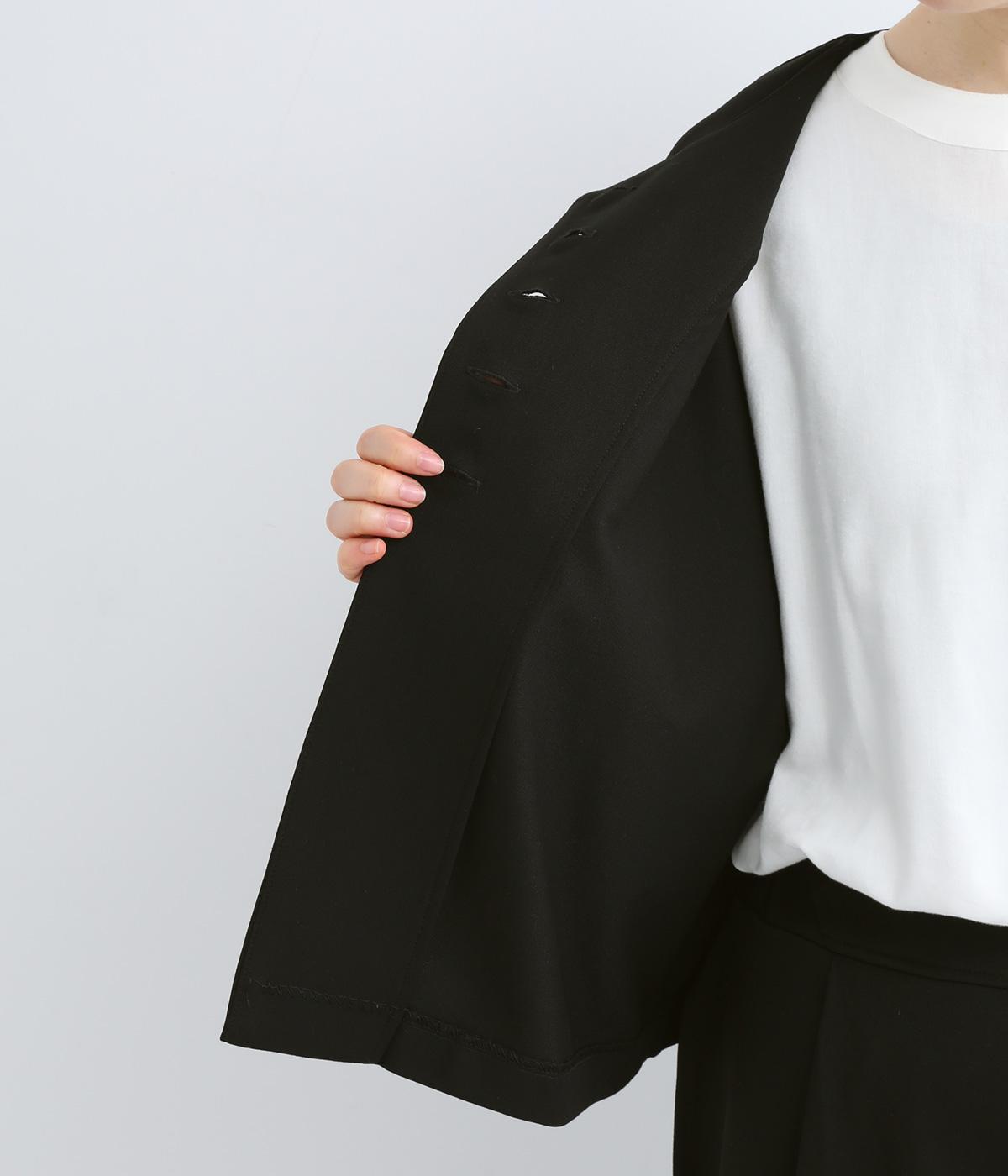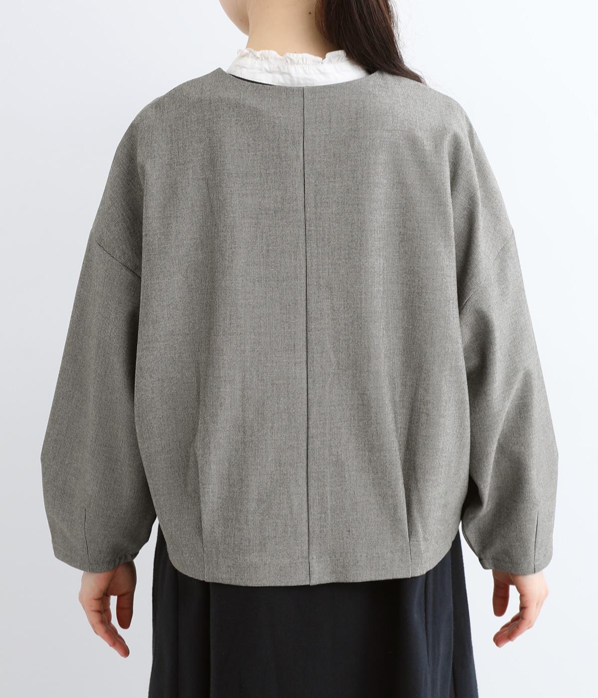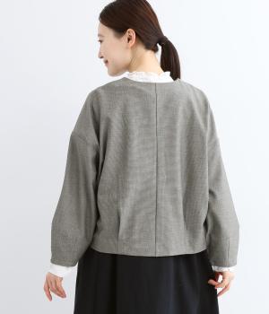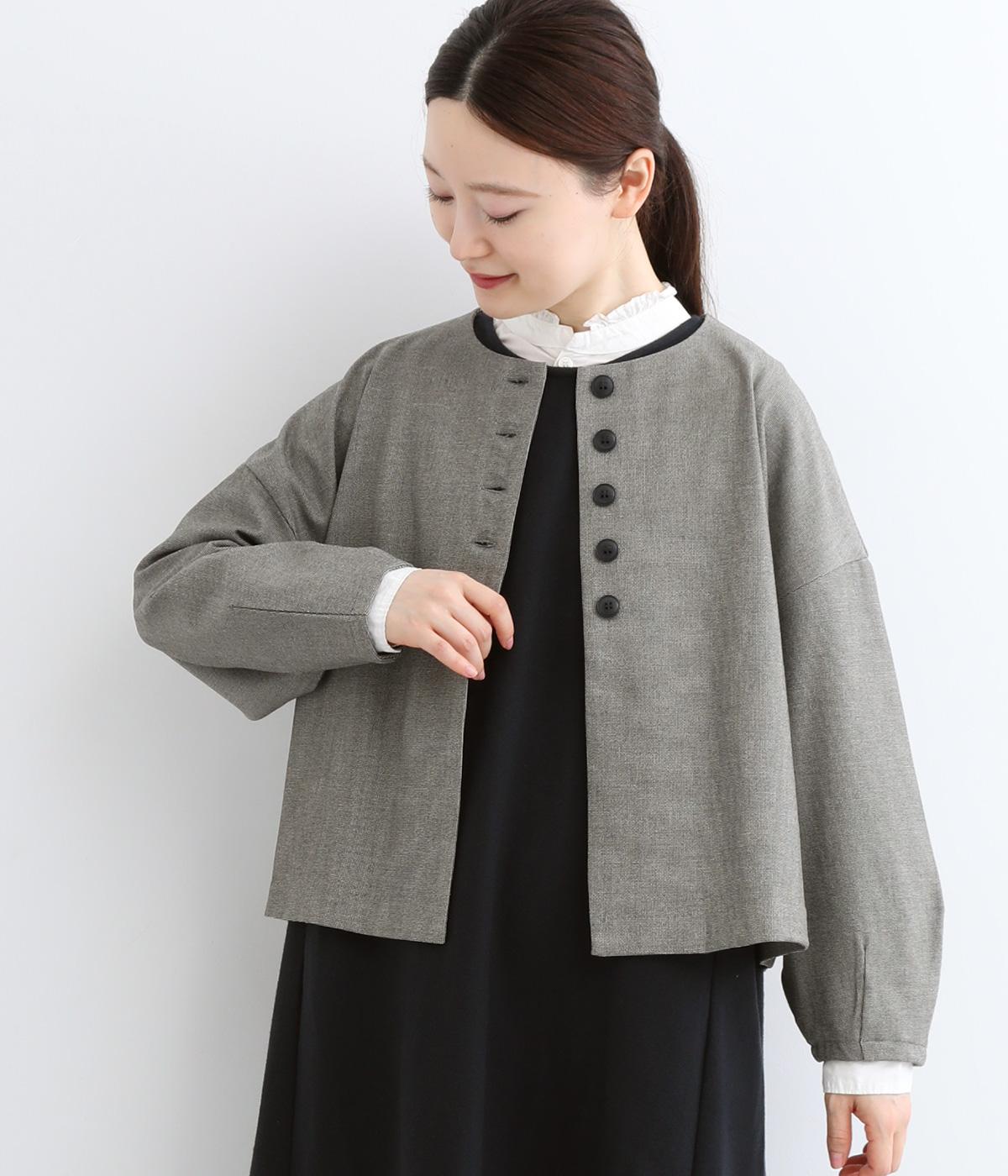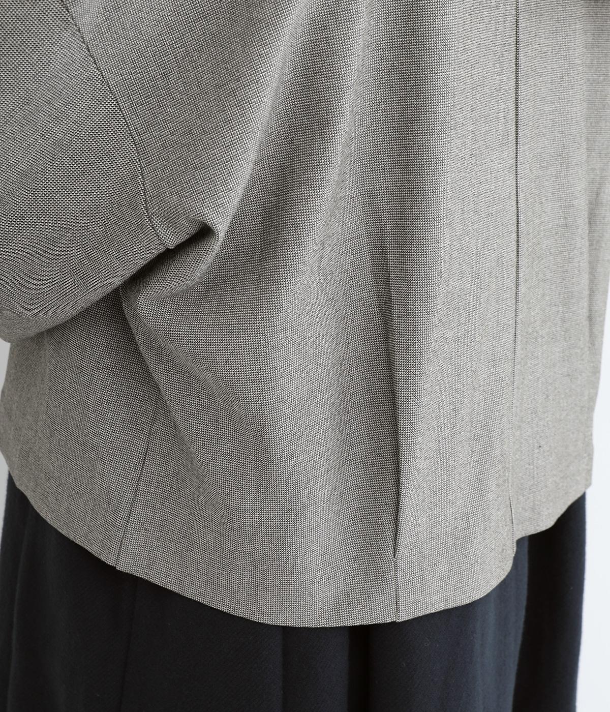 すっきりとしたクルーネックと袖口にダーツを入れてふくらみを持たせた袖のフォルムが上品なジャケット。後ろ裾にはタックを施して、後ろ姿のシルエットをすっきりと仕上げています。視線を上げて着こなしのバランスを整える、上半分に並べたフロントボタンもポイントです。