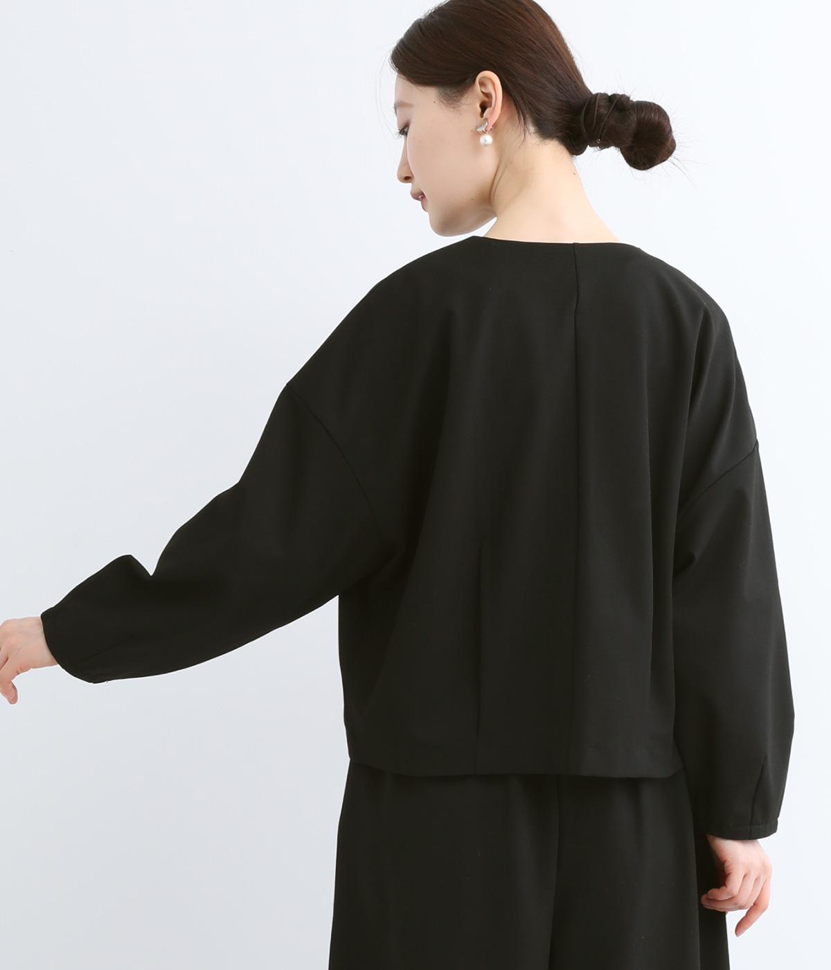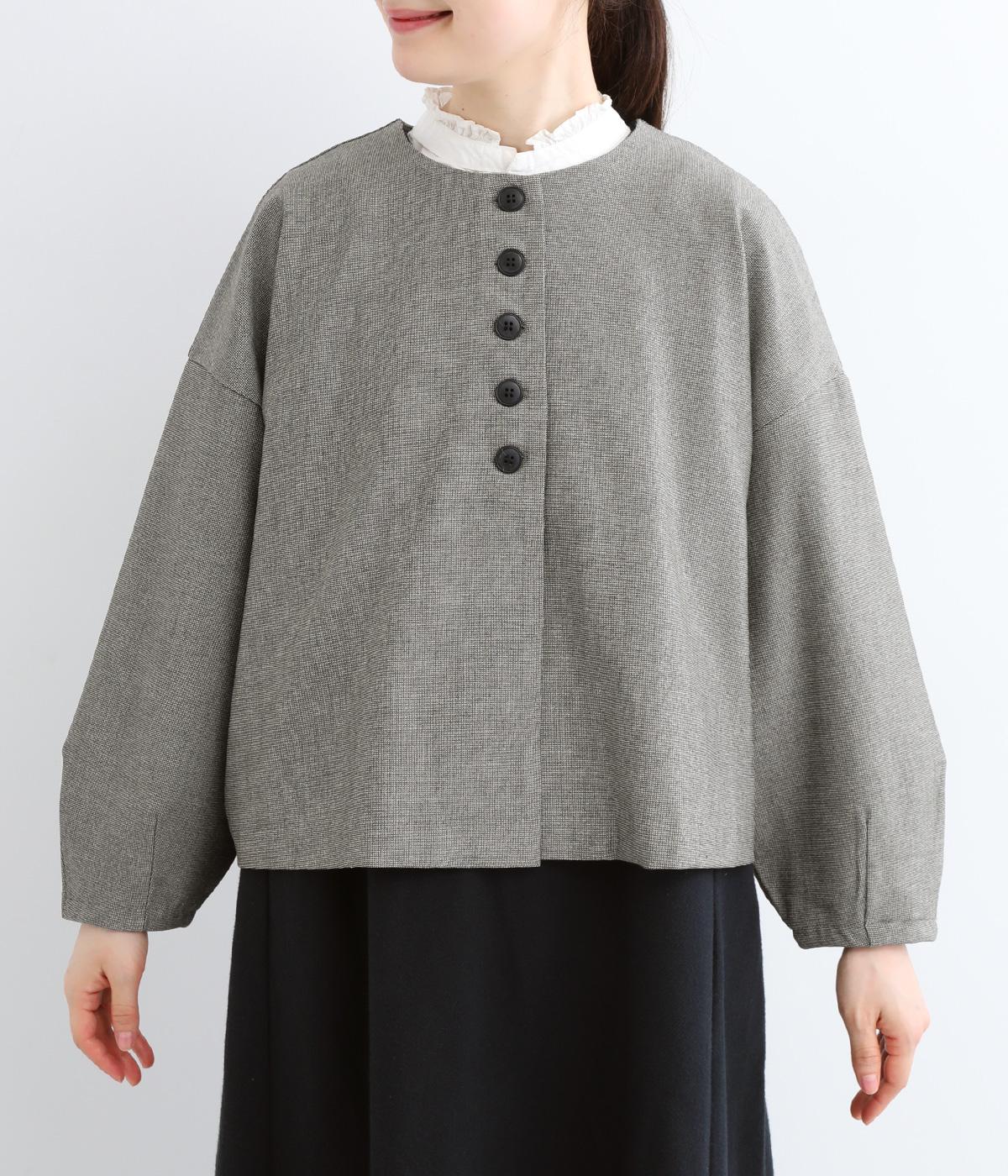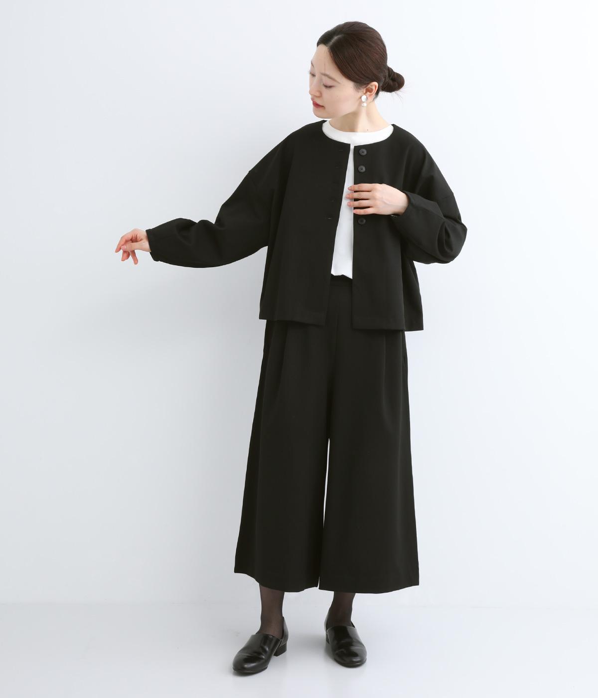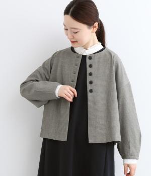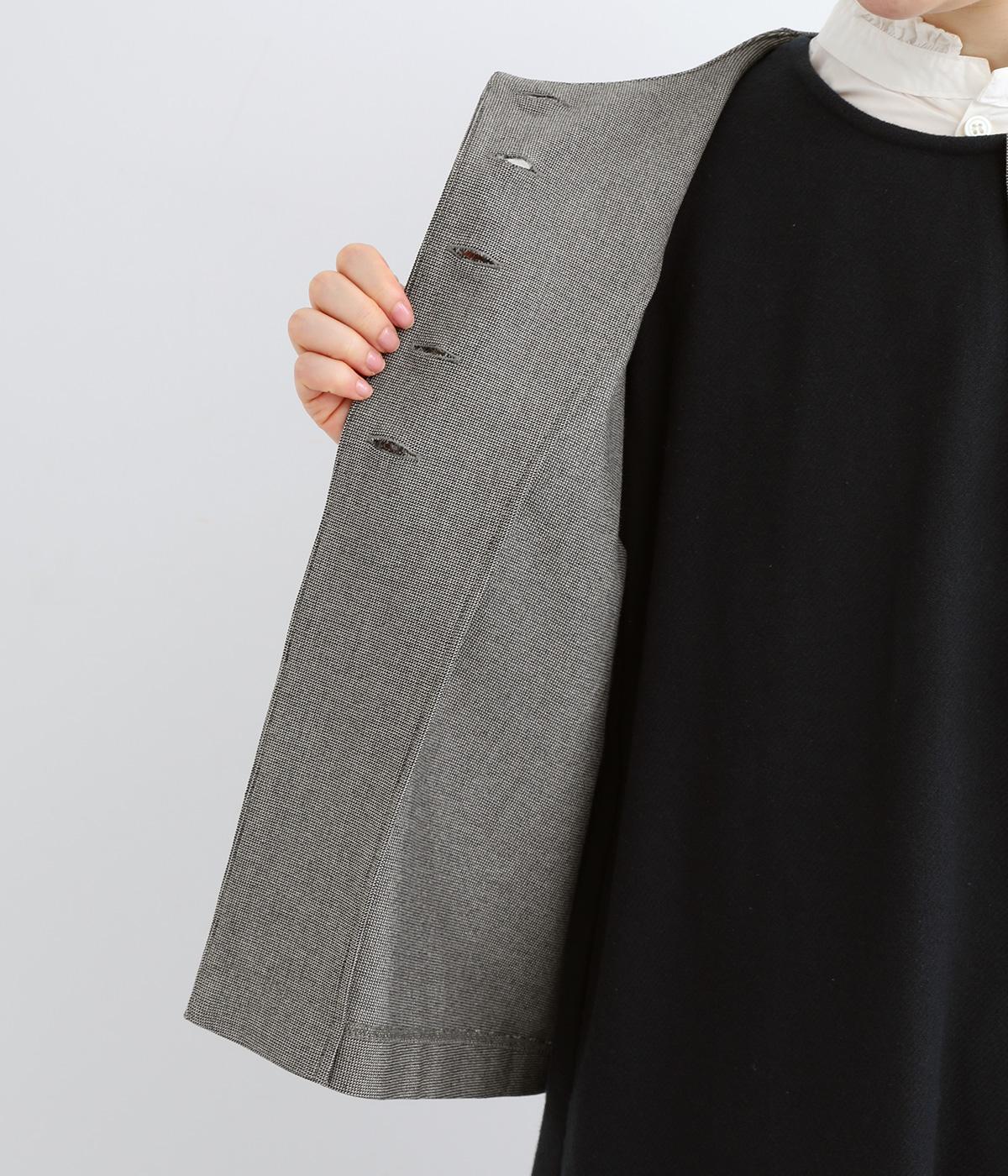 すっきりとしたクルーネックと袖口にダーツを入れてふくらみを持たせた袖のフォルムが上品なジャケット。後ろ裾にはタックを施して、後ろ姿のシルエットをすっきりと仕上げています。視線を上げて着こなしのバランスを整える、上半分に並べたフロントボタンもポイントです。