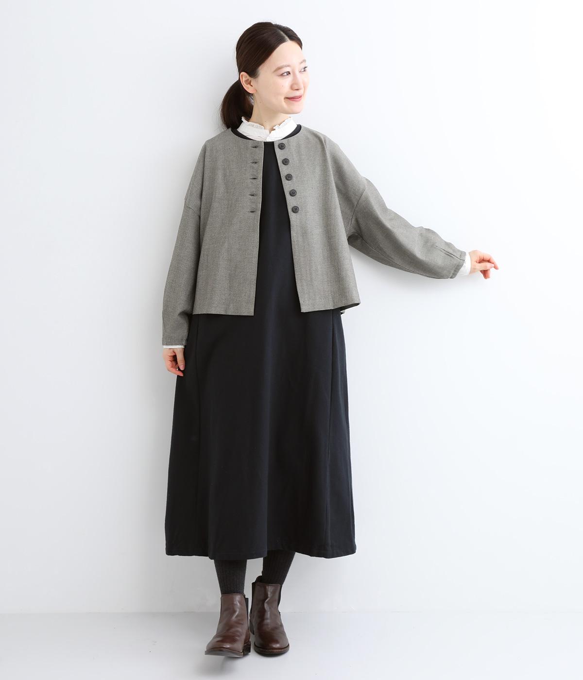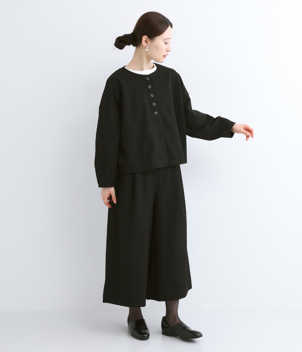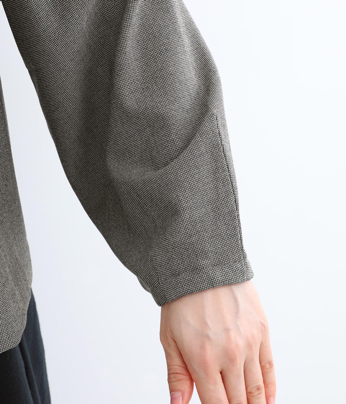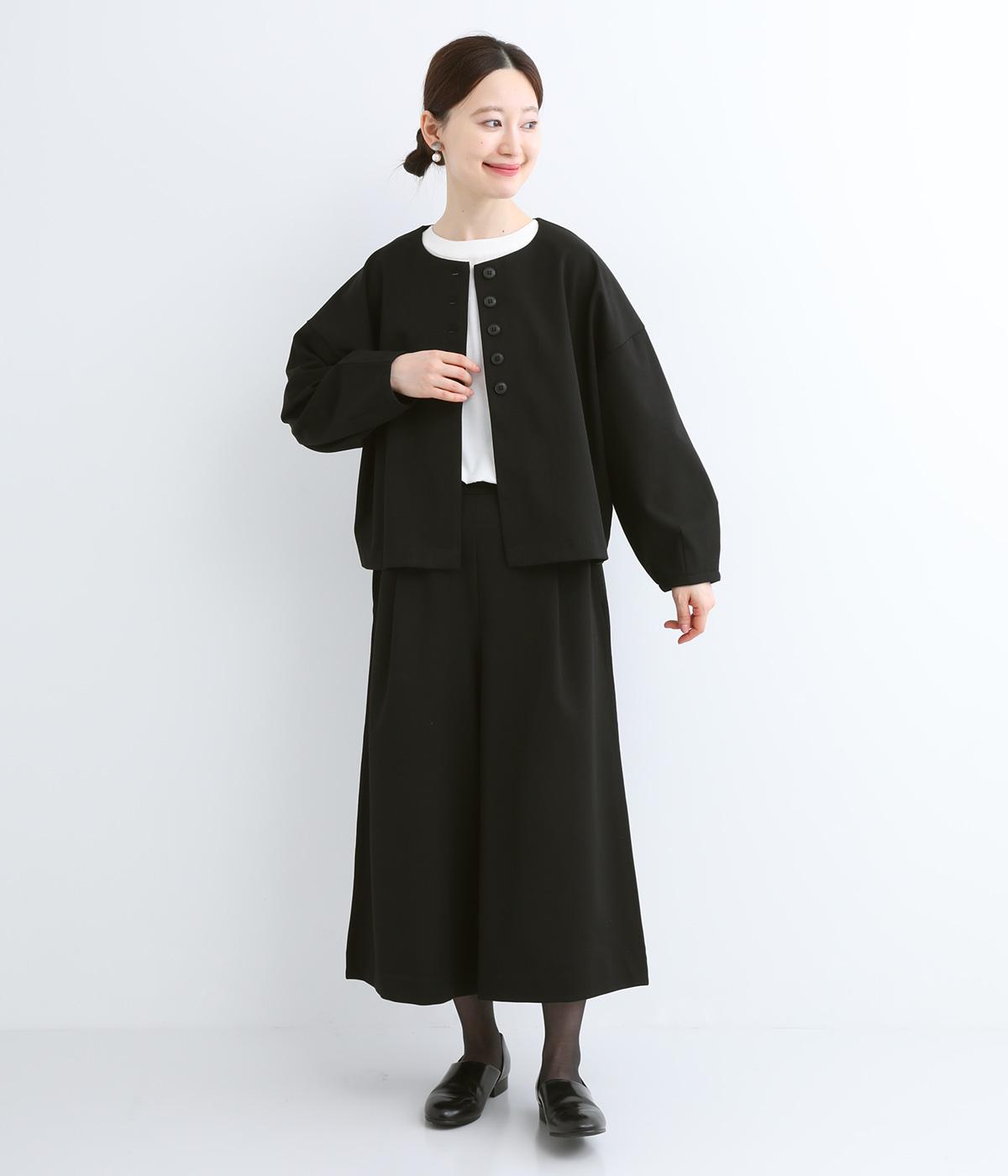 すっきりとしたクルーネックと袖口にダーツを入れてふくらみを持たせた袖のフォルムが上品なジャケット。後ろ裾にはタックを施して、後ろ姿のシルエットをすっきりと仕上げています。視線を上げて着こなしのバランスを整える、上半分に並べたフロントボタンもポイントです。