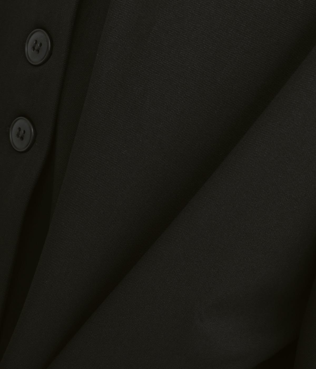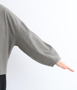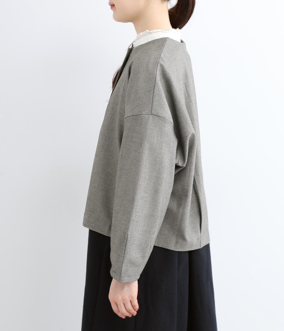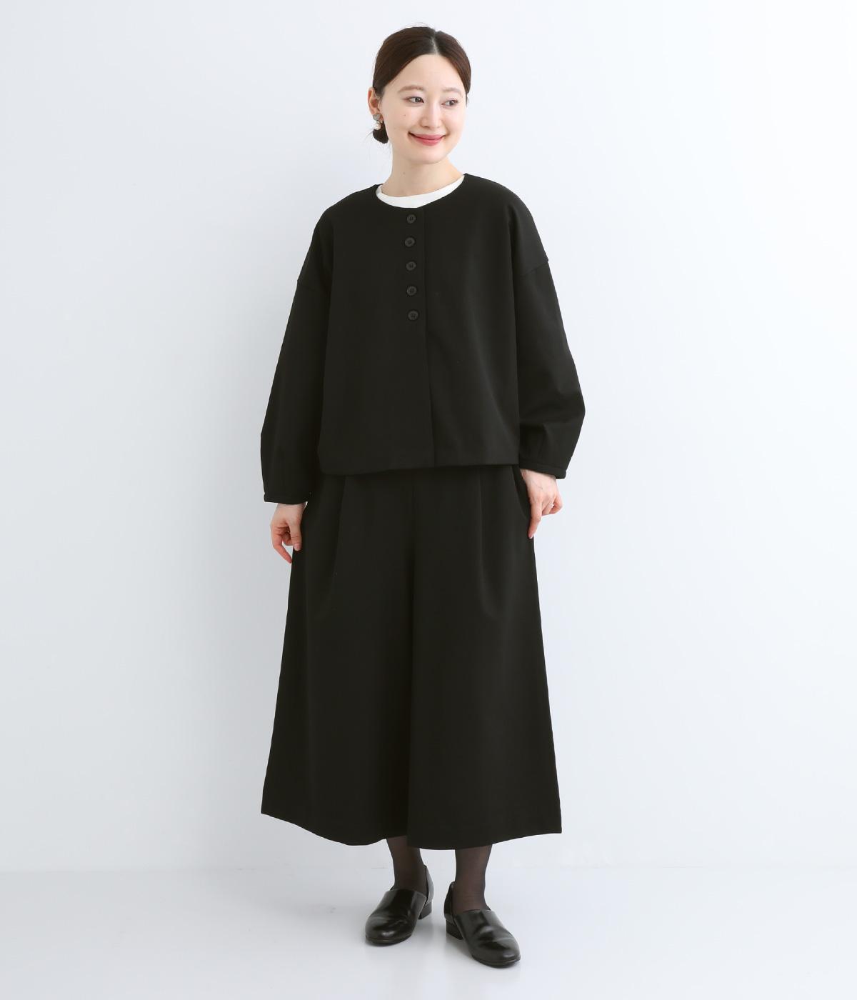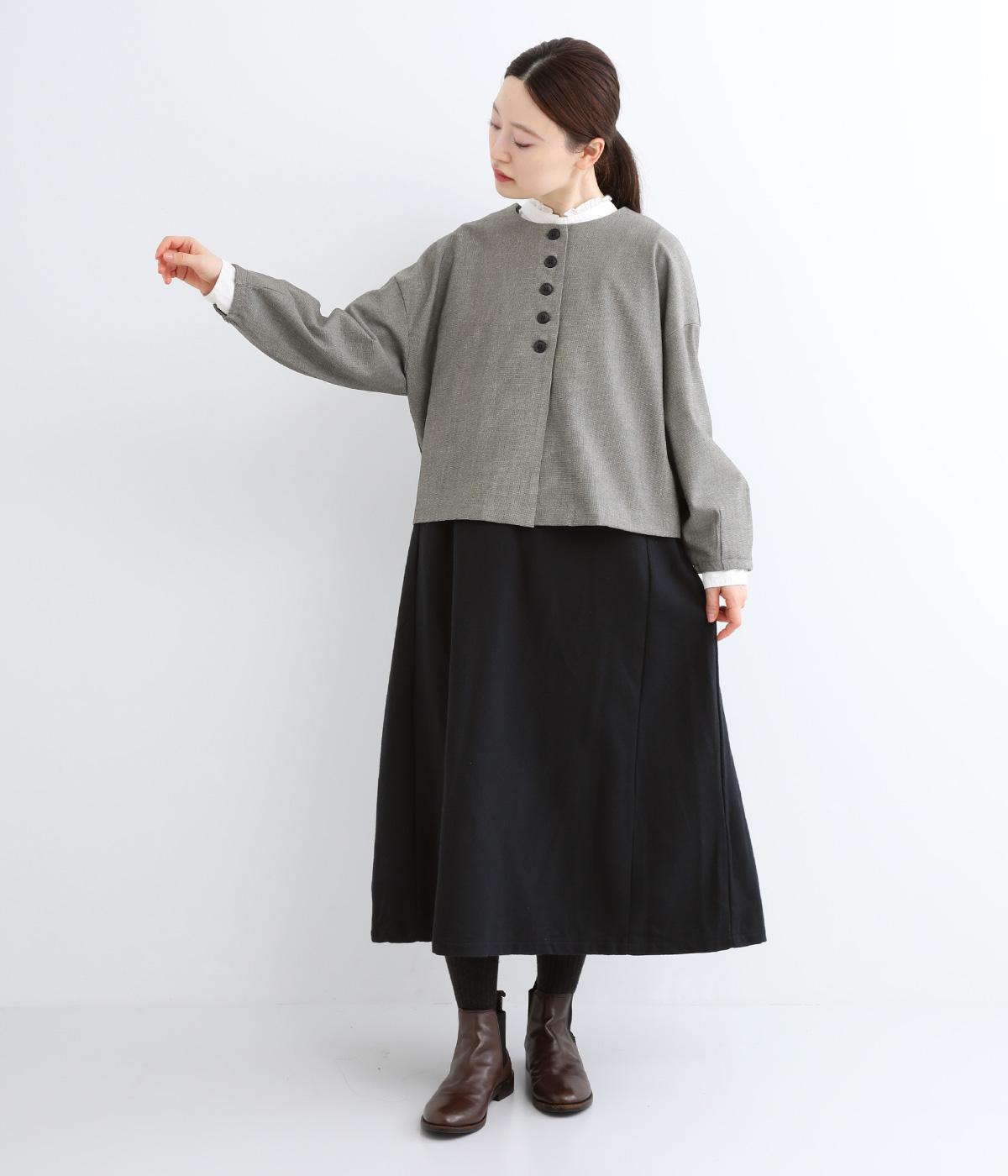 すっきりとしたクルーネックと袖口にダーツを入れてふくらみを持たせた袖のフォルムが上品なジャケット。後ろ裾にはタックを施して、後ろ姿のシルエットをすっきりと仕上げています。視線を上げて着こなしのバランスを整える、上半分に並べたフロントボタンもポイントです。