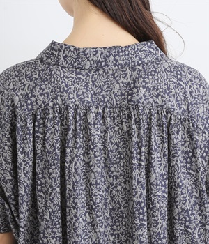 シックなネイビー×グレーの組み合わせ。肩に施したギャザーが立体的なシルエットや、美しい落ち感を際立たせます。