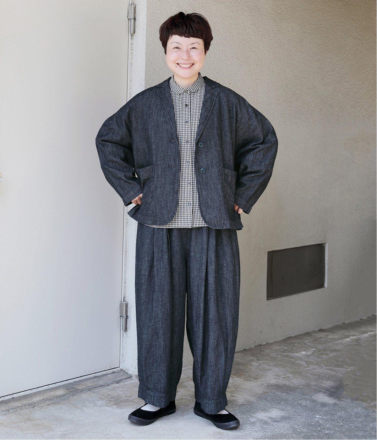 きちんと感のあるベーシックなテーラードカラージャケットをデニム素材でほどよくカジュアルダウンさせました。身幅や袖幅にややゆとりをもたせているのも◎。袖口を折り返してインナーアイテムをちらりと見せた着こなしもおすすめです。